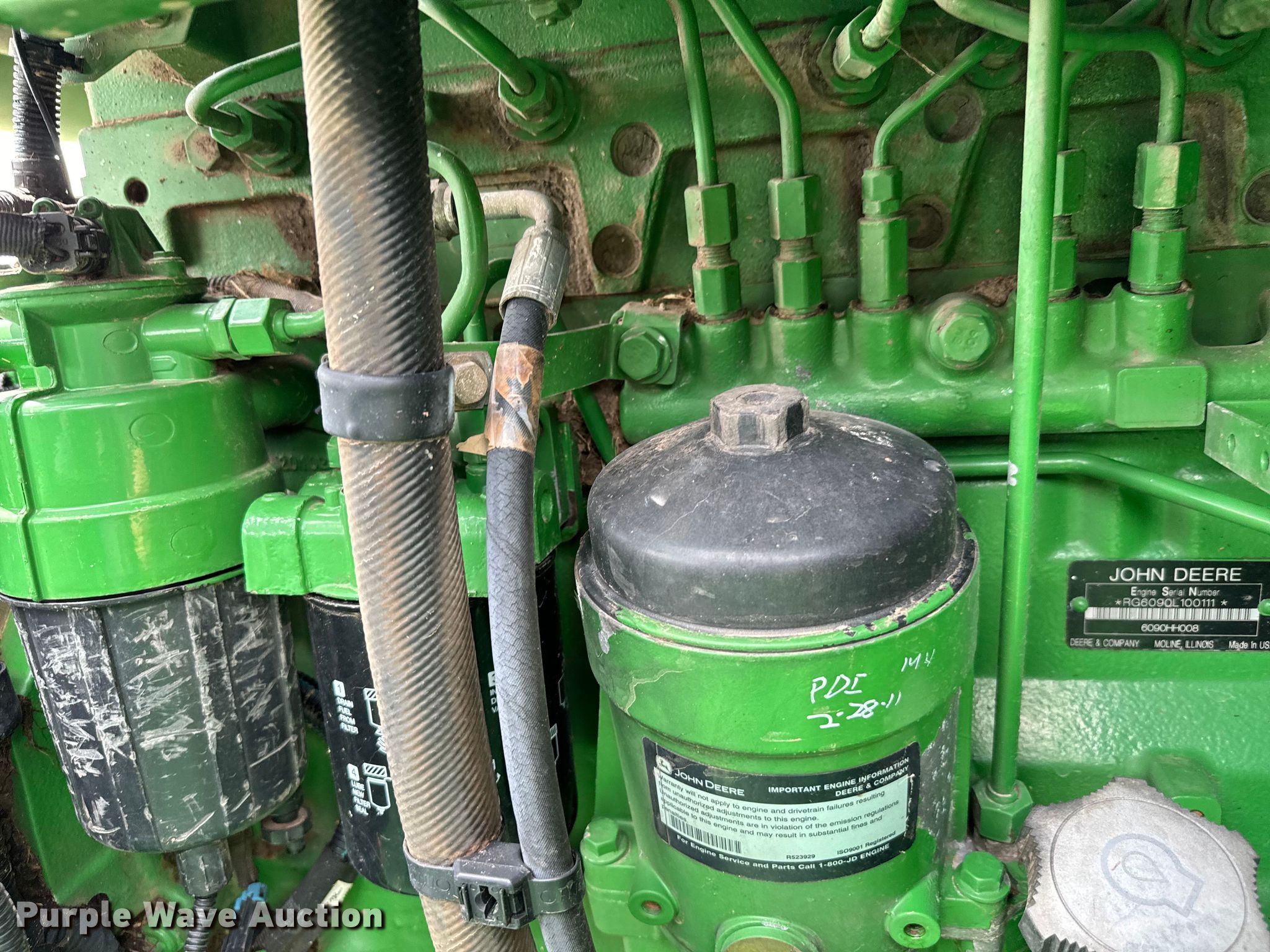 2011 John Deere 9770 STS RWA combine. Engine hours: 2,982 on meter, Separator hours: 2,200 on meter, Serial: 1H09770STB0741551. Engine John Deere, Serial: RG6090L100111, Cylinders: 6, Fuel type: Diesel. Transmission Hydrostatic. Interior AC, Heat. Features Feederhouse: Reverser, Power tailboard, Bin: Extensions. Tires Front: 520/85R42, Rear: 28L-26, Front duals. JKT Farms. 1138 Hyde Lake Road. Bennington, OK 74723