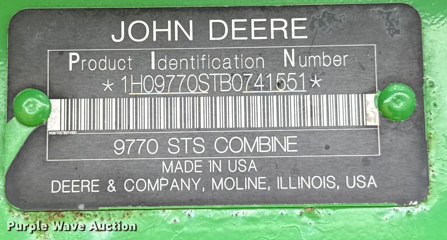 Purple Wave is selling a used Combine in Oklahoma. This item is a 2011 John Deere 9770 STS RWA combine with the following: Engine hours: 2,982 on meter, Separator hours: 2,200 on meter, Serial: 1H09770STB0741551