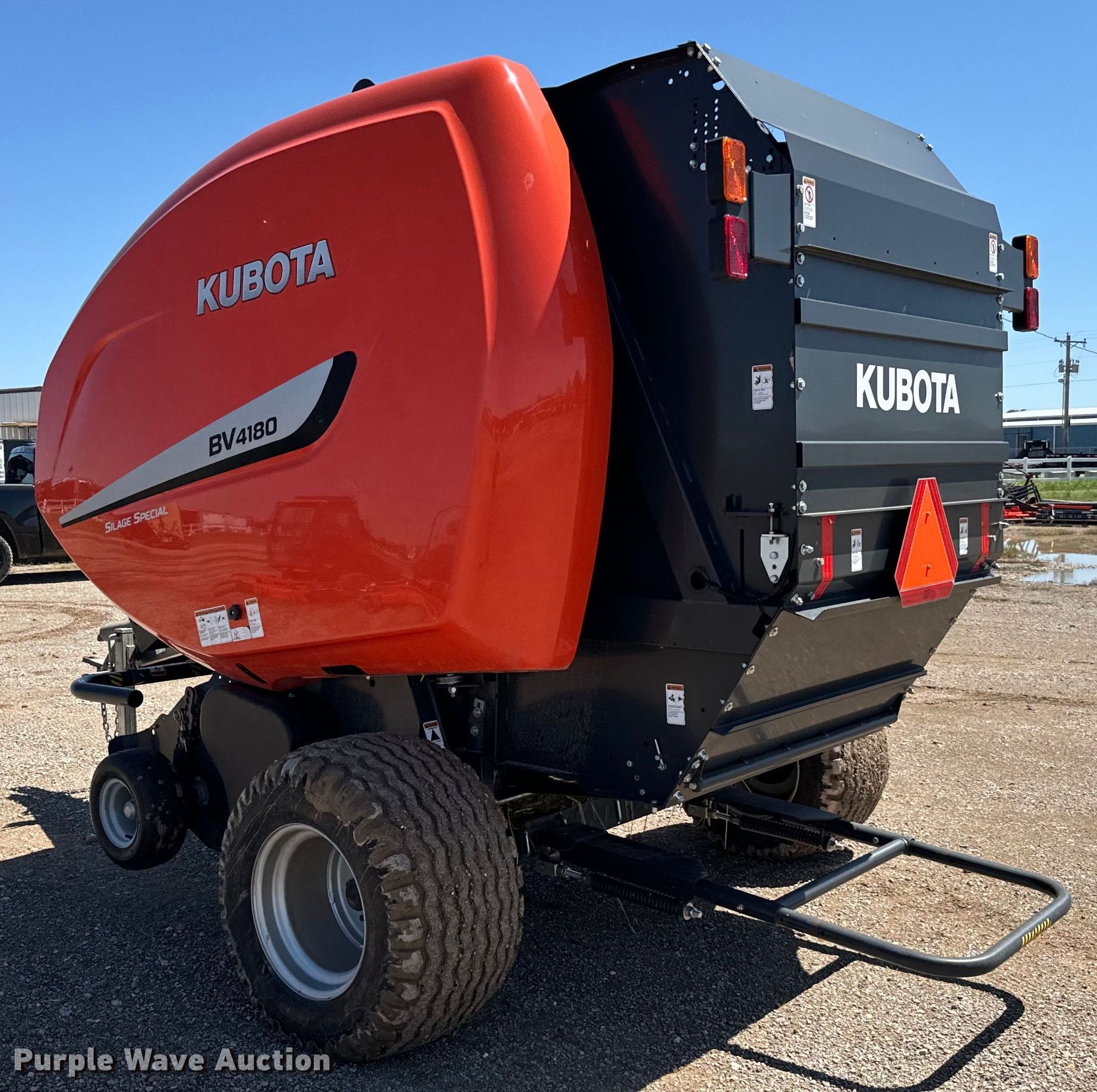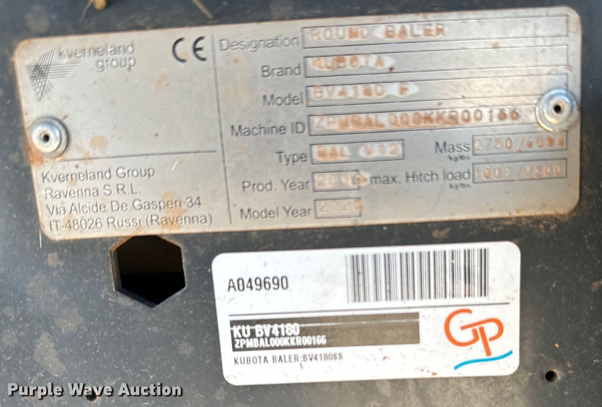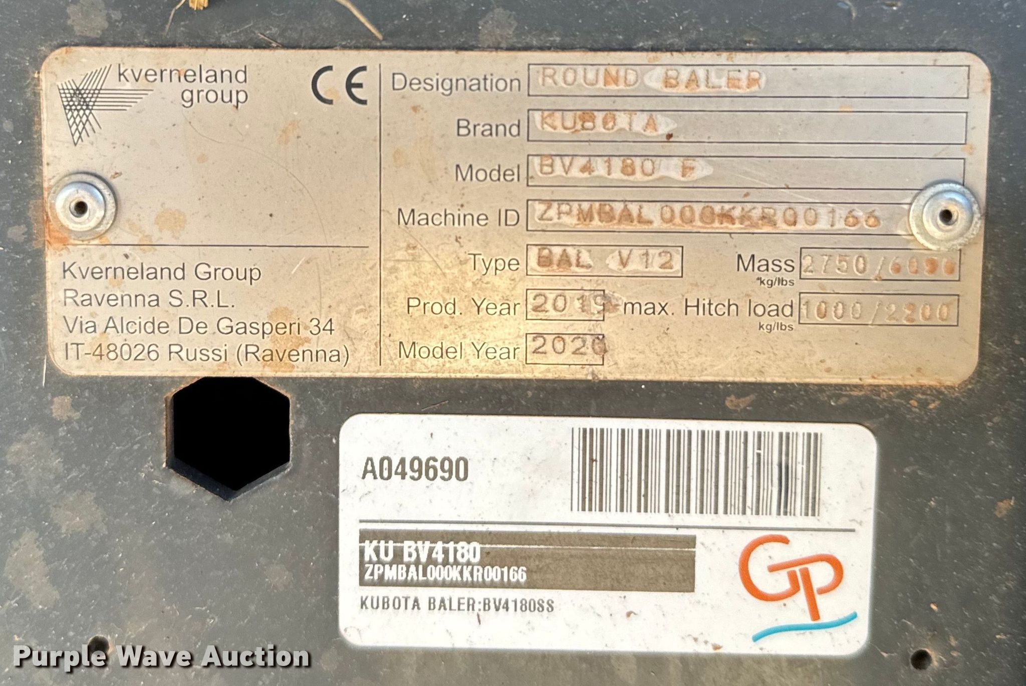 Purple Wave is selling a used Round Baler in Oklahoma. This item is a 2020 Kubota BV4180 round baler with the following: Bale count: 3,976, Serial: ZPMBAL000KKR00166, Unit #: A049690