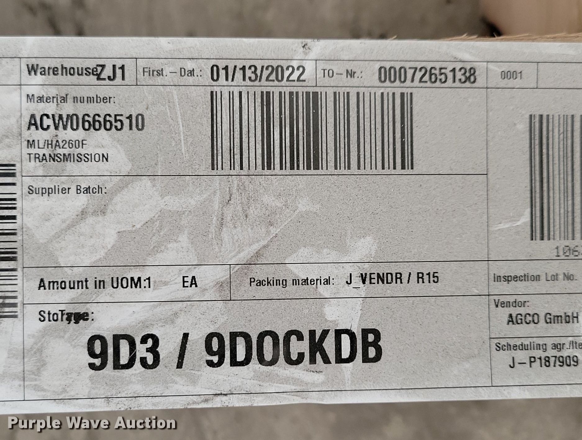 Purple Wave is selling a used Ag Tractor Loader or Attach. in Minnesota. This item is a Fendt drive train with the following: Serial: ACW0666510, Rear differential, Transmission, Fits Massey Ferguson, Unused