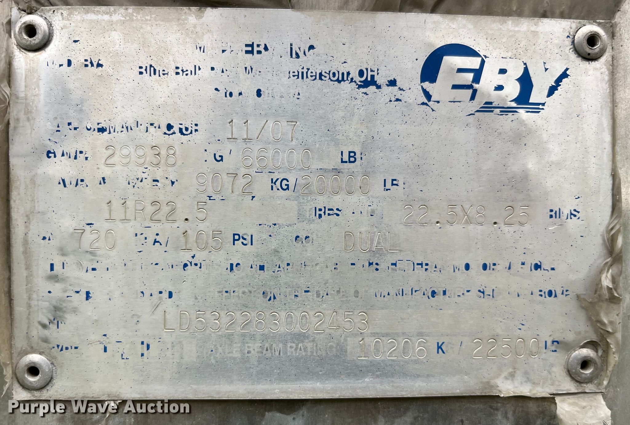 2008 EBY livestock trailer. VIN: 4A2LD532283002453. Dimensions Body: 53' L x 102" W. Features Decks: Two, Center gates: 4. Chassis Landing gear: Dual, Suspension: Air, Brakes: Air, Axles: Spread, GVWR: 66,000 lbs, GAWR: 20,000 lbs. Tires Steel wheels, Size: 11R22.5. Iowa title. Title distribution may be delayed up to 30 days from verification of funds. Seaboard Foods. Bloomfield, IA 52537