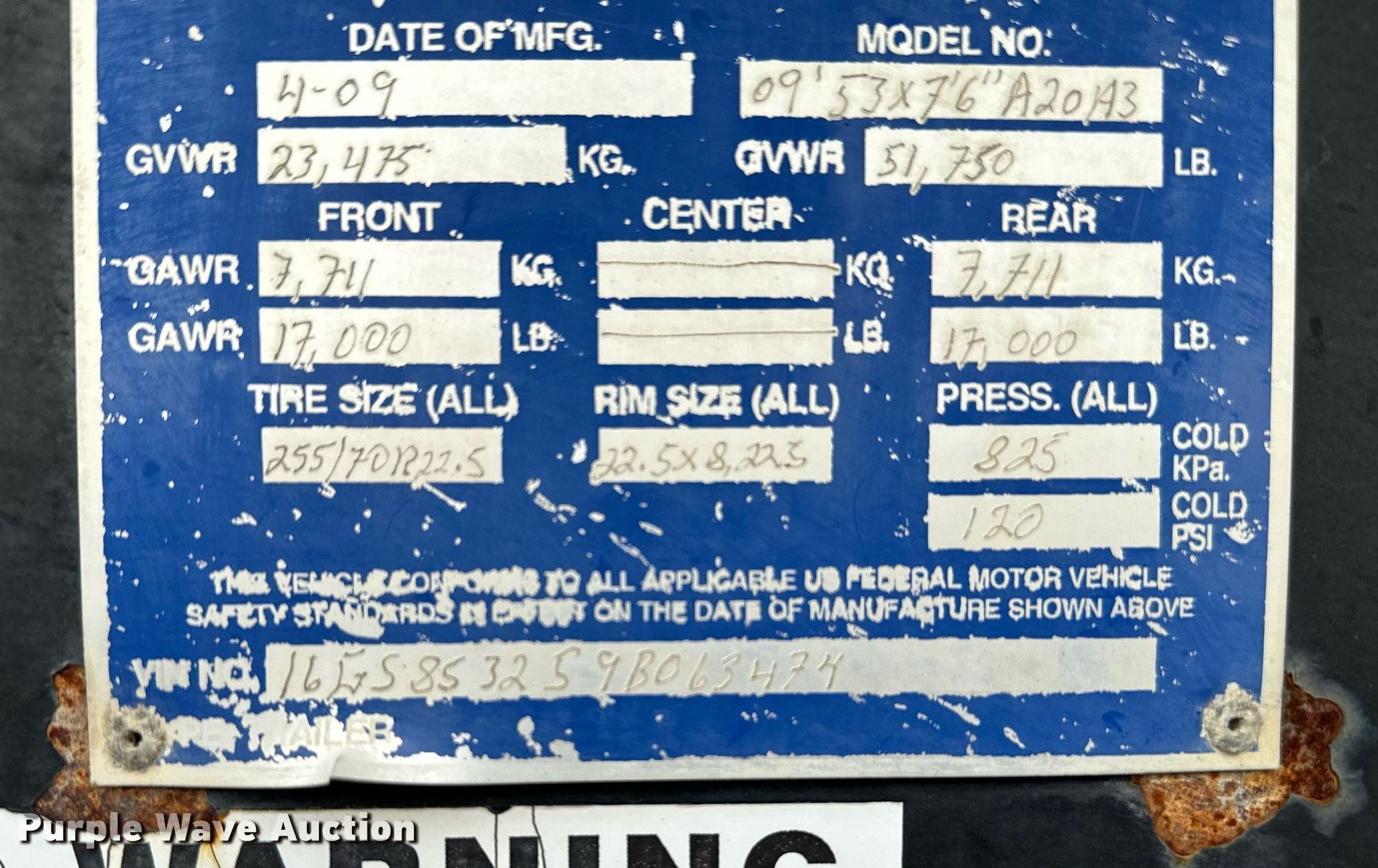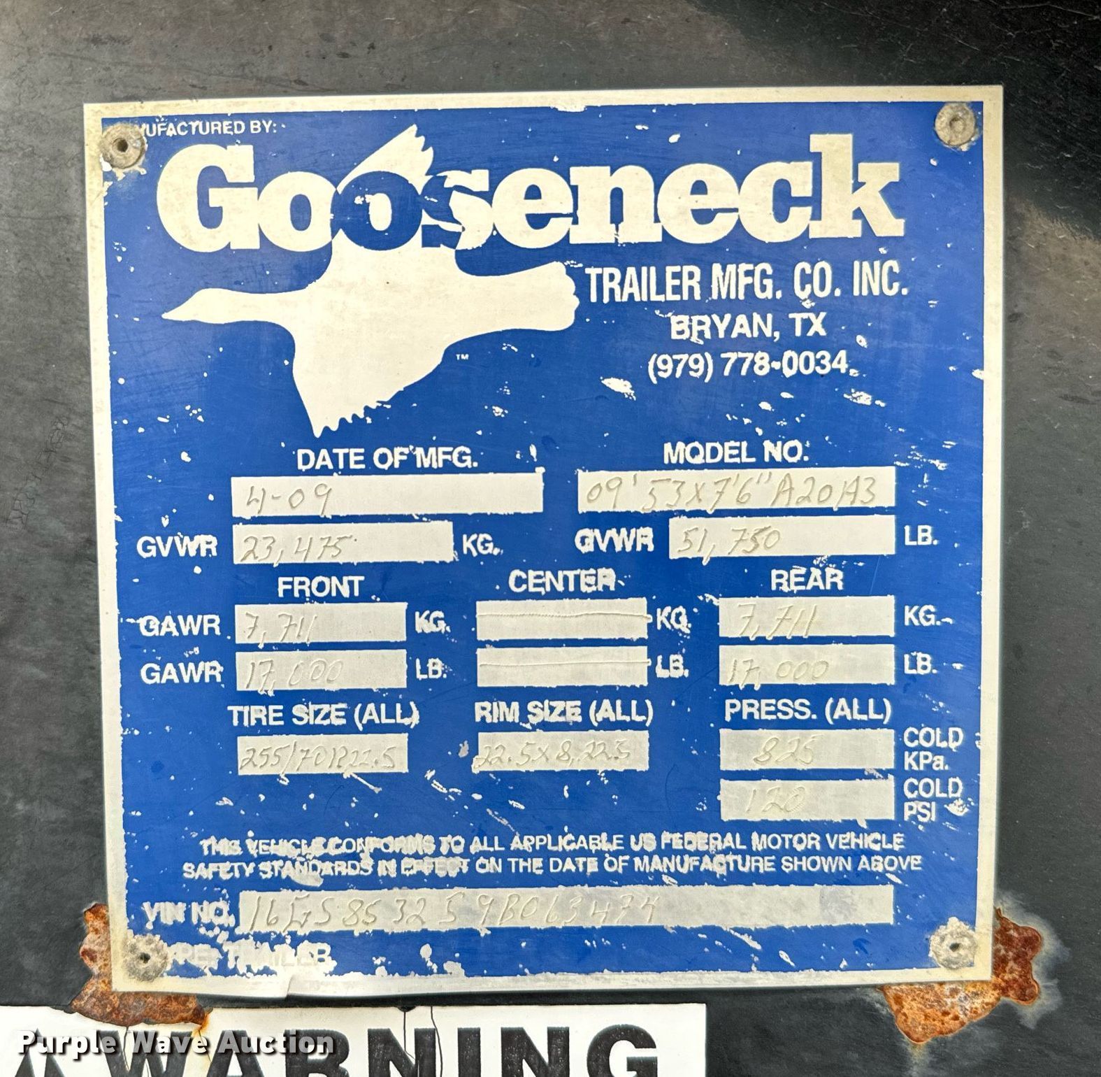 2009 Gooseneck Trailers livestock trailer. VIN: 16GS853259B063474. Dimensions Overall: 53' L x 7' 6" W. Features Center gates: 3, Ground load. Chassis Landing gear: Dual, Suspension: Air, Brakes: Air, Axles: Tandem, GVWR: 23,475 lbs. Tires Size: 255/70R22.5. Transfer of ownership documentation will be a bill of sale. C & C Contracting Services, Inc.. 90 OK-110. Davis, OK 73030