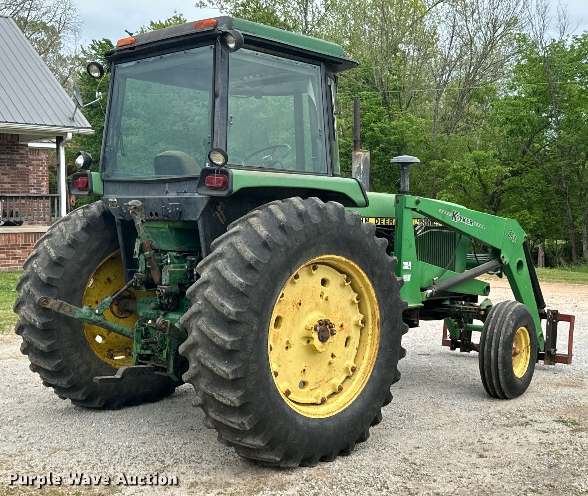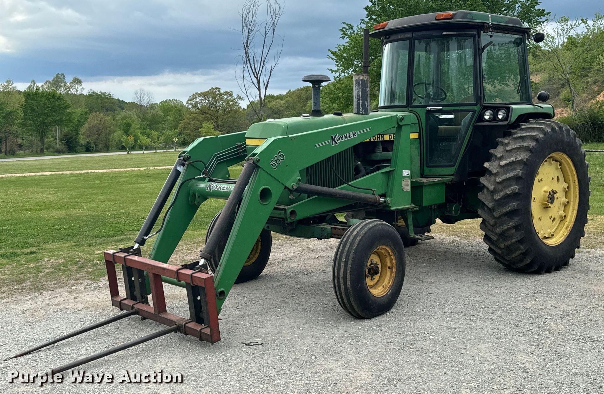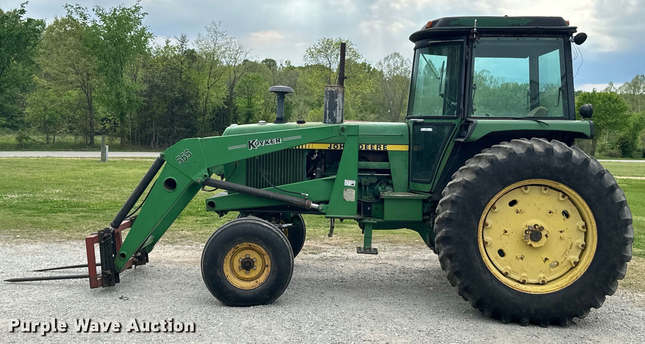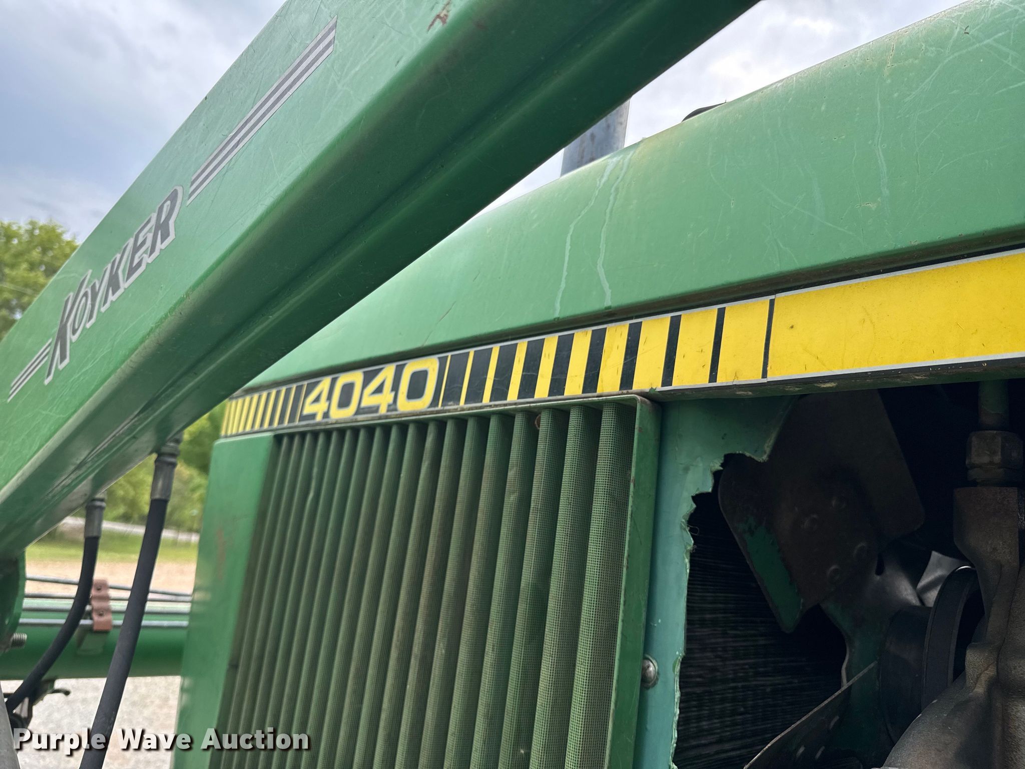 1979 John Deere 4040 tractor. Hours: Unknown, Serial: 005474R. Engine Cylinders: 6, Fuel type: Diesel. Transmission Quad-range, 16F - 6R. Operators station AC, heat. Features PTO: 540, 1000, Three point Top link, Seven pin outlet, Hydraulic remote sets Rear: 2, Loader Koyker 565, Bale spear, Controls: Joystick. Tires Front: 10.00-16, Rear: 18.4-38. Jay, OK 74346
