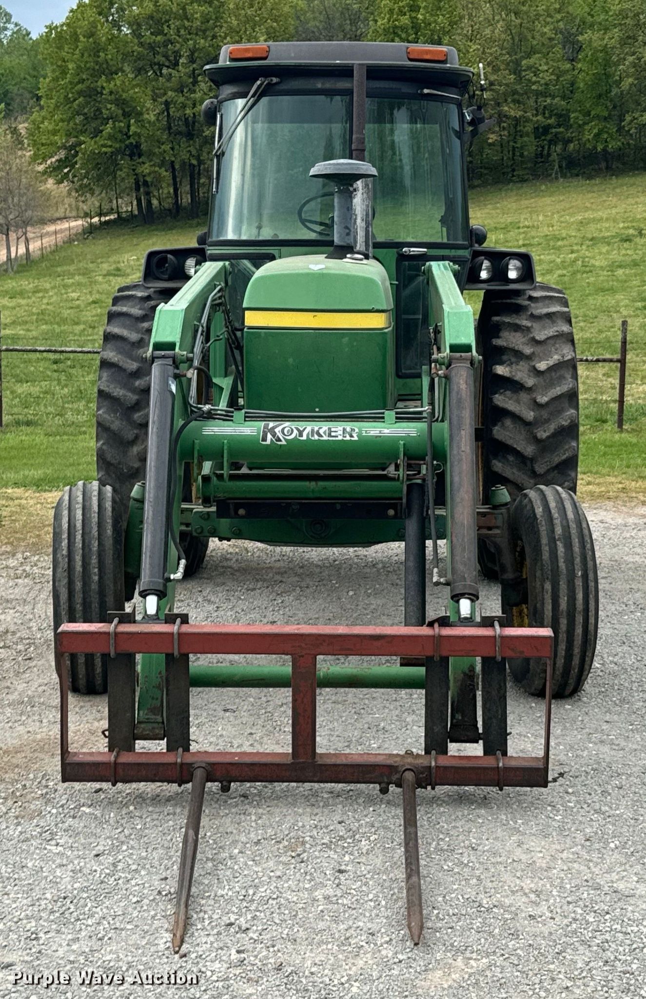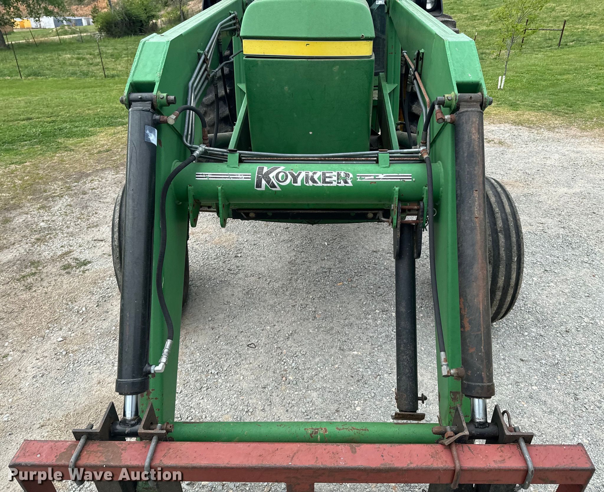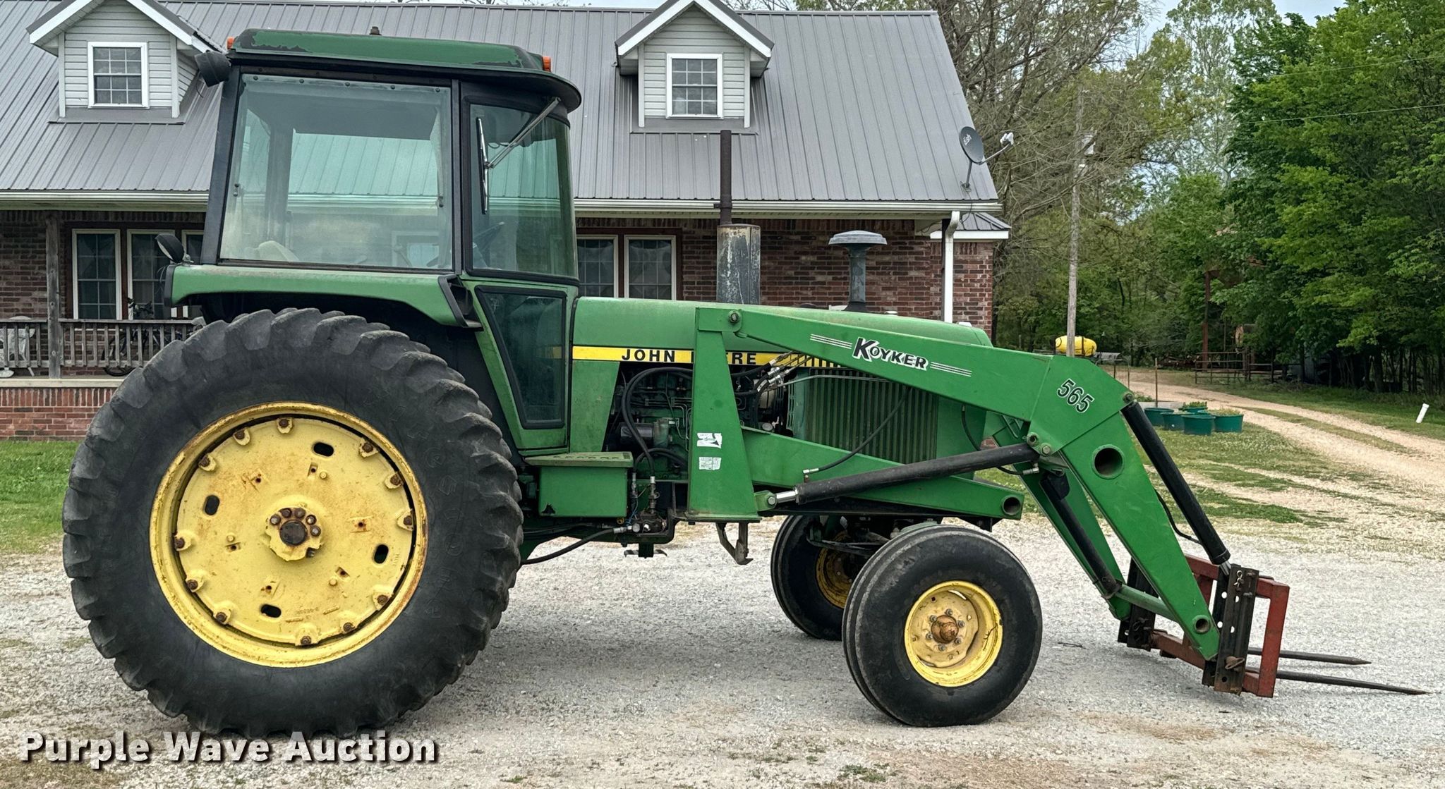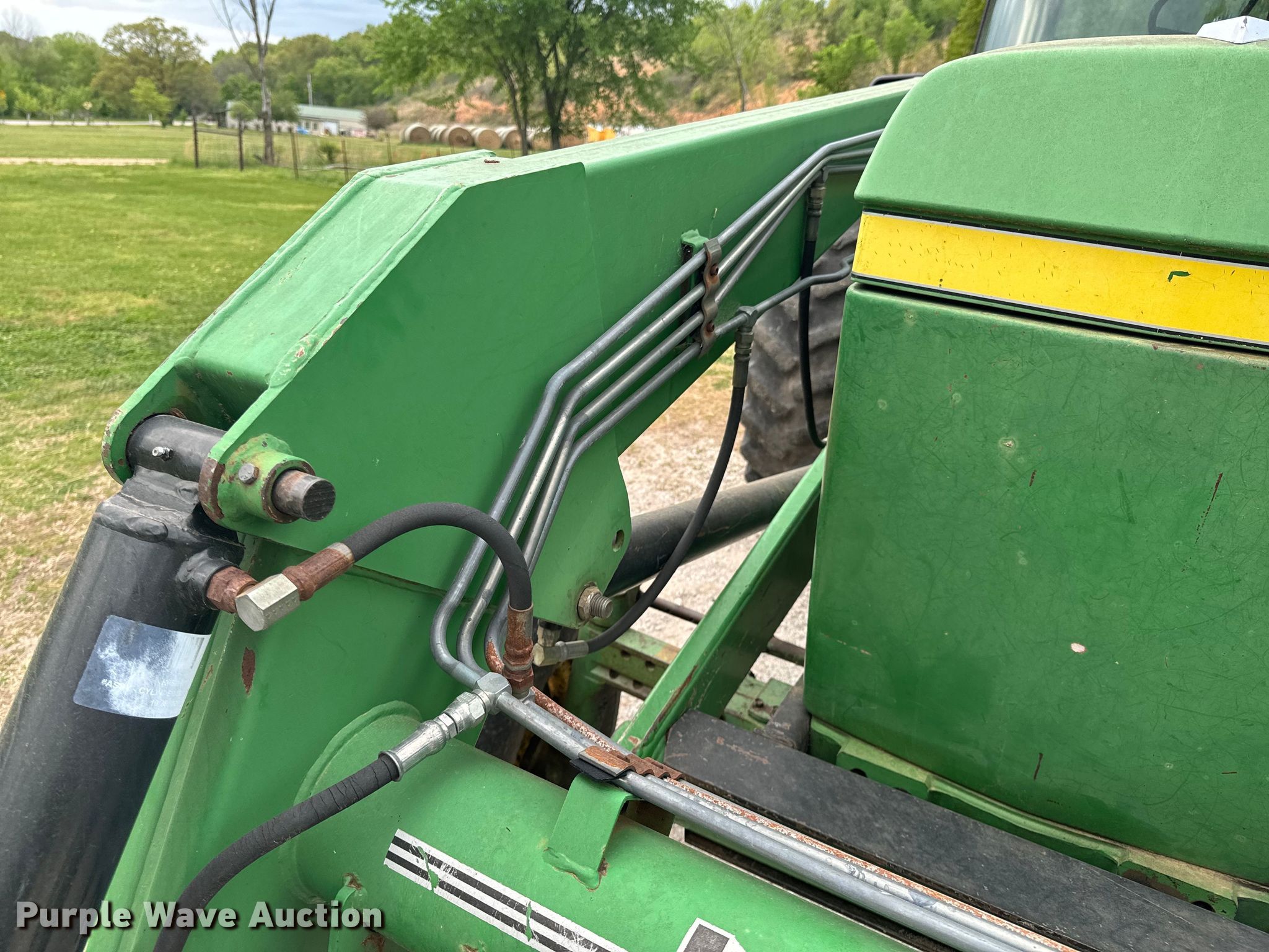 1979 John Deere 4040 tractor. Hours: Unknown, Serial: 005474R. Engine Cylinders: 6, Fuel type: Diesel. Transmission Quad-range, 16F - 6R. Operators station AC, heat. Features PTO: 540, 1000, Three point Top link, Seven pin outlet, Hydraulic remote sets Rear: 2, Loader Koyker 565, Bale spear, Controls: Joystick. Tires Front: 10.00-16, Rear: 18.4-38. Jay, OK 74346