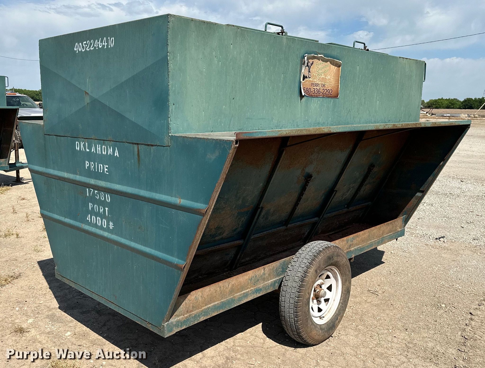 Oklahoma Pride creep feeder. Serial: 1535669. Features Capacity: 175 bushels, Hitch: pin. Tires Size: 225/75D15. Farmers Coop. Ponca City , OK 74601