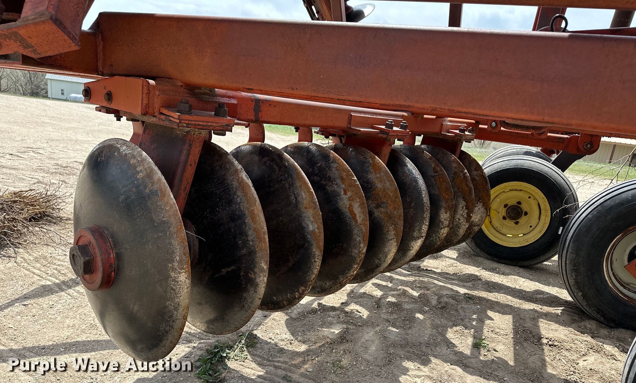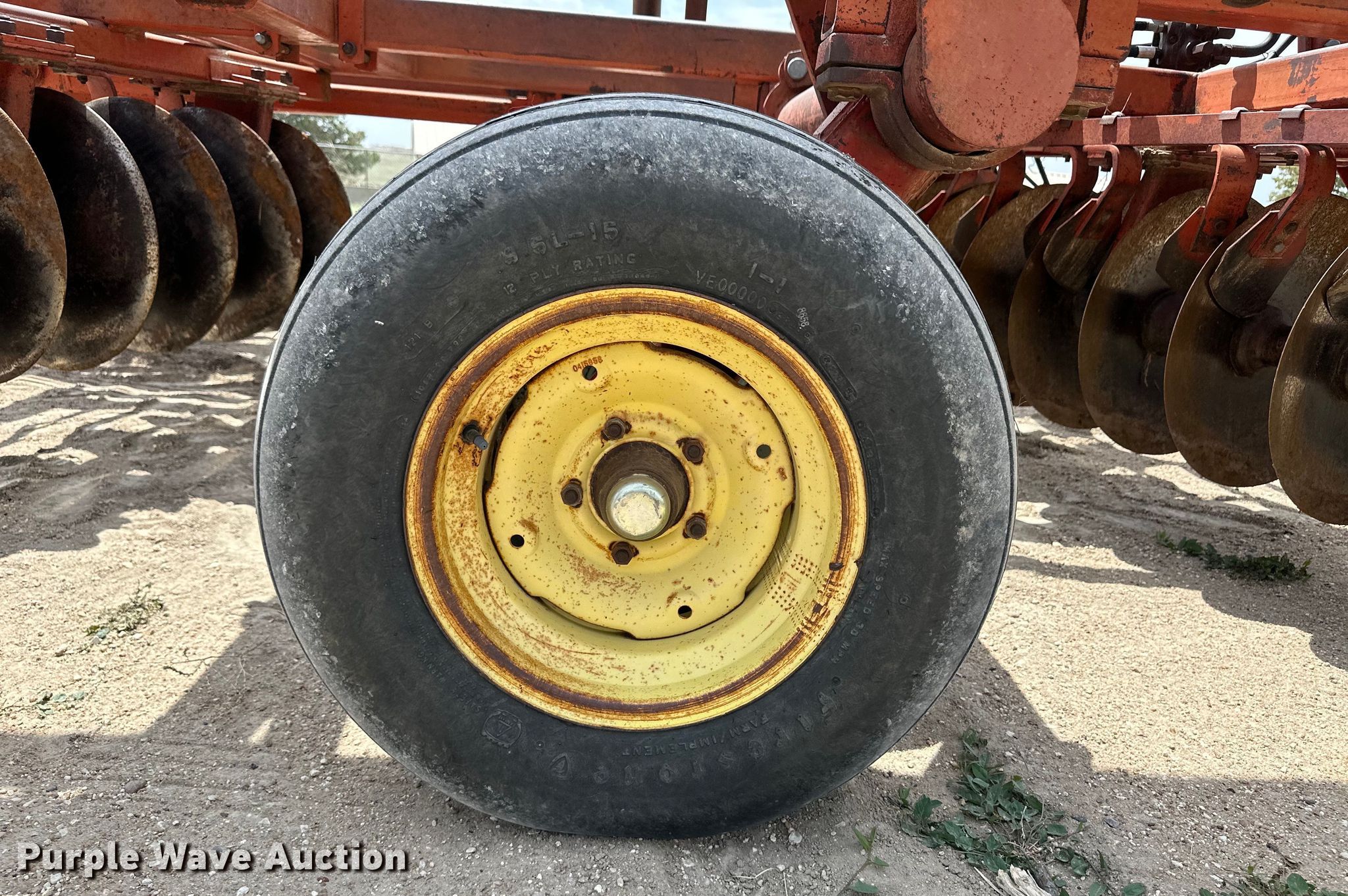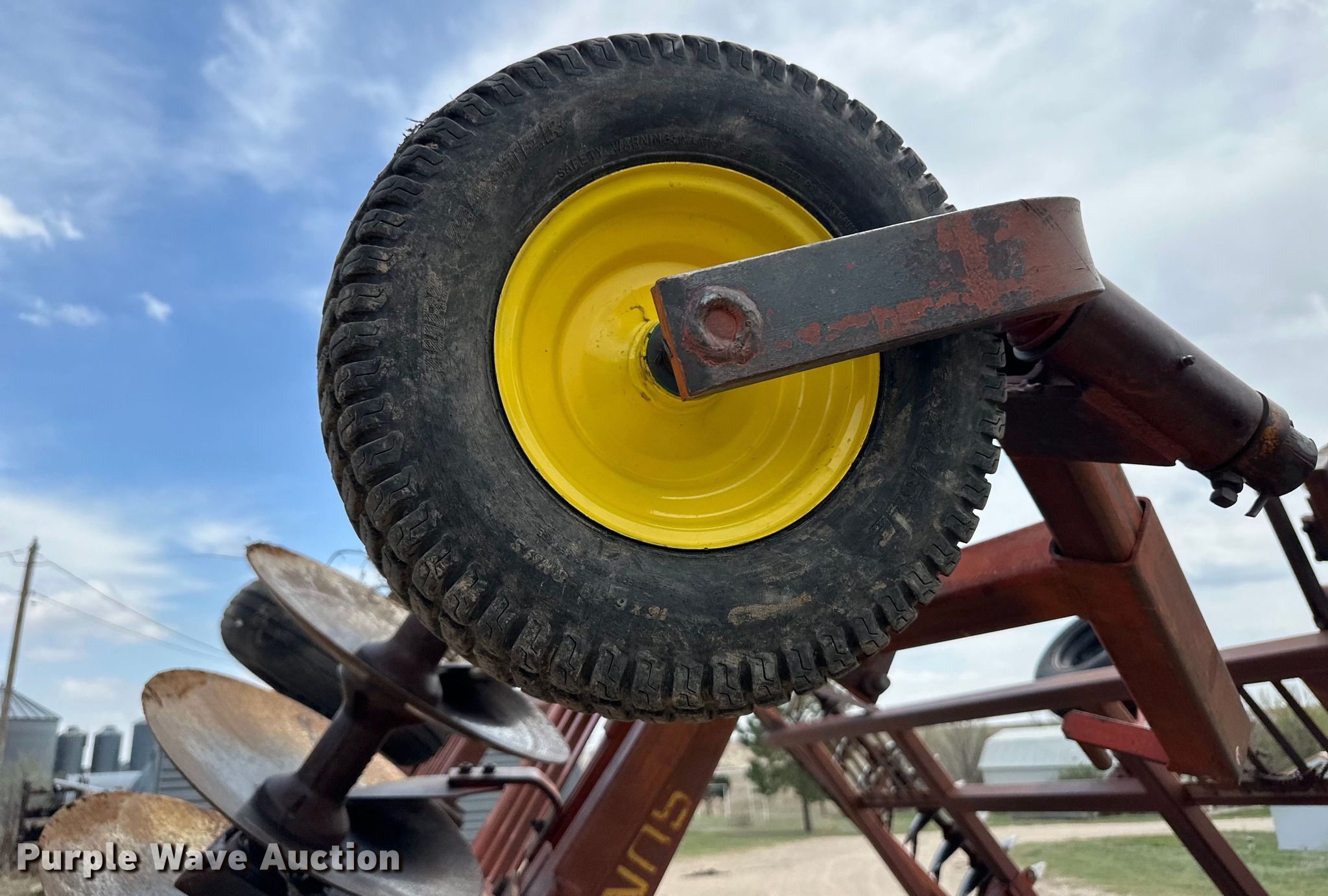 Sunflower double off-set disk. Overall width: 30'. Features Front blades Diameter: 20", Spacing: 8.5", Rear blades Diameter: 22", Spacing: 9.5", Disk scrapers, Operation Hydraulic lift, Hydraulic fold, Leveler: Manual, Attachments Rear hitch. Tires Tire size: 9.5L-15, Gauge wheels Size: 4.80/4.00-8. Max Prose. Beeler, KS 67518