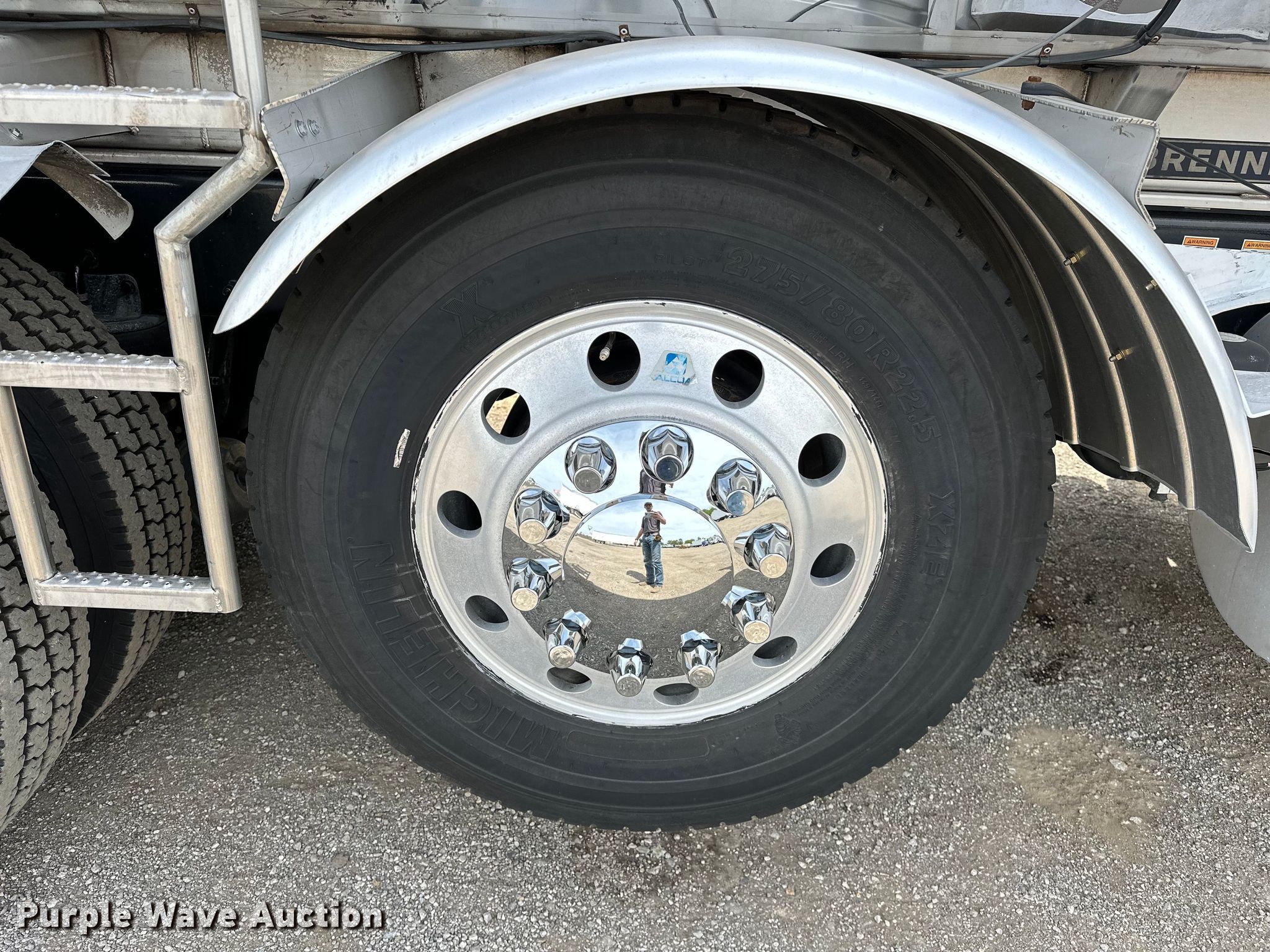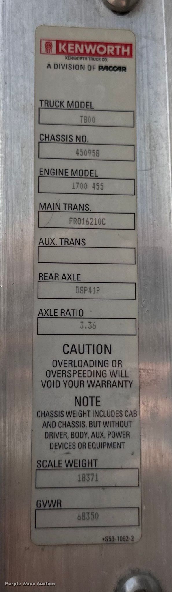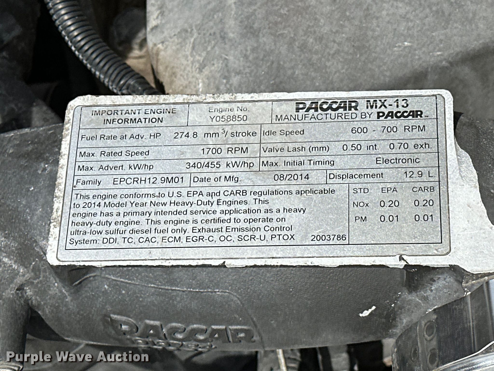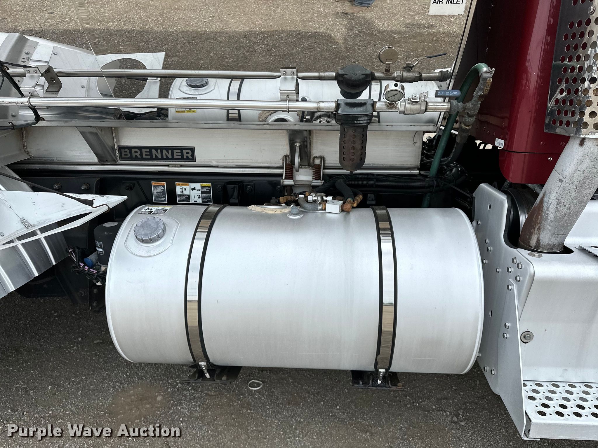 2015 Kenworth T800 tank truck. Miles: 584,268 on odometer, Hours: 11,009 on meter, VIN: 1NKDXP0X7FJ450958. Engine Paccar MX-13, Serial: Y058850, Displacement: 12.9L, Cylinders: 6, Fuel type: Diesel, HP: 455, kW: 340. Transmission Eaton Fuller, Manual, Speed: 10. Chassis Axles: Triple, Pusher axle, Differential lock: Inter-axle, Suspension: Air Dump valves, Brakes: Air, PTO, GVWR: 68,350 lbs. Interior AC, Heat, Heated mirrors, Power windows, Power locks, Cruise control. Features Bed / tank Brenner, Serial: D2112, Capacity: 4,000 gallons, 28' L x 84" W, Top fill, Rear drain: 4". Tires Front: 315/80R22.5, Rear: 11R22.5, Lift axle: 275/80R22.5. Notes Windshield chipped or cracked. Oklahoma title. Title distribution may be delayed up to 14 days from verification of funds. Collinsville, OK 74021