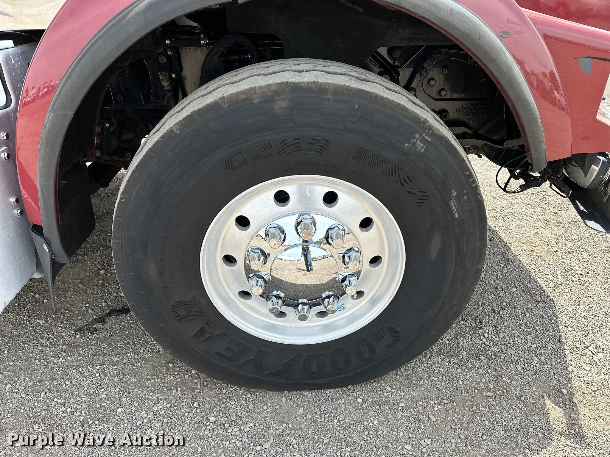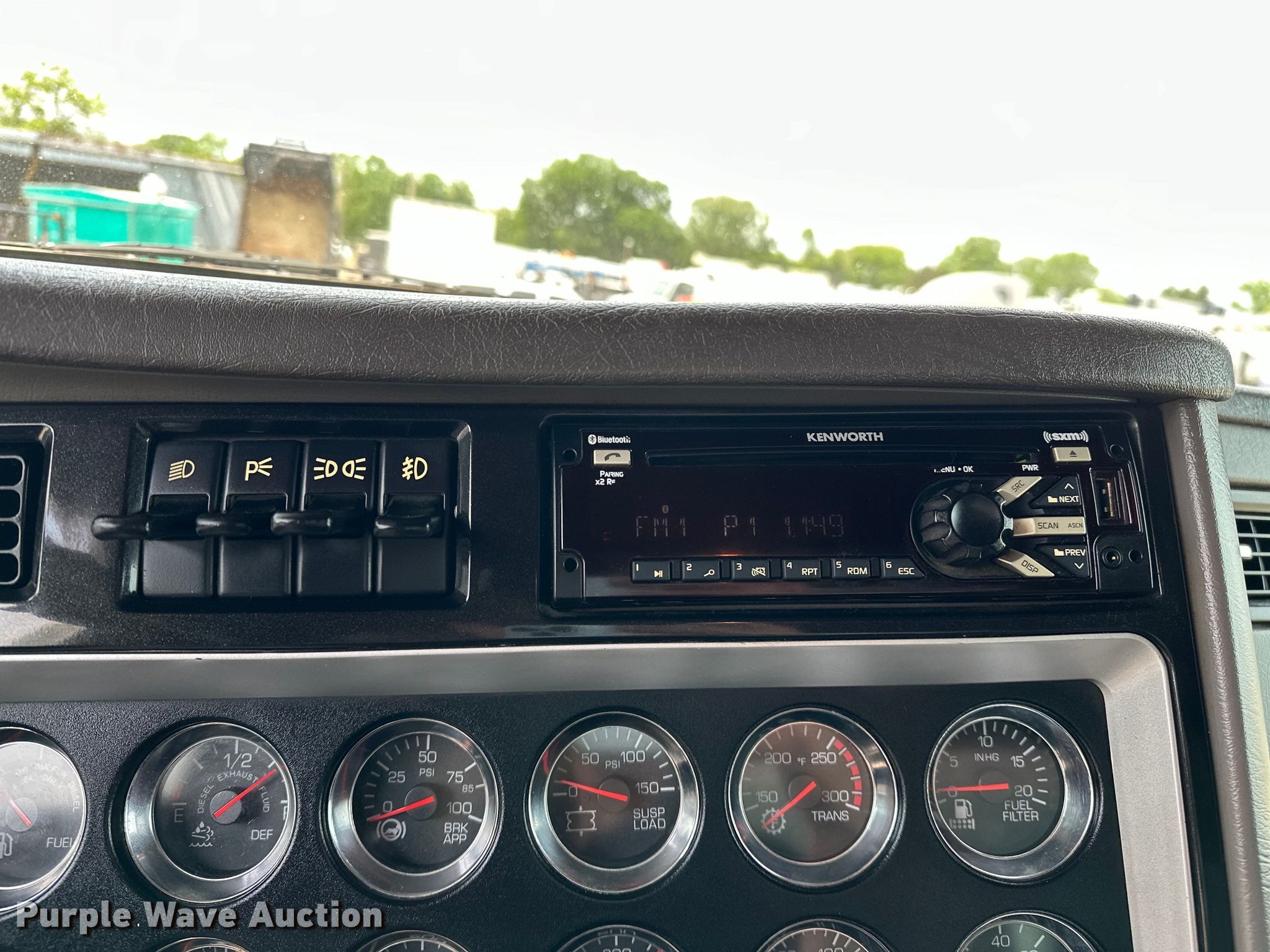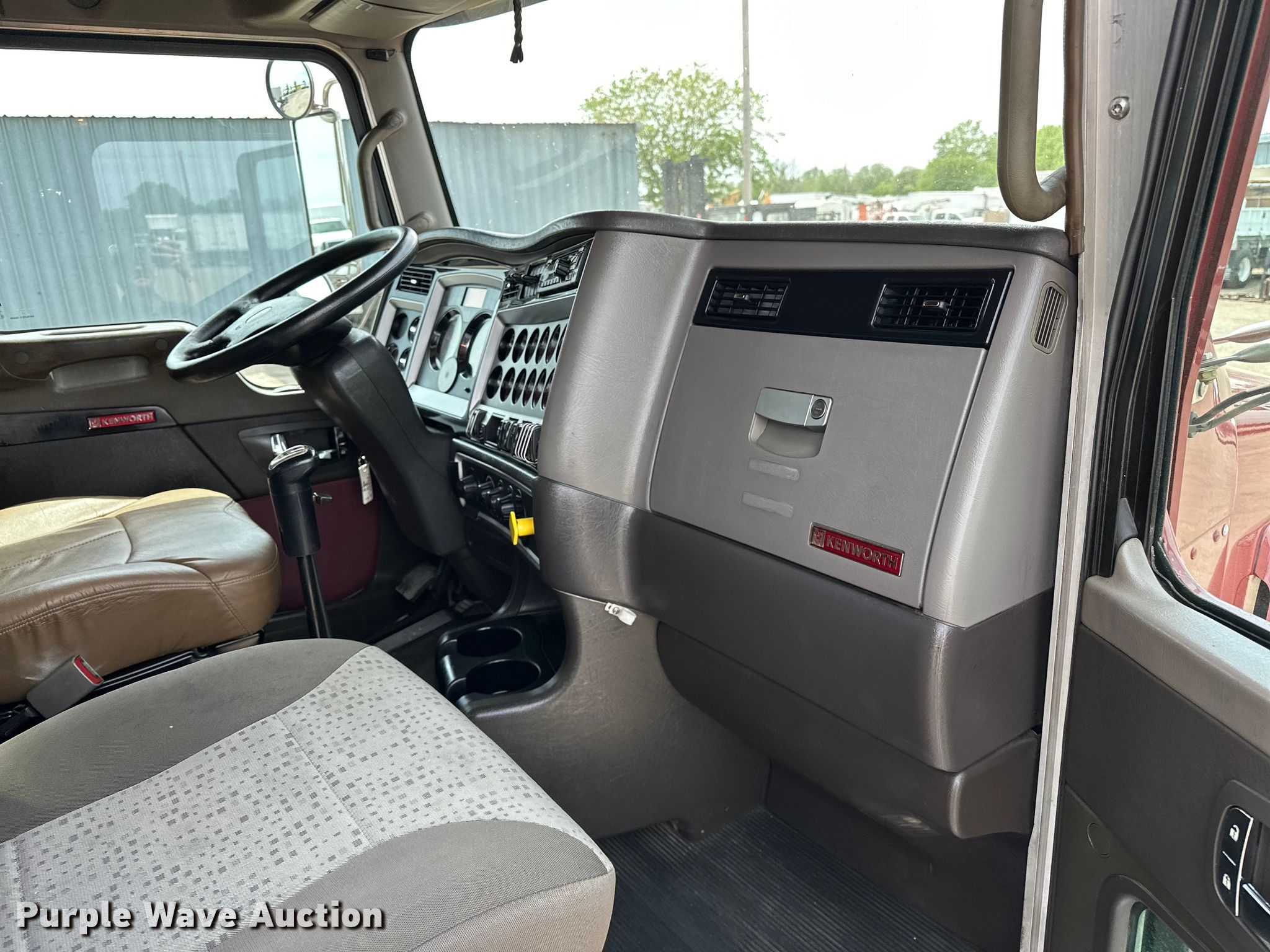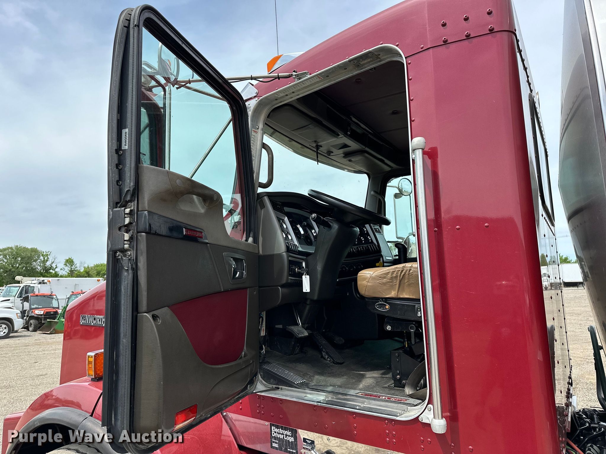 2015 Kenworth T800 tank truck. Miles: 584,268 on odometer, Hours: 11,009 on meter, VIN: 1NKDXP0X7FJ450958. Engine Paccar MX-13, Serial: Y058850, Displacement: 12.9L, Cylinders: 6, Fuel type: Diesel, HP: 455, kW: 340. Transmission Eaton Fuller, Manual, Speed: 10. Chassis Axles: Triple, Pusher axle, Differential lock: Inter-axle, Suspension: Air Dump valves, Brakes: Air, PTO, GVWR: 68,350 lbs. Interior AC, Heat, Heated mirrors, Power windows, Power locks, Cruise control. Features Bed / tank Brenner, Serial: D2112, Capacity: 4,000 gallons, 28' L x 84" W, Top fill, Rear drain: 4". Tires Front: 315/80R22.5, Rear: 11R22.5, Lift axle: 275/80R22.5. Notes Windshield chipped or cracked. Oklahoma title. Title distribution may be delayed up to 14 days from verification of funds. Collinsville, OK 74021