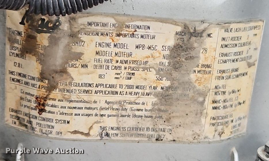 2010 Mack CHU613 semi truck. Miles: 609,262 on odometer, Hours: 29,678 on meter, VIN: 1M1AN09Y4AN005303. Engine Mack MP8-415C, Displacement: 12.8L, Cylinders: 6, Fuel type: Diesel. Transmission Mack Maxitorque T313L, Manual, Speed: 13. Chassis Axles: Tandem, Differential lock: Inter-axle, Suspension: Air Dump valves, Brakes: Air, GVWR: 50,000 lbs FAWR: 12,000 lbs, IAWR: 19,000 lbs, RAWR: 19,000 lbs. Interior AC, heat, Heated mirrors, Cruise control, Air ride cab. Features Deck plate: Aluminum, Fuel tank: Dual. Tires Size: 285/75R24.5. Notes Dash warning indicators: Engine shutdown, Fault code set. Kansas title. Title distribution may be delayed up to 14 days from verification of funds. N & K Cattle Co.. Mound City, KS 66056
