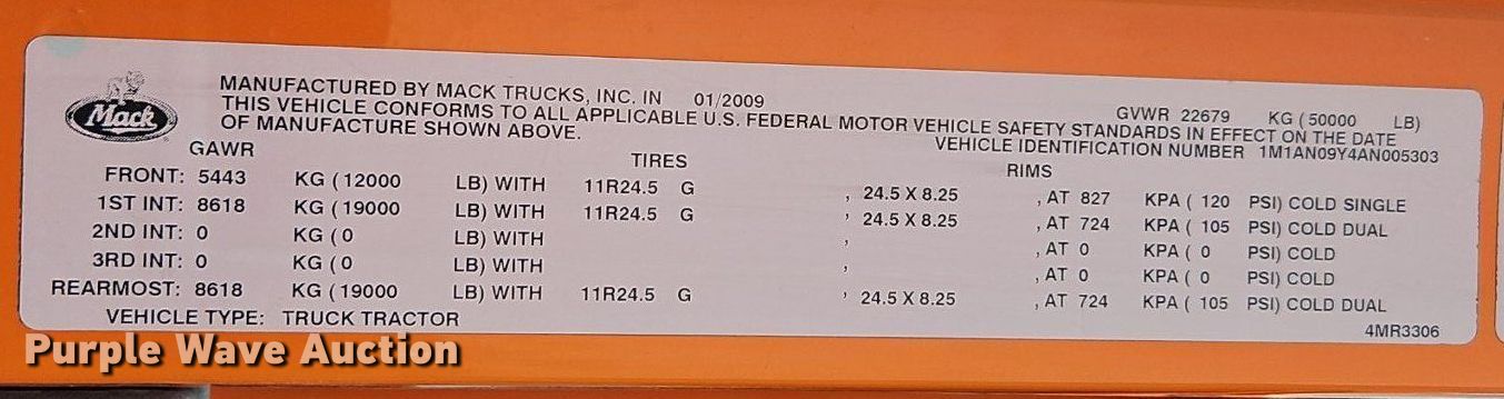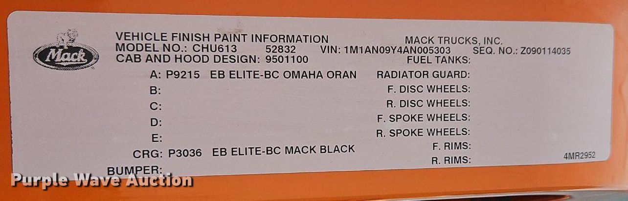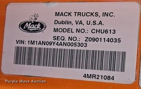 Purple Wave is selling a used Truck Tractor in Kansas. This item is a 2010 Mack CHU613 semi truck with the following: Miles: 609,262 on odometer, Hours: 29,678 on meter, VIN: 1M1AN09Y4AN005303