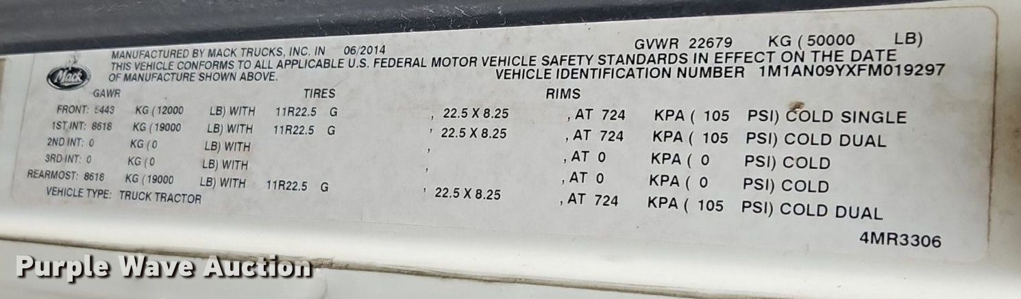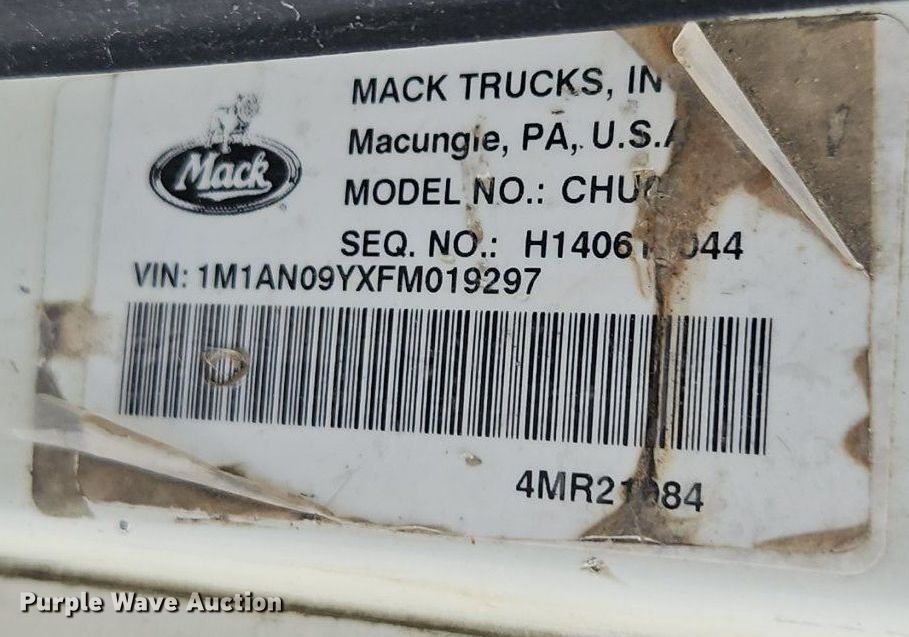 Purple Wave is selling a used Truck Tractor in Kansas. This item is a 2015 Mack CHU613 semi truck with the following: Miles: 692964 on odometer, VIN: 1M1AN09YXFM019297