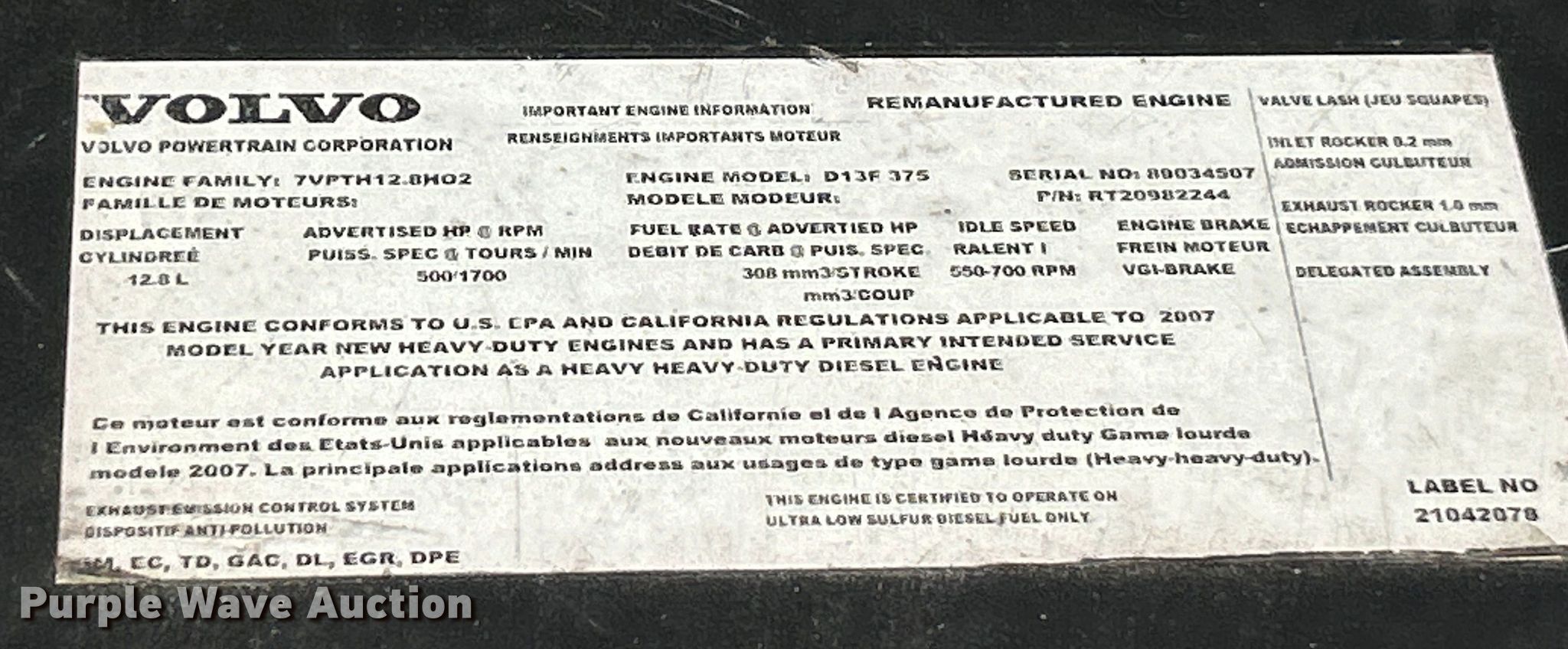 2009 Volvo VNM semi truck. Miles: 1,208,170 on odometer, VIN: 4V4MC9EG79N283830. Engine Volvo D13F, Displacement: 12.8L, Cylinders: 6, Fuel type: Diesel, HP: 375, Engine brake. Transmission Eaton Fuller, Manual, Speed: 10. Chassis Axles: Tandem, Differential lock: Inter-axle, Suspension: Air, Brakes: Air, GVWR: 49,478 lbs FAWR: 12,000 lbs, IAWR: 18,739 lbs, RAWR: 18,739 lbs. Interior AC, heat, Heated mirrors, Cruise control. Features Deck plate: Aluminum, Fifth wheel type: Air operated, sliding, Fuel tank: Dual. Tires Front: 295/75R22.5, Rear: 275/80R22.5. Notes Windshield chipped or cracked. Indiana title. Seller is a Missouri licensed motor vehicle dealer. Title will be assigned and distributed by the dealer. Please contact the seller for distribution questions. Title distribution may be delayed up to 14 days from verification of funds. Northpoint Enterprises, LLC. Troy, MO 63379