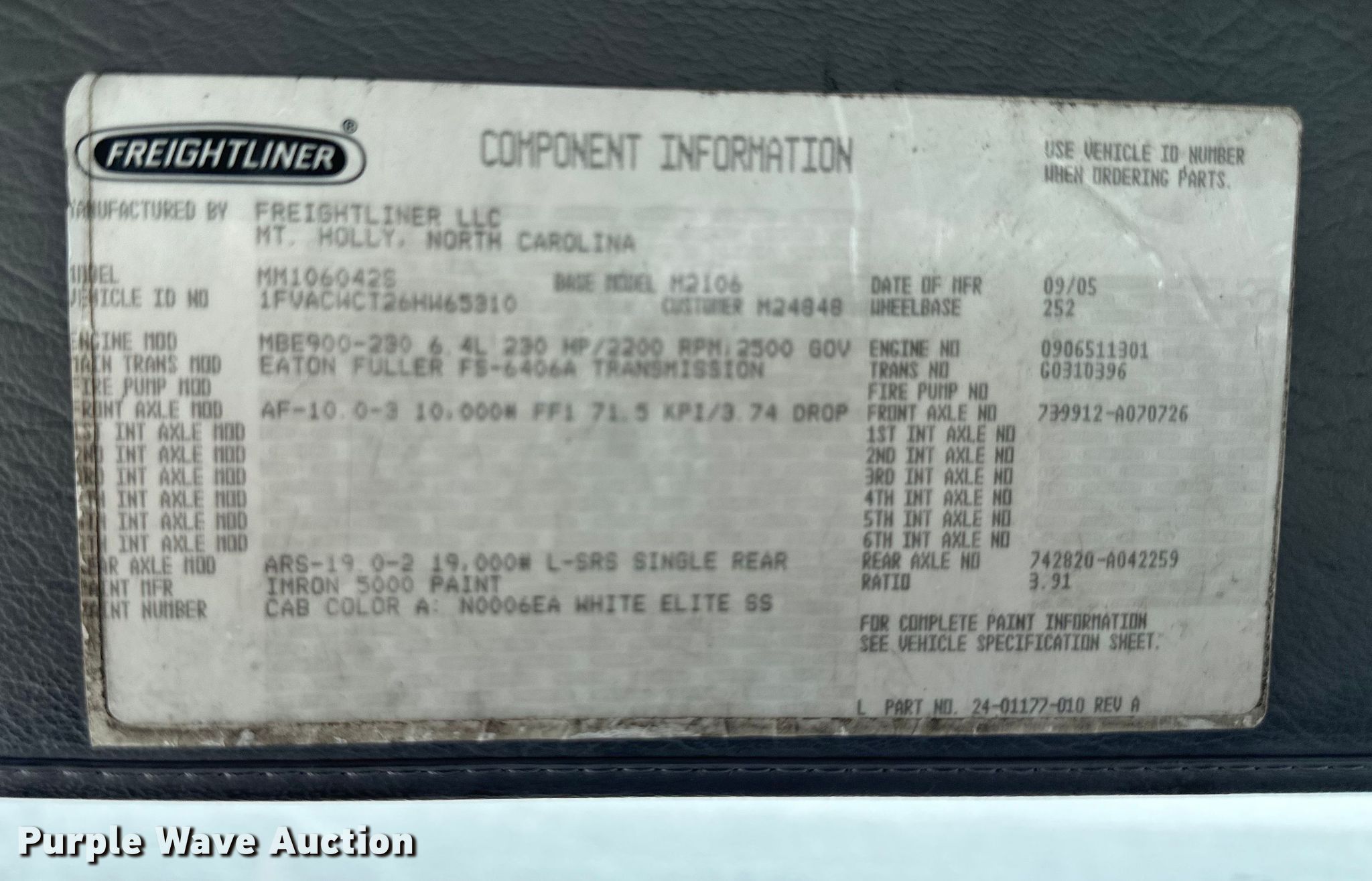 2006 Freightliner Business Class M2 box truck. Miles: Unknown Last known miles: 293,816, Hours: 11,197 on meter, VIN: 1FVACWCT26HW65310. Engine Mercedes Benz MBE900-230, Displacement: 6.4L, Cylinders: 6, Fuel type: Diesel, HP: 230. Transmission Eaton Fuller, Manual, Speed: 6. Chassis Axles: Single, Suspension: Spring, Brakes: Hydraulic, GVWR: 26,000 lbs. Interior AC, Heat, Cruise control. Features Box bed TransGlobal, Serial: 125533, 24' L x 96" W x 102" H, Floor: Wood, End gate lift Waltco.. Tires Size: 11R22.5. Notes Possible electrical issues, Turn signal issues, Non-operational odometer, Dash warning indicator: ABS, Brake. Kansas title. Mileage has not been verified. Odometer discrepancy will be marked on the title. Allegiant Manufacturing LLC. Kansas City, KS 66102