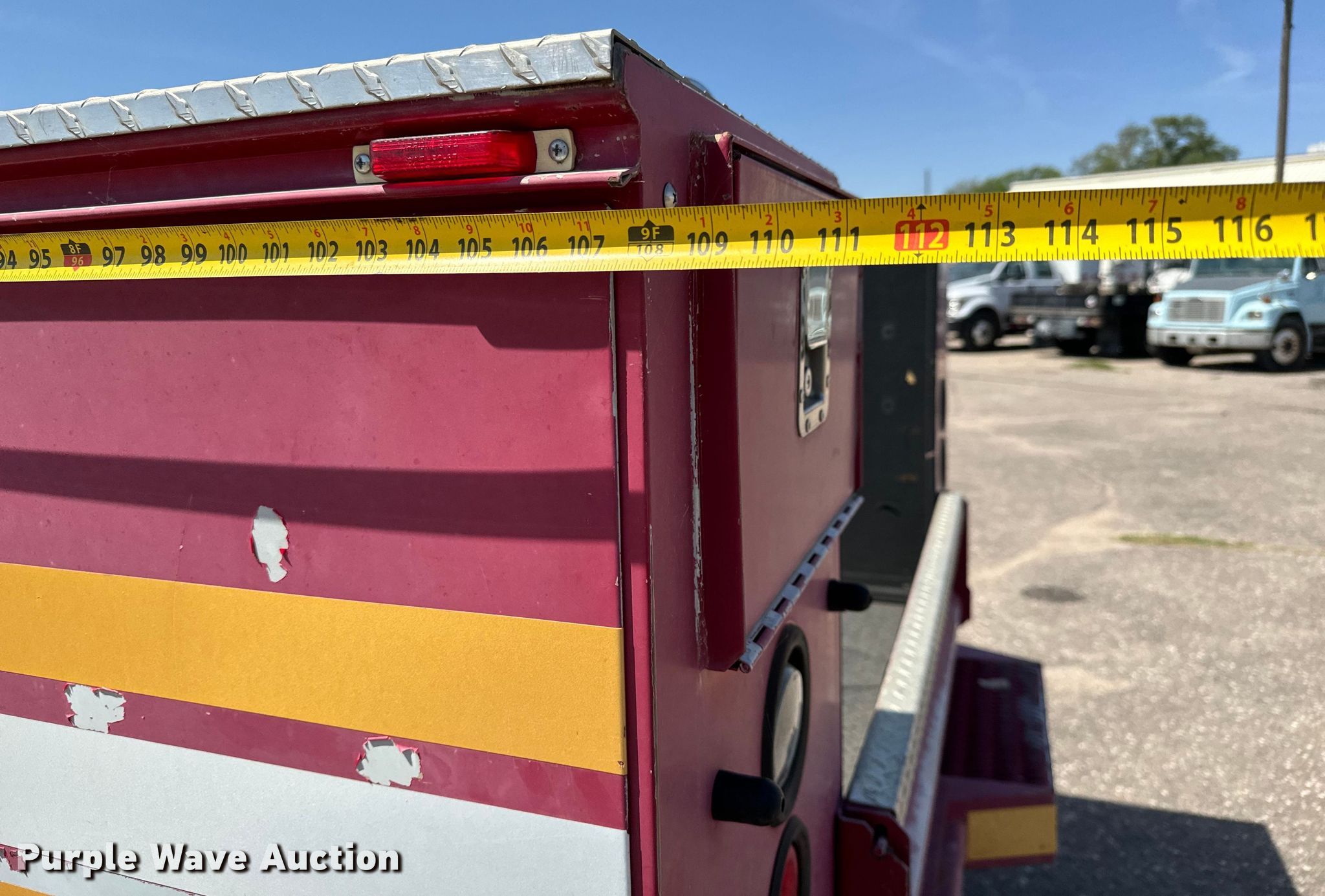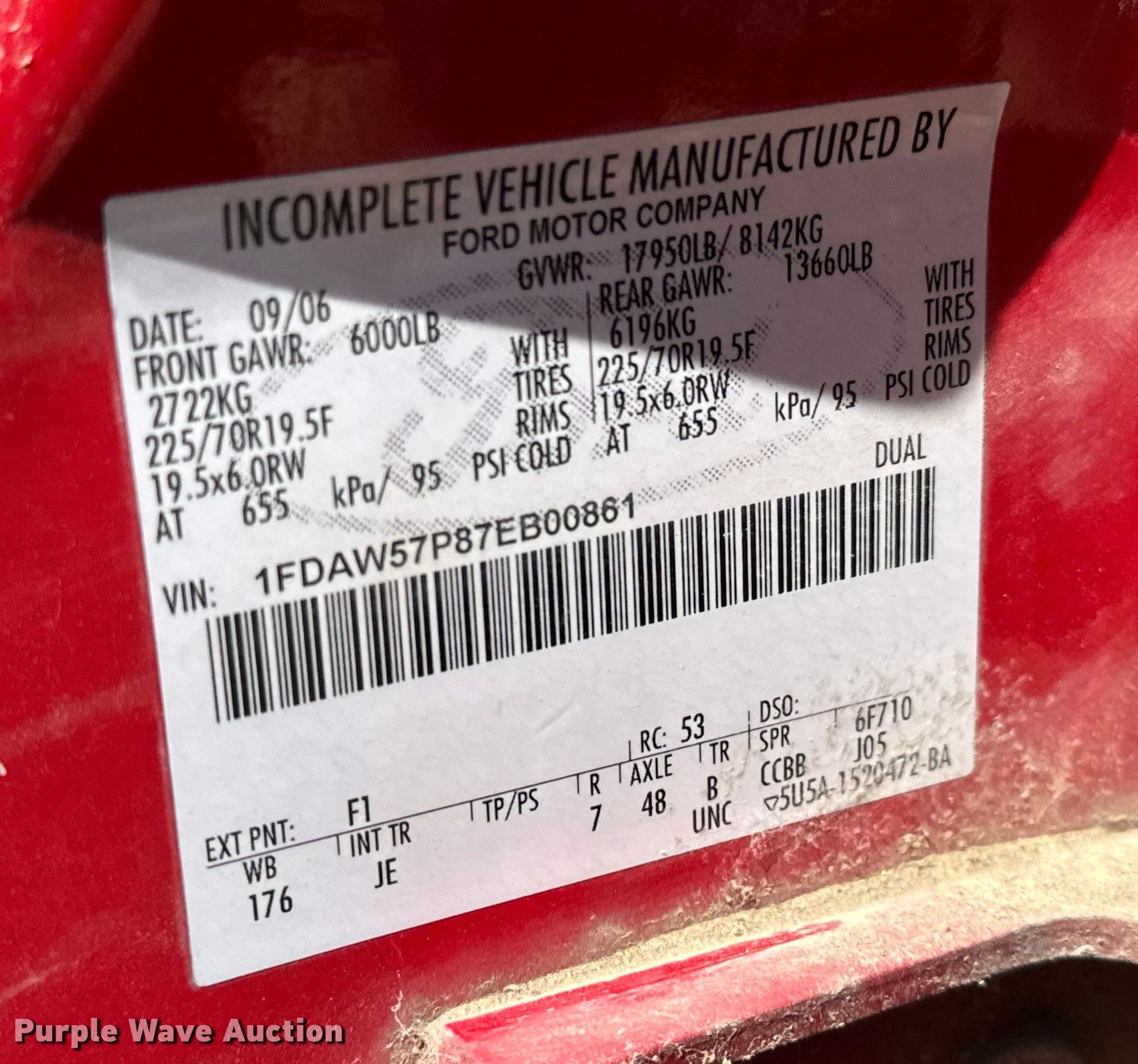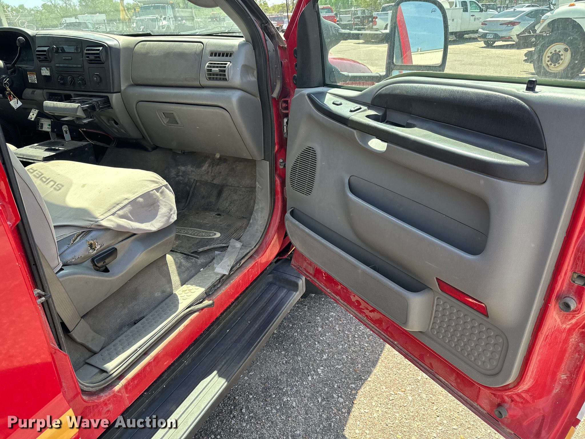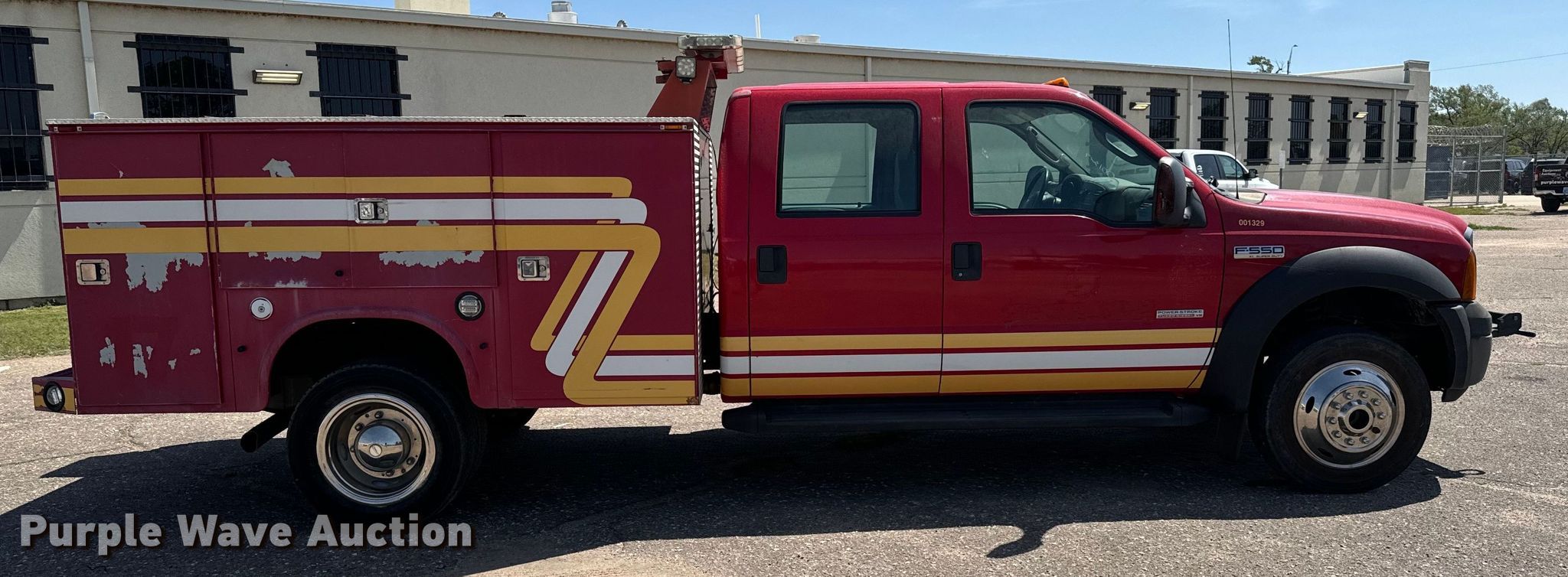 2007 Ford F550 Super Duty XL brush fire truck. Miles: 143,805 on odometer, VIN: 1FDAW57P87EB00861, Unit #: 001329. Engine Displacement: 6.0L, Cylinders: 8, Fuel type: Diesel. Transmission Automatic. Chassis Four wheel drive, Axles: Single, Suspension: Spring, Brakes: Hydraulic, GVWR: 17,950 lbs. Interior AC, Heat, Heated mirrors, Power windows, Power locks, Cruise control. Features Fire truck body Knapheide 6108D54J 9' L x 94" W, PA/ siren controls. Tires Size: 225/70R19.6. Notes Dead battery, Unknown operating condition of AC. Kansas title. City of Wichita Central Maintenance Facility - Open inspection May 29 & June 1. 1801 S. McLean. Wichita, KS 67213