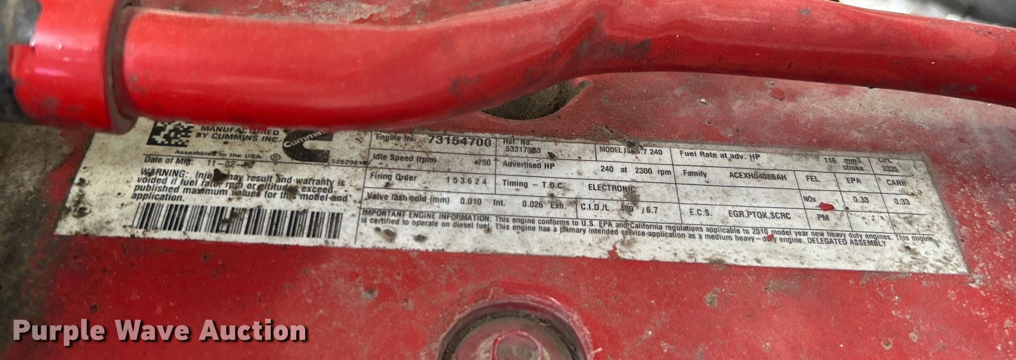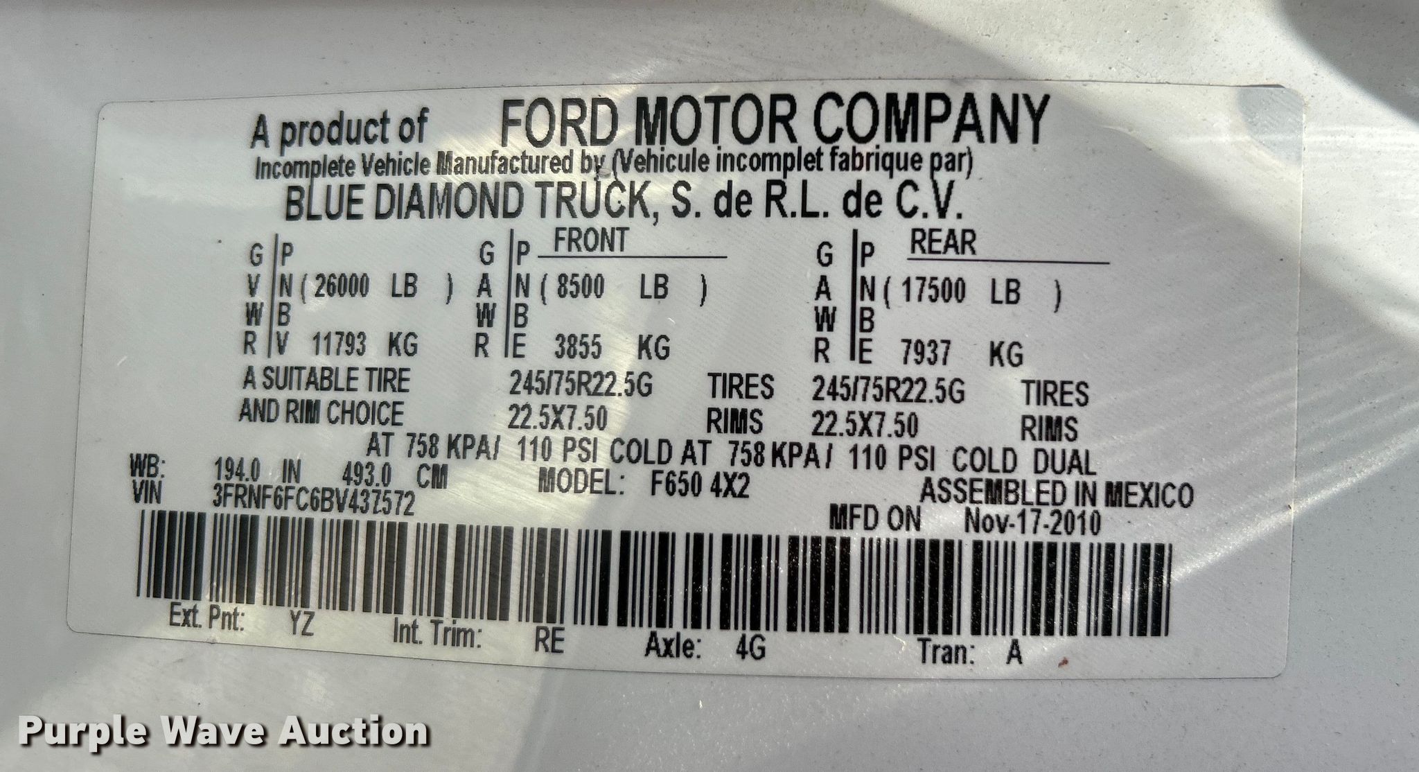 2011 Ford F650 Super Duty flatbed truck. Miles: 113,771 on odometer, VIN: 3FRNF6FC6BV437572. Engine Cummins ISB6.7, Serial: 73154700, Displacement: 6.7L, Cylinders: 6, Fuel type: Diesel, HP: 240. Transmission Automatic. Chassis Axles: Single, Suspension: Spring, Brakes: Hydraulic, PTO, GVWR: 26,000 lbs, Wheelbase: 194". Interior AC, Heat, Cruise control, Auxiliary controls, Brake controller. Features Flatbed 16' L x 96" W. Tires Size: 245/70R19.5. Notes Dash warning indicator: ABS. Oklahoma title. Title distribution may be delayed up to 14 days from verification of funds. Collinsville, OK 74021
