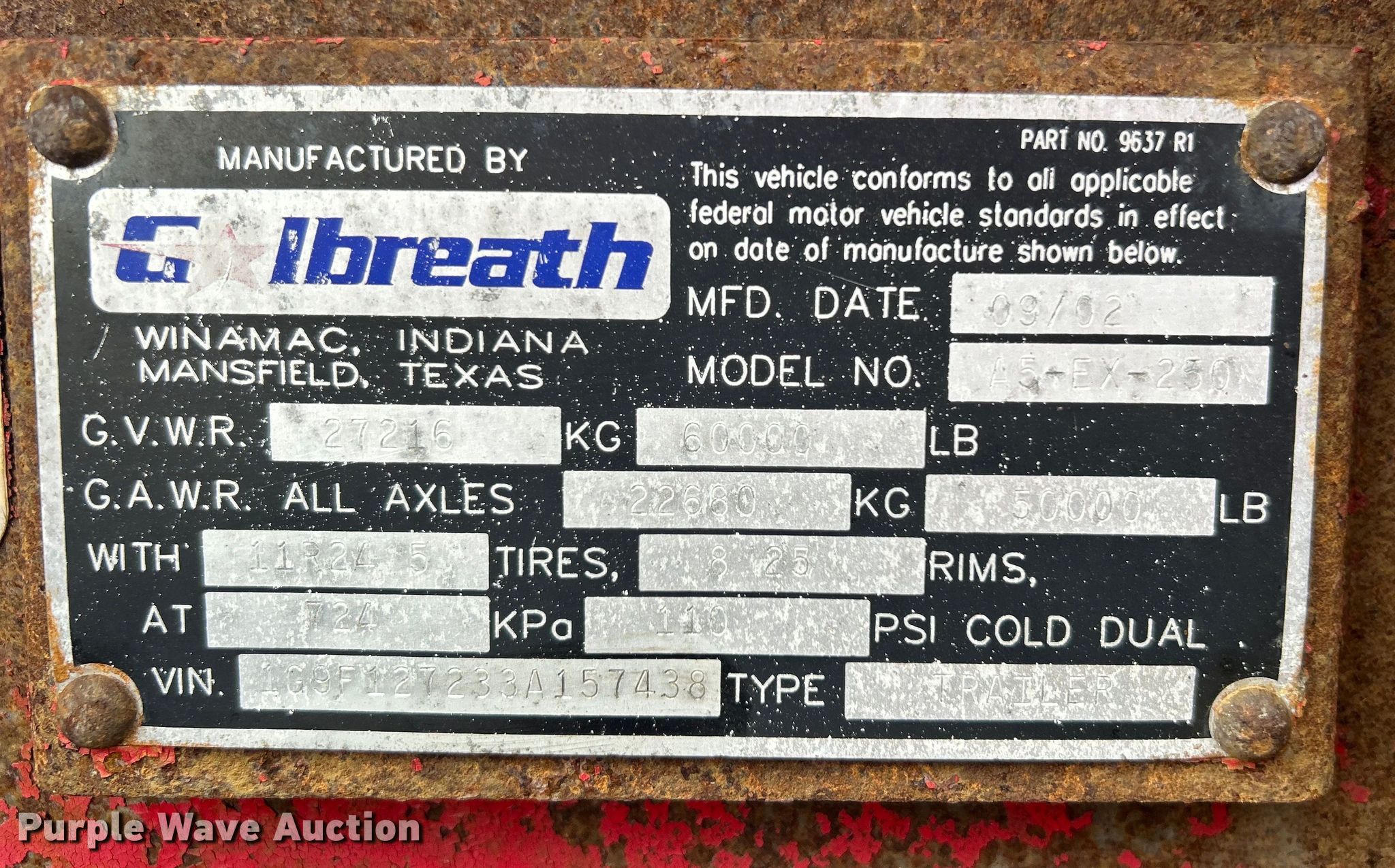 2003 Galbreth A5-EX-250 container trailer. VIN: 1G9F127233A157438. Dimensions Overall: 28' L x 96" W. Features Deck type: Steel. Chassis Landing gear: Dual, Suspension: Spring, Brakes: Air, Axles: Tandem, GVWR: 60,000 lbs, GAWR: 50,000 lbs. Tires Steel wheels, Size: 11R24.5. Notes Truck not included. Oklahoma title. Title distribution may be delayed up to 14 days from verification of funds. Collinsville, OK 74021