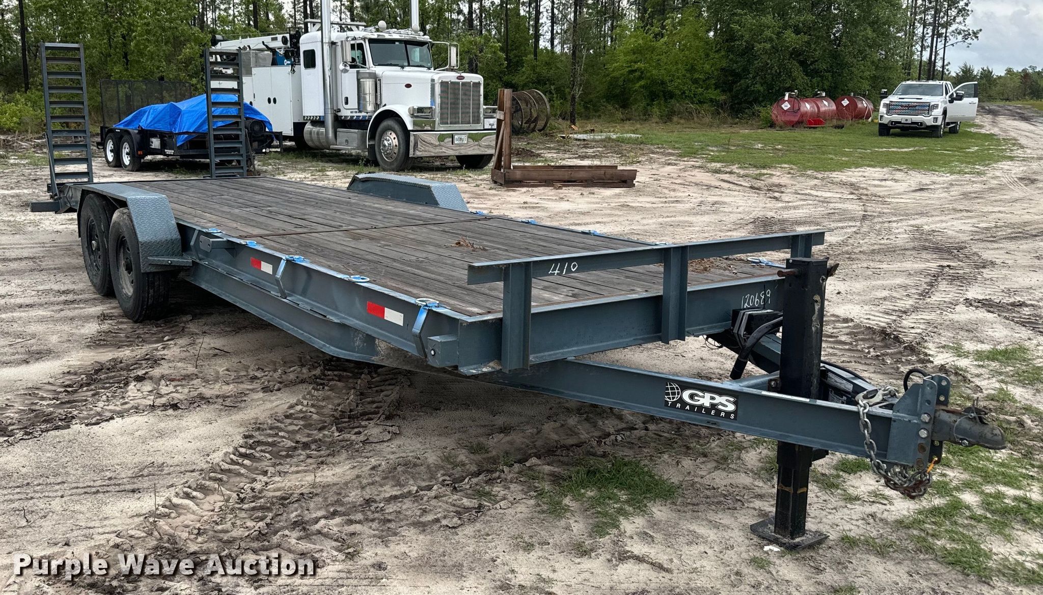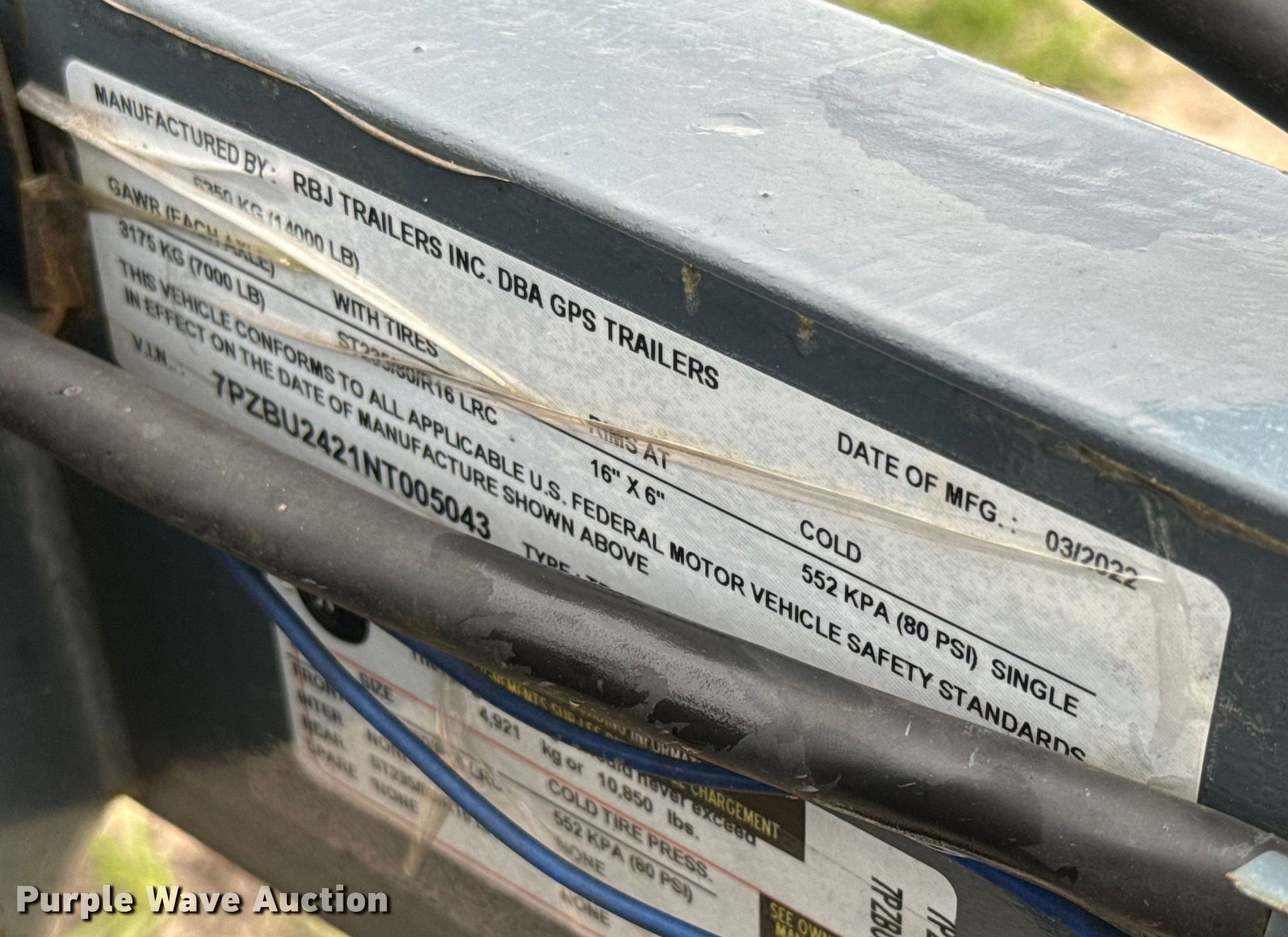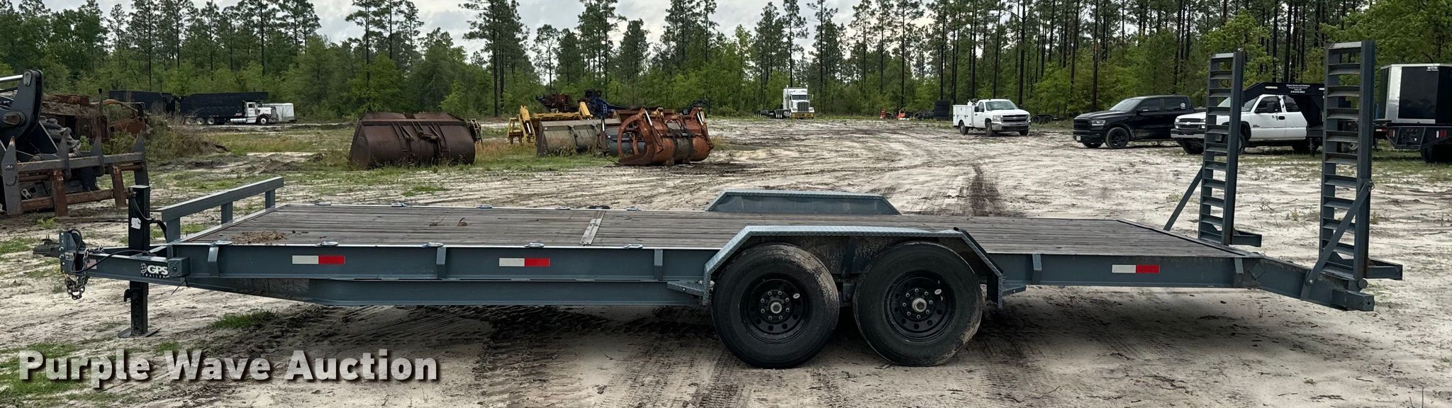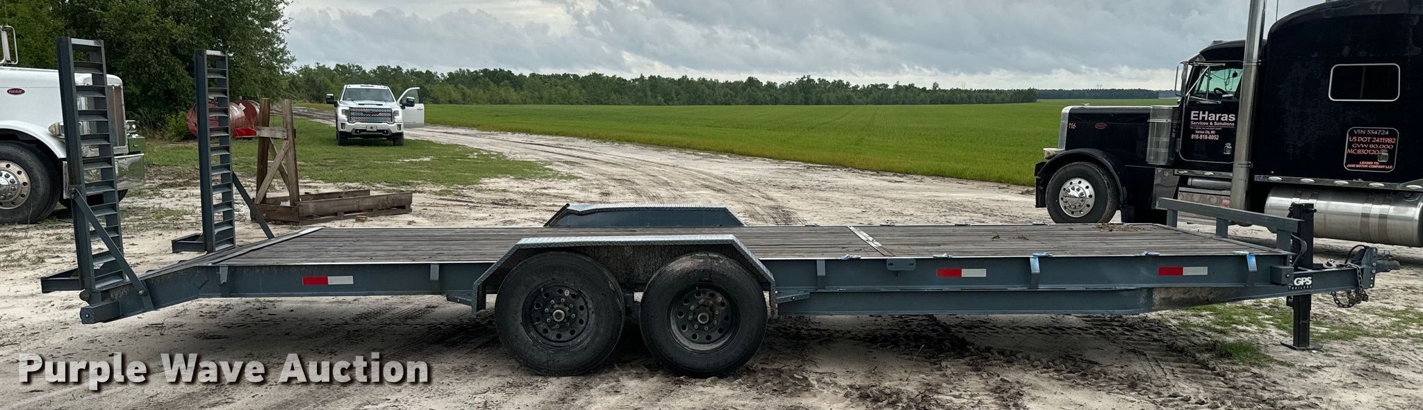 2022 GPS equipment trailer. VIN: 7PZBU2421NT005043. Dimensions Deck: 24' L x 82" W, Tail length: 2', Ramps: Manual Length: 60". Features Deck type: Wood. Chassis Ball hitch: 2 5/16", Landing gear: Single, Suspension: Spring, Brakes: Electric, Axles: Tandem, GVWR: 14,000 lbs, GAWR: 7,000 lbs. Tires Steel wheels, Size: 235/80R16. Florida title. EHaras Services & Solutions. 7138 Southeast Co Road 255. Lee, FL 32059