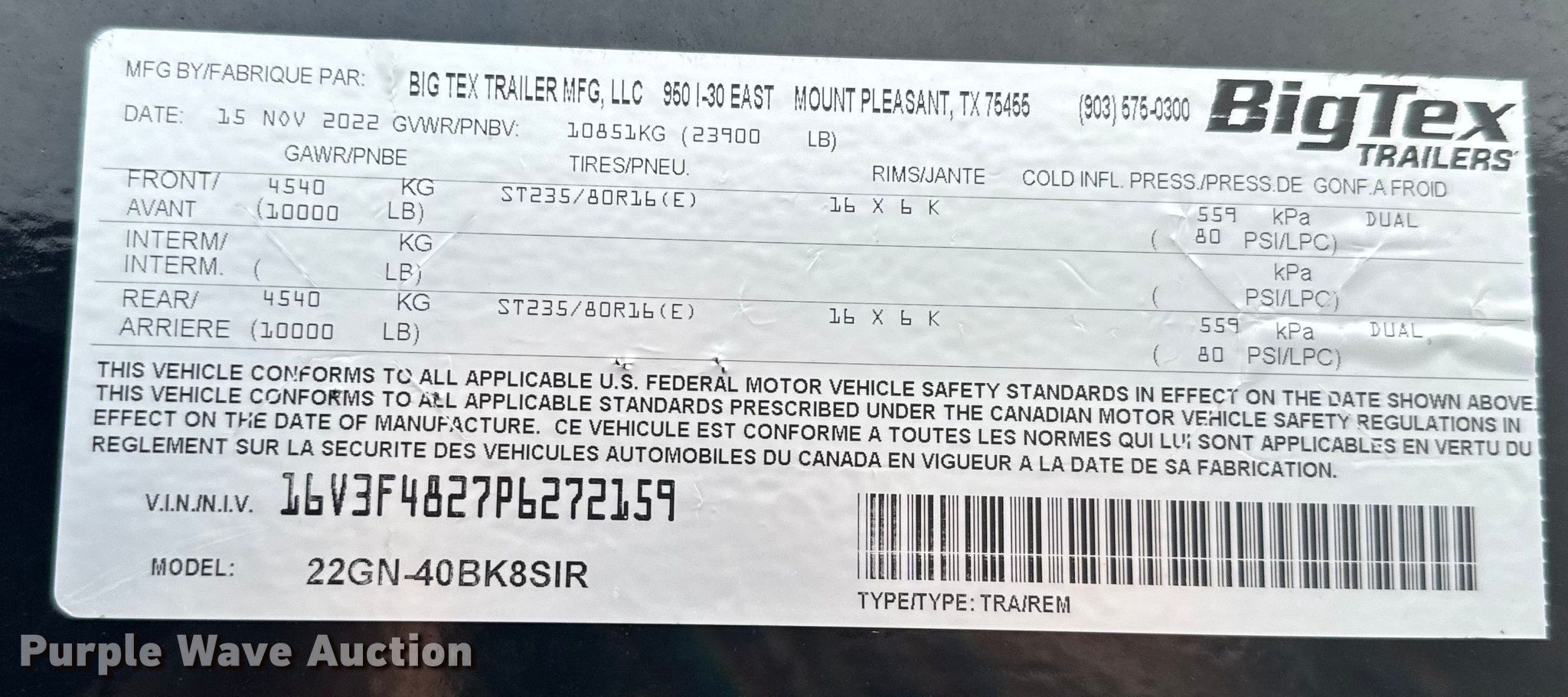 Purple Wave is selling a used Equip. Trailer in Kansas. This item is a 2023 Big Tex 22GN-40BK8SIR equipment trailer with the following: VIN: 16V3F4827P6272159