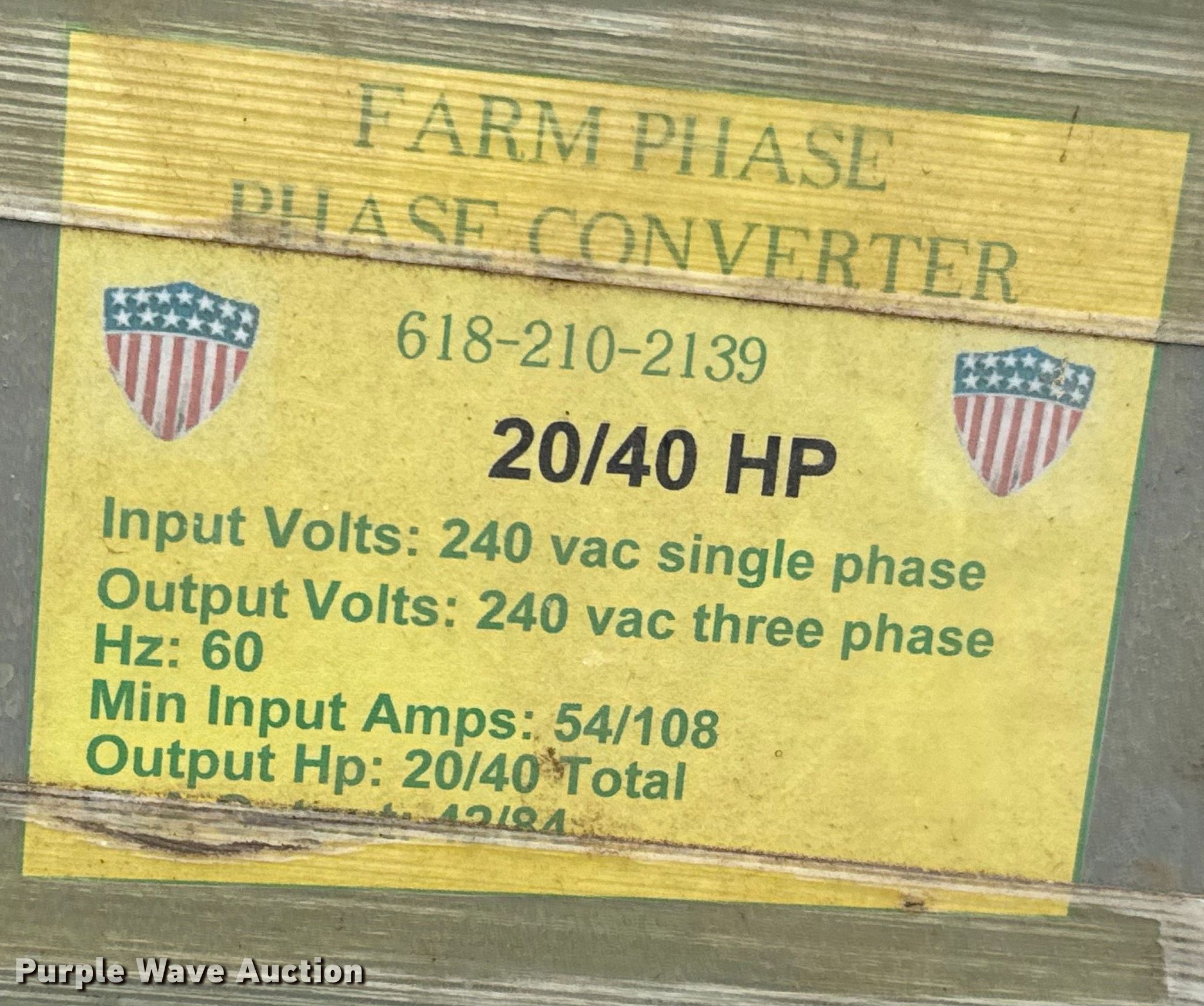 Premium Efficiency electric motor. HP: 25, Volts: 230/460, Phase: Three. Farm Phase phase converter HP: 20/40, Volts: 240, Phase: Single, Three. Potatoe Creek LLC. Edna, KS 67342