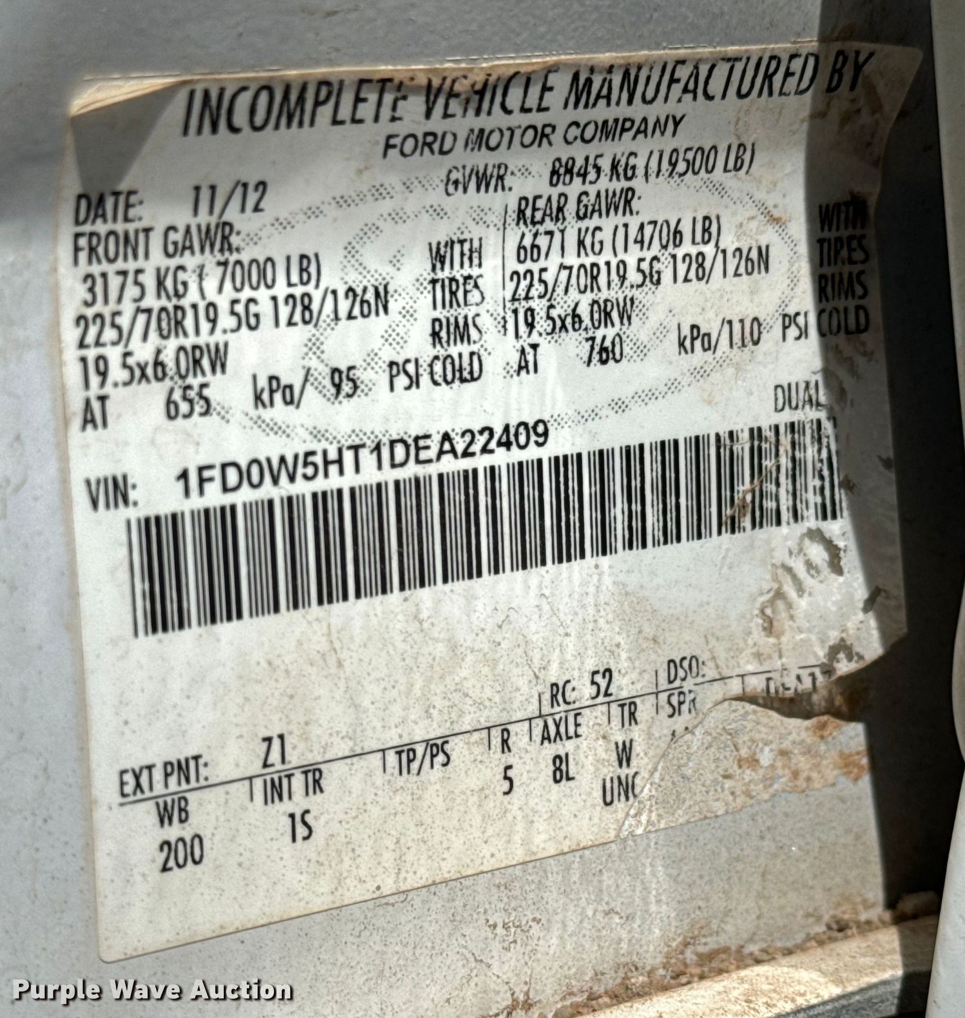 2013 Ford F550 Super Duty XL Crew Cab truck cab and chassis. Miles: 227,268 on odometer, VIN: 1FD0W5HT1DEA22409. Engine Displacement: 6.7L, Cylinders: 8, Fuel type: Diesel. Transmission Automatic. Chassis Four wheel drive, Axles: Single, Suspension: Spring, Brakes: Hydraulic, Truck chassis: 11', GVWR: 19,500 lbs FAWR: 7,000 lbs, RAWR: 14,706 lbs, Wheelbase: 200". Interior AC, Heat, Heated mirrors, Power windows, Power locks, Cruise control. Tires Size: 225/70R19.5. Notes Windshield chipped, Engine issues. Kansas title. Herman L Loeb Oil. Great Bend, KS 67530