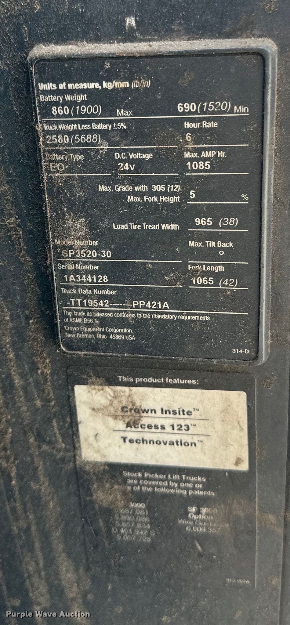 Crown SP3520-30 order picker. Hours: 12,118 on meter, Serial: 1A344128. Electric Motor Volts: 24. Transmission Hydrostatic. Features Maximum lift capacity: 3,000 lbs, Maximum lift height: 195", Mast stages: 3, Fork length: 42". Notes Battery included, Charger included. Standard Beverage. Lawrence, KS 66049