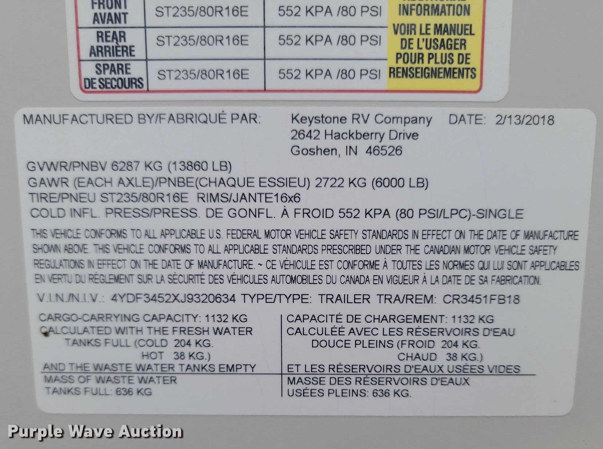 2018 Keystone RV Cruiser 3451FB18 camper. VIN: 4YDF3452XJ9320634. Chassis Axles: Tandem, Suspension: Spring, Brakes: Electric, GVWR: 13,860 lbs, GAWR: 6,000 lbs. Interior Kitchen: Sink, Refrigerator, Freezer, Microwave, Stove: Propane, Living room: Table, Couch, Bathroom, Bed type: Queen, Heater, AC units: 2. Features Slide outs: 3, Awnings: 1 Awning type: Electric. Tires Size: ST235/80R16. South Dakota title. Noteboom RV. Harrisburg, SD 57032