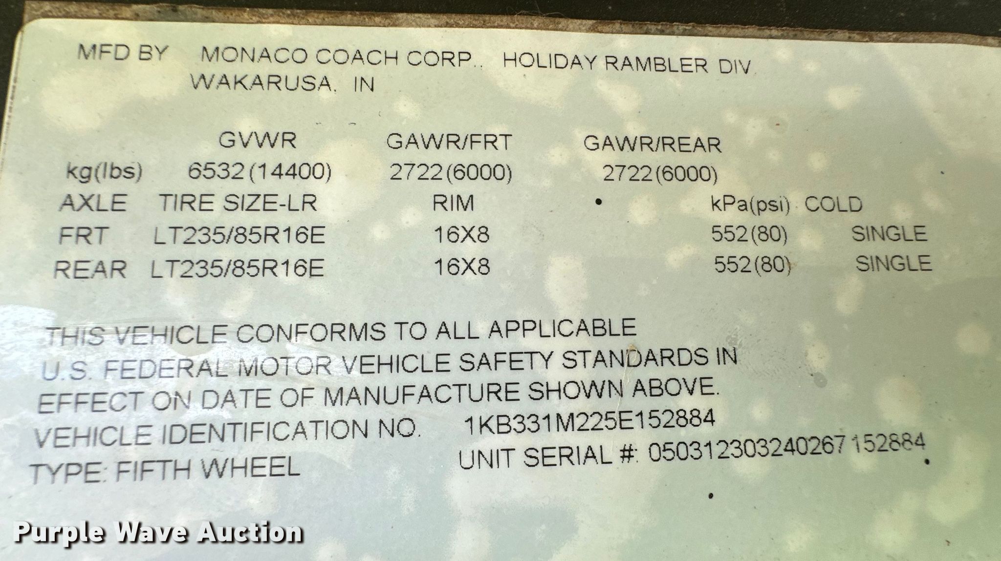 2005 Holiday Rambler Alumascape camper. Camper length: 34', VIN: 1KB331M225E152884, Insurance salvage unit. Chassis Axles: Tandem, Suspension: Spring, Brakes: Electric, GVWR: 14,400 lbs, GAWR: 6,000 lbs. Interior Kitchen: Sink, Refrigerator, Freezer, Microwave, Oven, Stove: Gas, Living room: Table, Pull out couch, Bathroom, Beds: 1 Bed type: Queen, Sound system, Heater, AC units: 2. Features Slide outs: 2, Awnings: 1 Awning type: Manual, Rear hitch. Tires Size: 235/85R16. Notes Fire damage. Oklahoma title. Title distribution may be delayed up to 14 days from verification of funds. Oklahoma Farm Bureau. Gage , OK 73843