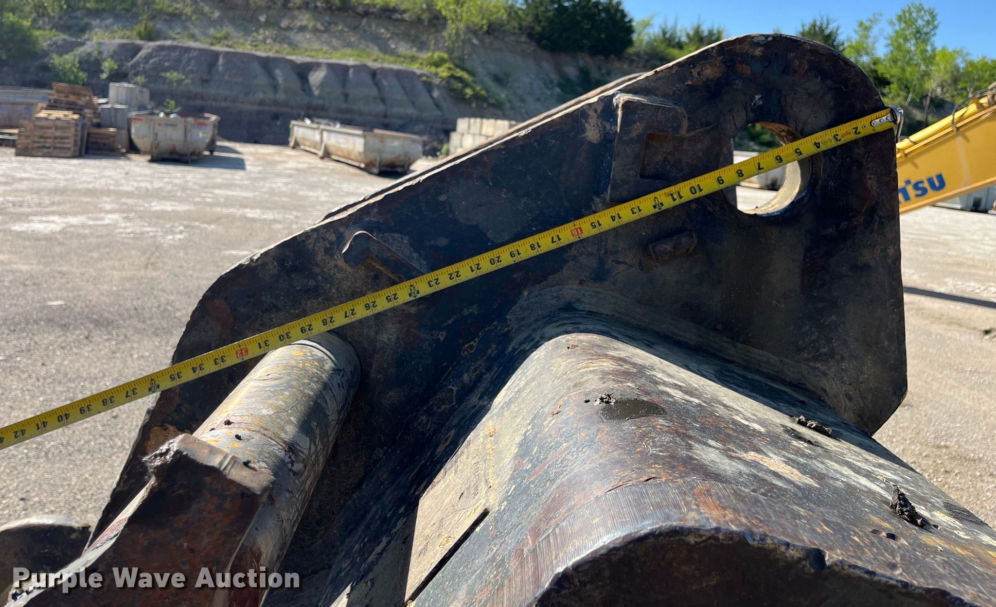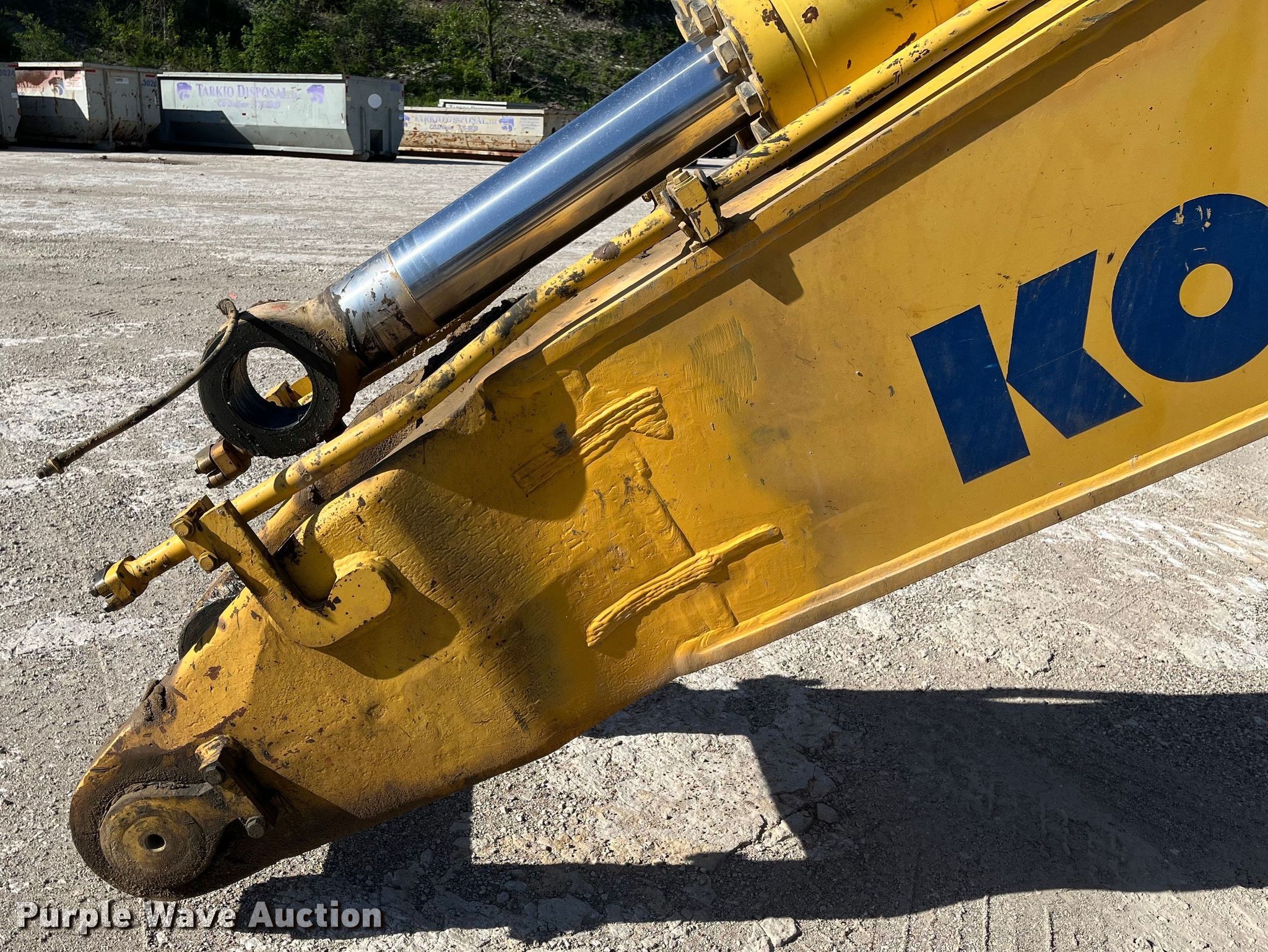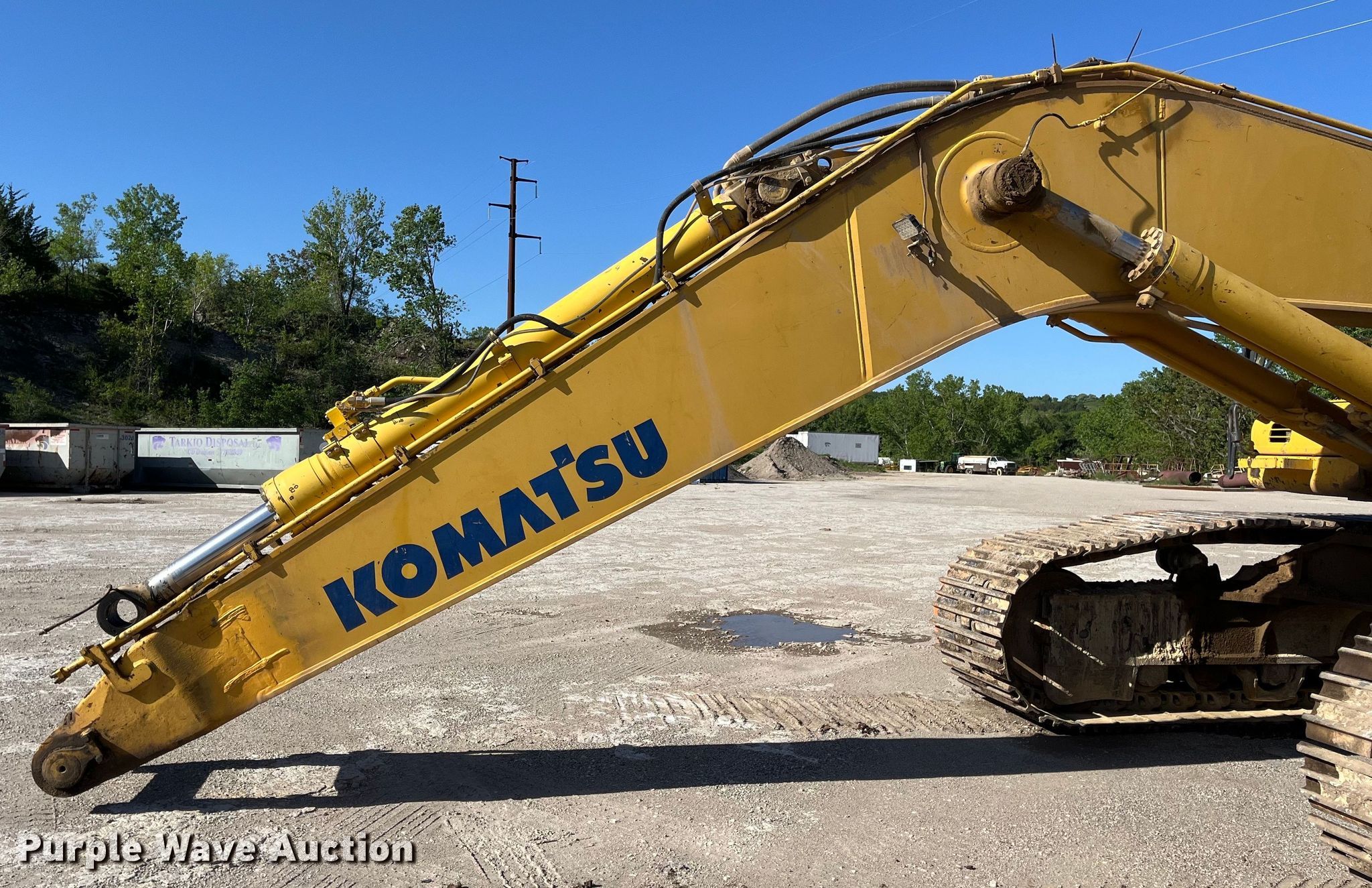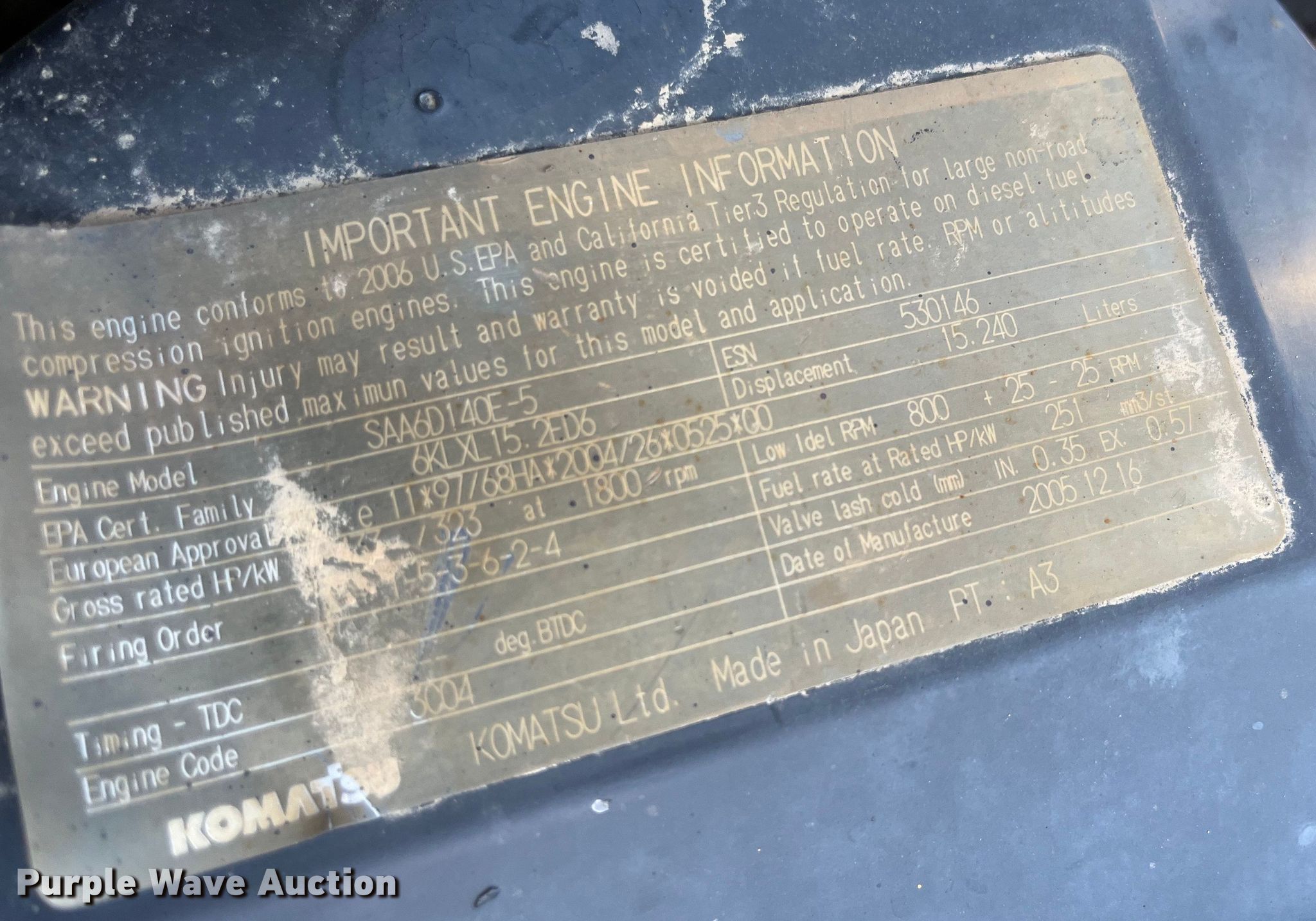 2006 Komastu PC600LC-8 long reach excavator. Hours: 24,346 on meter, Serial: KMTPC150K02030025. Engine Komatsu SAA6D140E-5, Serial: 530146, Displacement: 15.240L, Cylinders: 6, Fuel type: Diesel, kW: 323. Transmission Hydrostatic, Two speed travel. Operators station Enclosed cab, AC, Heat. Features Auxiliary hydraulics, Counter weights, Removable, Boom Standard, Stick Stick length: 17', Long reach, Bucket Esco, Width: 72", Teeth: 5. Tracks Width: 35.5", Steel, Grouser pads: Triple. Notes Warning indicator: Battery, Dead battery, Hydraulic leak, Bucket, stick, and counter weight removed but included. Bayer Construction Company. Manhattan, KS 66502