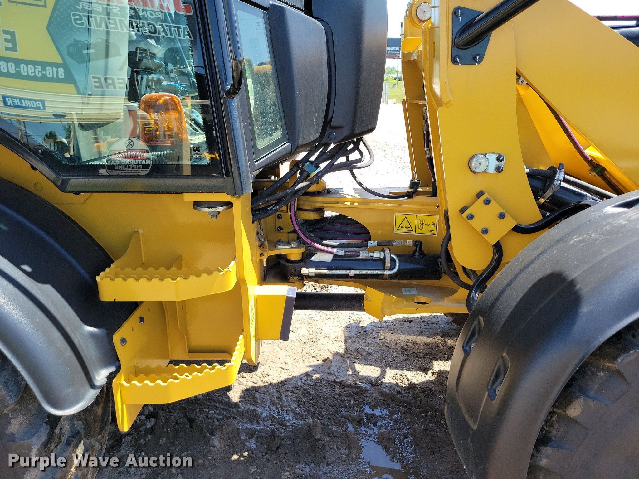 Caterpillar 908M wheel loader. Hours: 79 on meter, Serial: CAT0908MHK5802768. Engine Caterpillar C3.3B, Serial: 8MQ4636, Displacement: 3.3L, Cylinders: 4, Fuel type: Diesel, kW: 54.6. Transmission Hydrostatic, Two speed travel. Operators station Enclosed cab, Heat, Bucket controls: Joystick. Features Auxiliary hydraulics: Front, Quick coupler: Hydraulic, Bucket Verachtert WG-46-25-210-NN, Width: 82", Cutting edge: Weld-on, Forks Length: 48". Tires Size: 405/70R20. Thompson Construction Co. Grain Valley, MO 64029