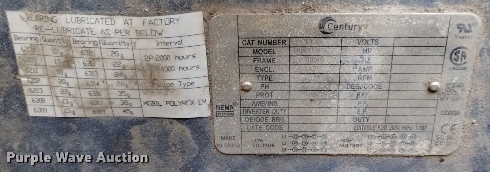 2001 Quincy QSF125-100 air compressor. Hours: Unknown. Electric Motor Century PN0AA18A01C, HP: 125, Volts: 230/460, Phase: Three. Features Air compressor Quincy FSG204155, Skid mounted, EAP HS-500 Air Dryer 2" line, Max flow: 500S CFM, Electric motor Bonora, HP: 5, Volts: 460, Phase: Three, Skid mounted. Schmidt Construction Company -Open inspection will be May 22nd and 25th. Colorado Springs, CO 80910