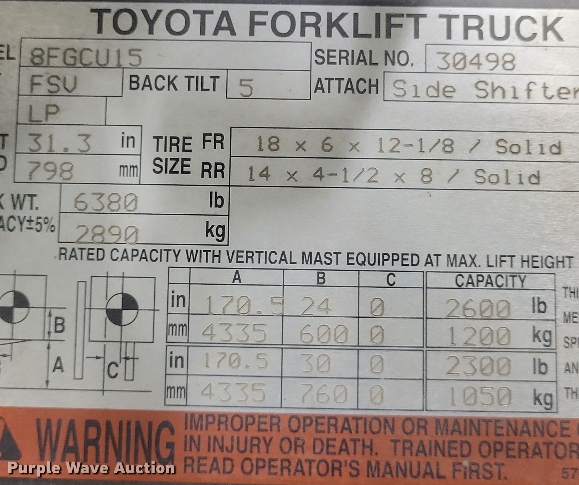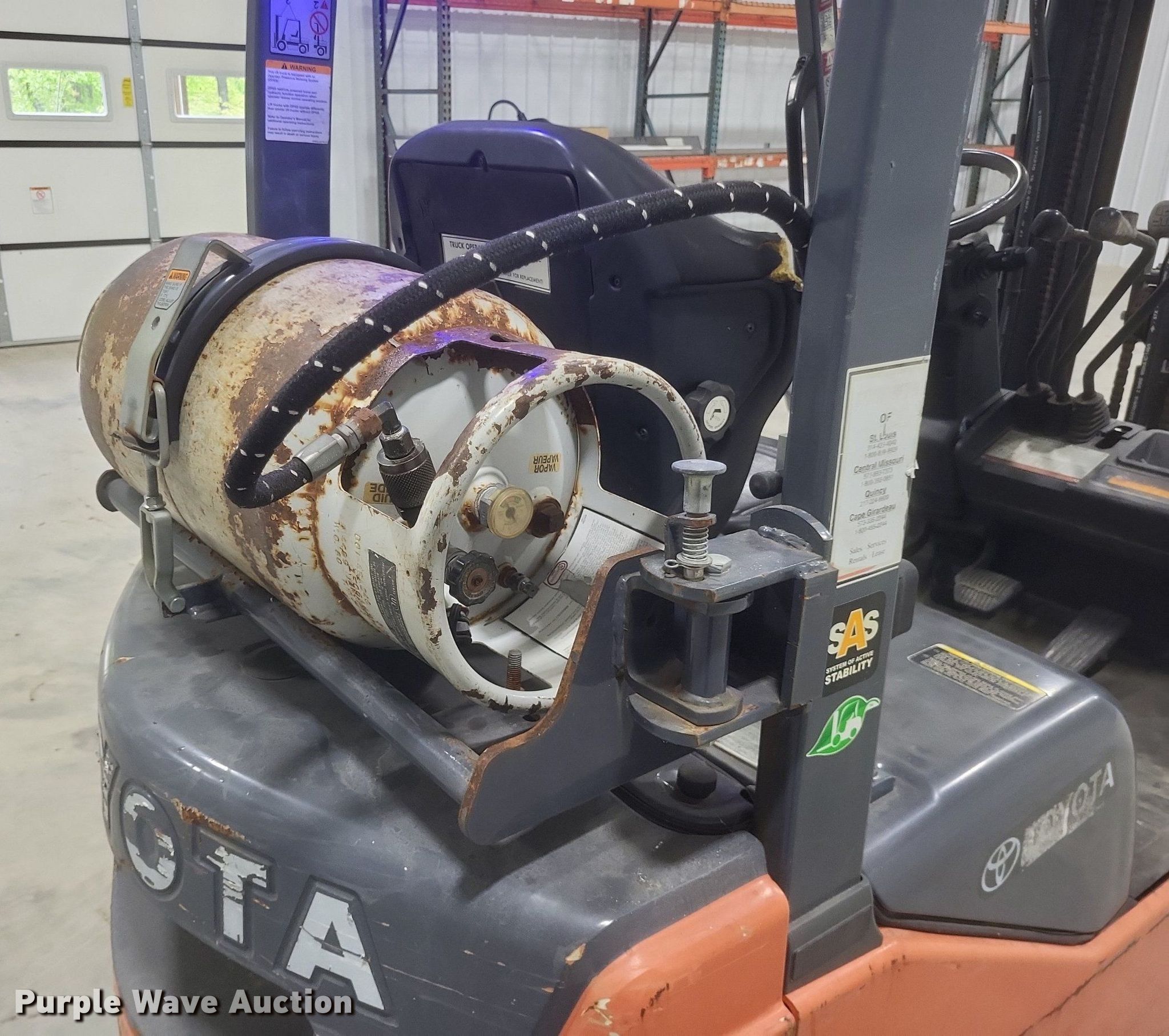 Purple Wave is selling a used Warehouse Forklift in Missouri. This item is a Toyota 8FGCU15 forklift with the following: Hours: 10,211 on meter, Serial: 30498, Unit #: 6
