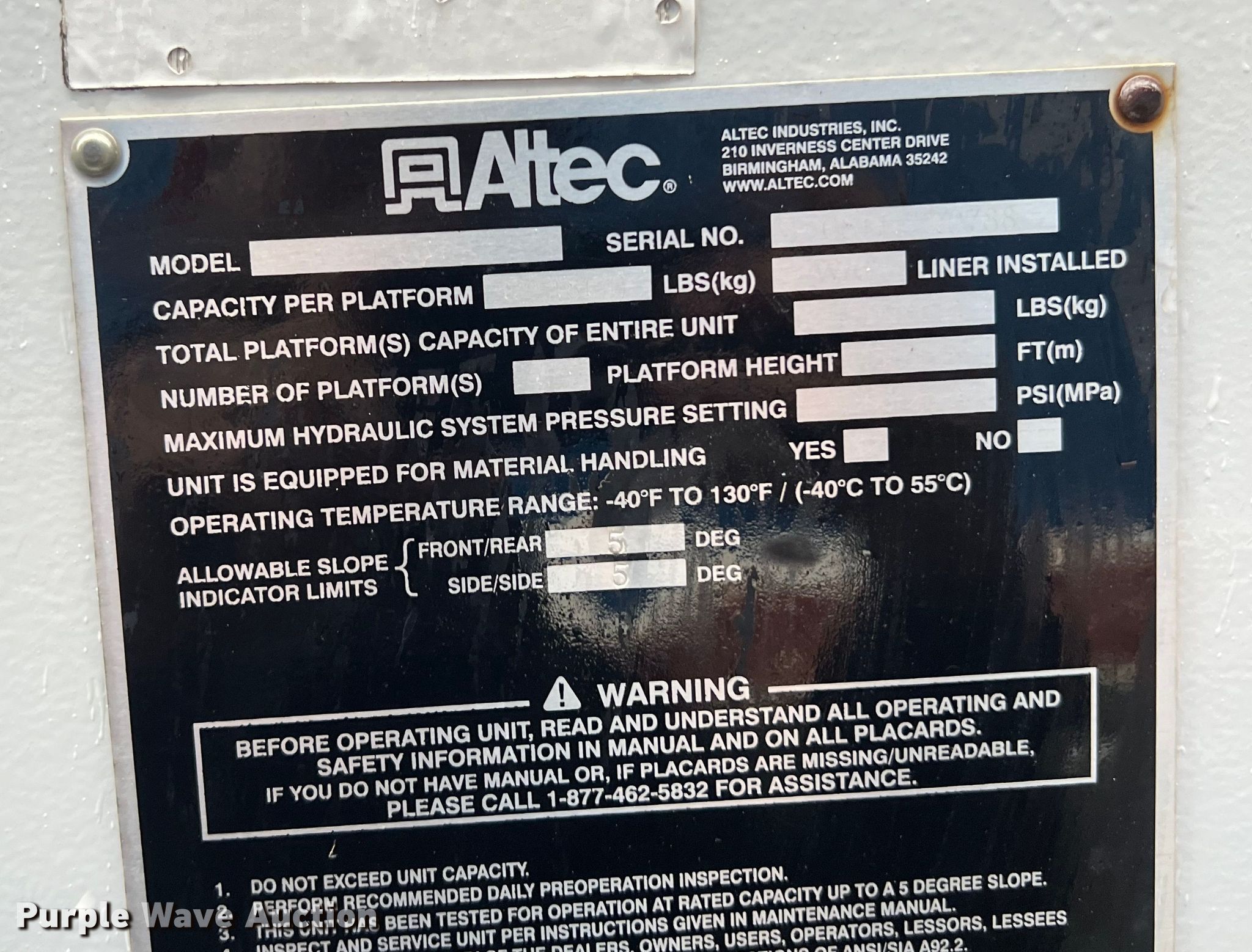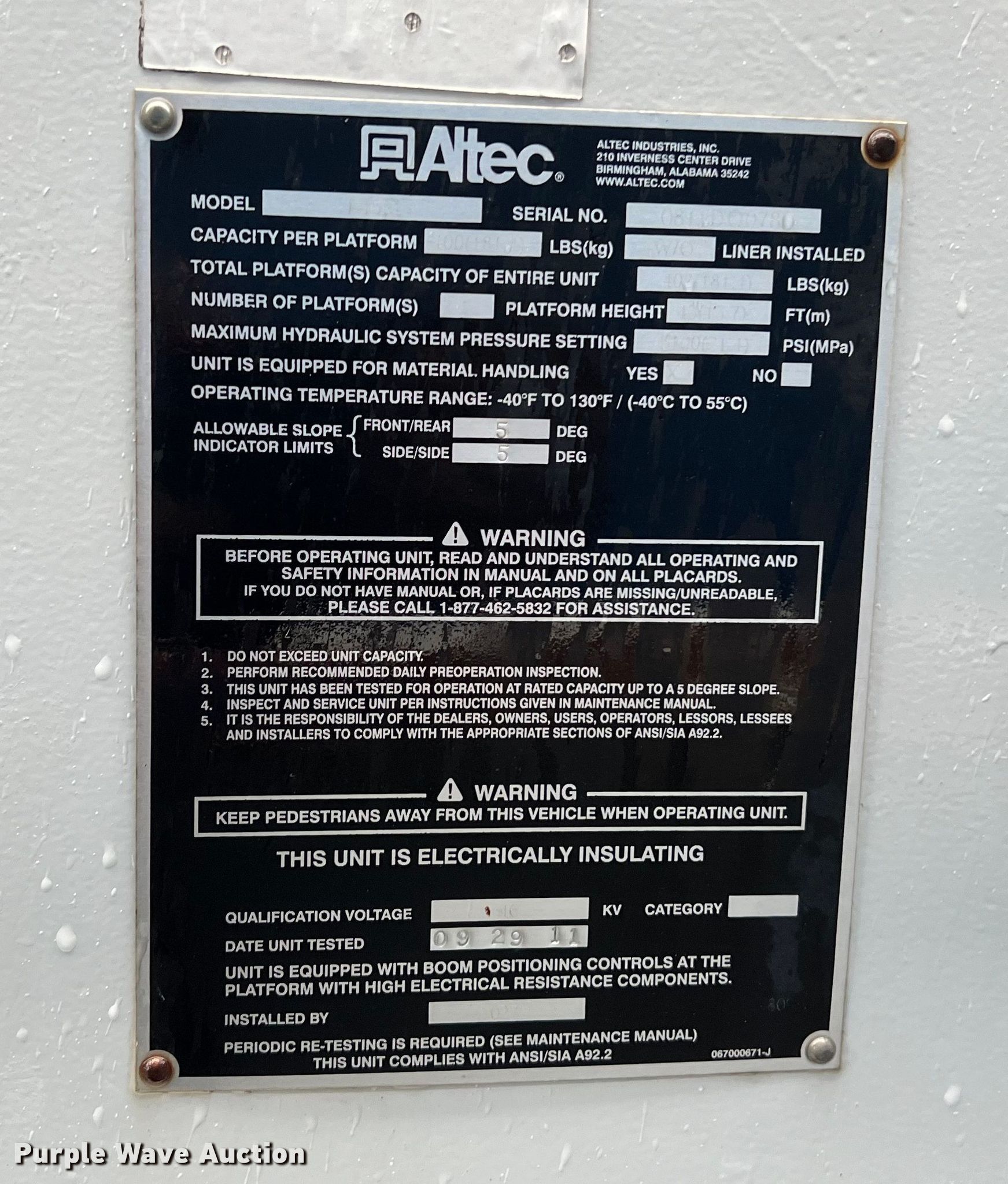 2012 International 4300 bucket truck. Miles: 149,512 on odometer, VIN: 3HAJTSKN0CL593278. Engine International MaxxForce, Displacement: 6.4L, Cylinders: 8, Fuel type: Diesel. Transmission Automatic. Chassis Axles: Single, Suspension: Spring, Brakes: Air, PTO, Wet kit, GVWR: 33,000 lbs. Interior AC, Heat, Cruise control, Auxiliary controls, Brake controller. Features Bed Altec, Serial: 27191649811011, 13' 4" L x 7' 10" W, Boom Altec L45M, Mast height: 45', Maximum lift capacity: 400 lbs, Boom type: Articulating, Insulated, Man basket, Boom controls Ground, Platform/ basket, Material handler. Tires Size: 11R22.5. Notes Windshield chipped or cracked, Dead battery, Non-operational engine Disassembled, Parts may be missing, Non-operational unit. Texas title. Fayette Electric Cooperative. La Grange, TX 78945