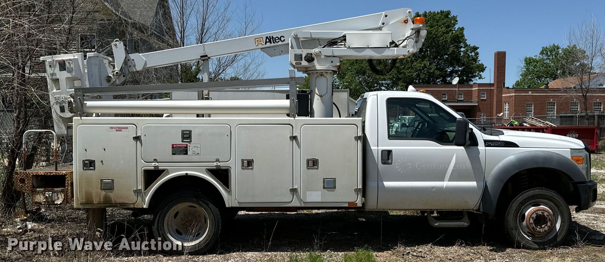 2011 Ford F450 Super Duty bucket truck. Miles: unknown, VIN: 1FDUF4GY6BEB20616. Engine Displacement: 6.7L, Cylinders: 10, Fuel type: Gas. Transmission Automatic. Chassis Axles: Single, Suspension: Spring, Brakes: Hydraulic, PTO, GVWR: 16,500 lbs, Wheelbase: 165". Interior AC, Heat, Auxiliary controls. Features Bed 13' L x 7' 10" W, Boom Altec AT235, Serial: 1110BX4383, Mast height: 35', Maximum lift capacity: 350 lbs, Boom type: Articulating, Telescopic, Man basket, Boom controls Platform/ basket.. Tires Size: 225/70R19.5. Notes Dead battery, Non-operational odometer, Non-operational unit. Kansas title. Mileage has not been verified. Odometer discrepancy will be marked on the title. Brightspeed. Fredonia, KS 66736