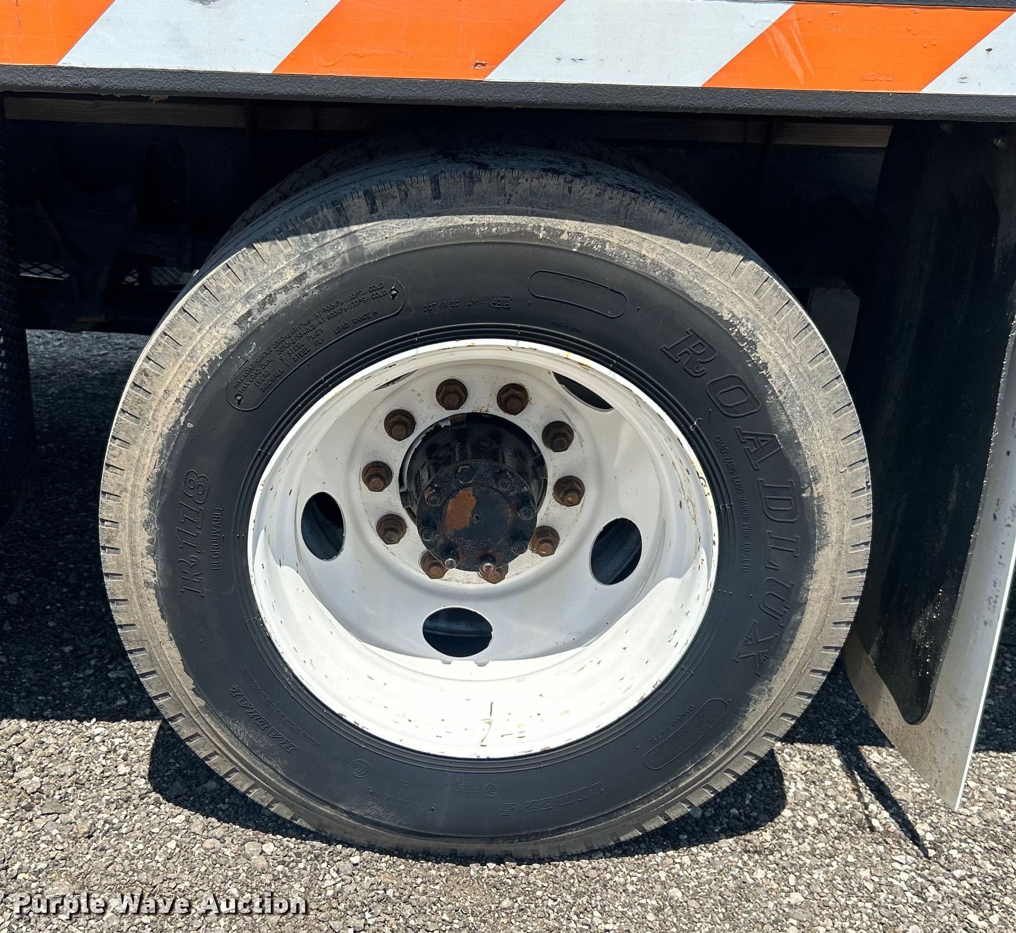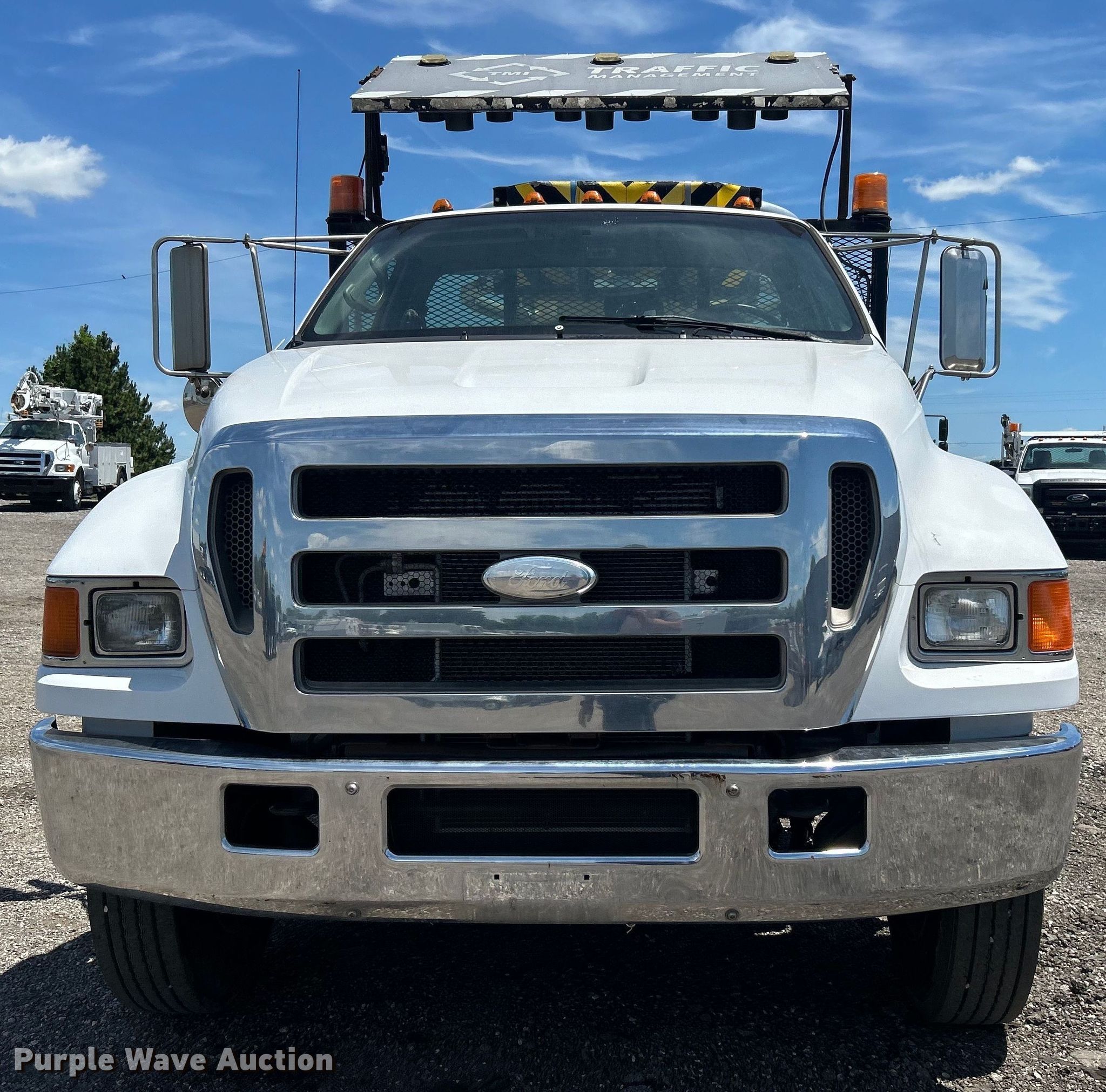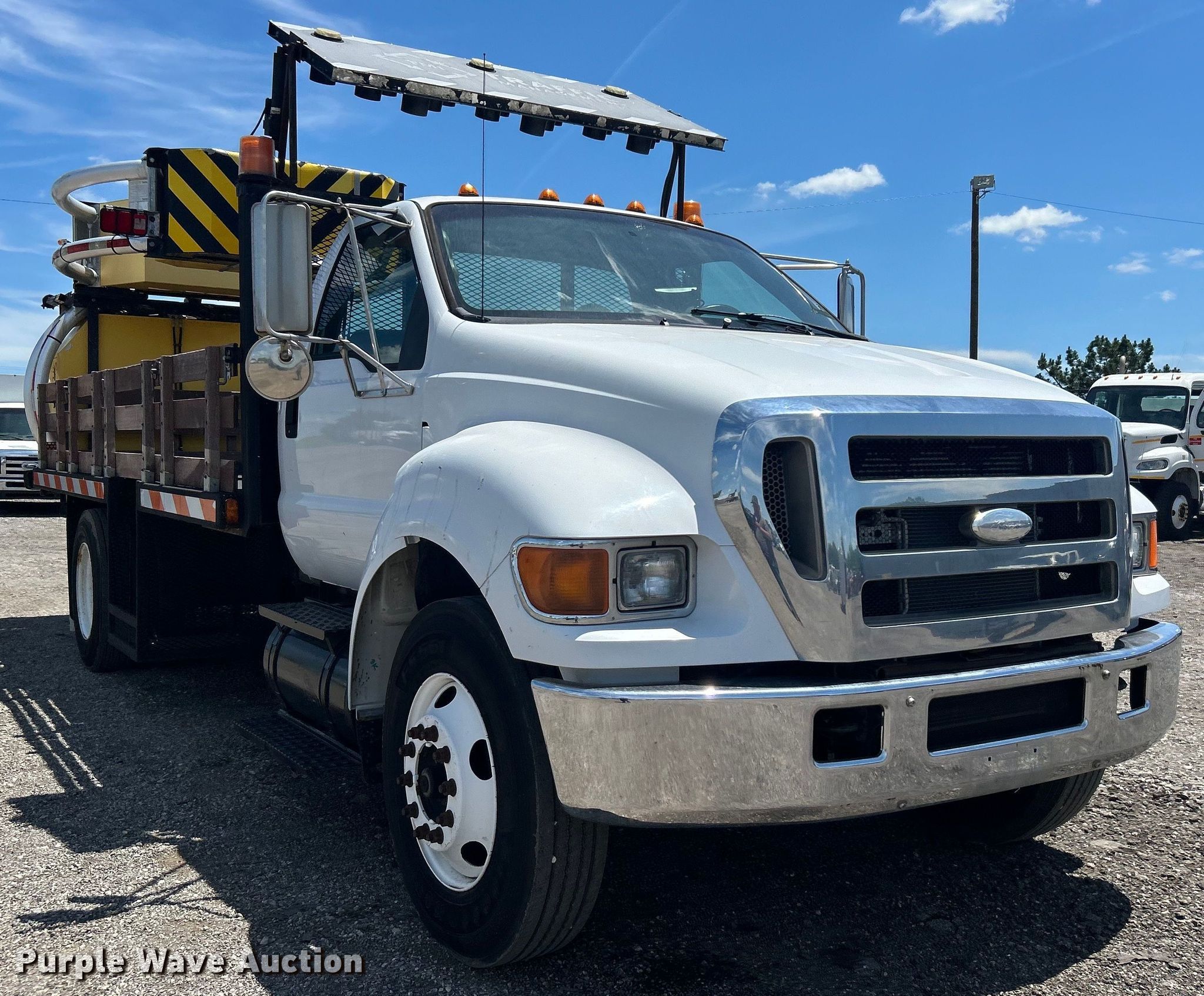 This 2007 Ford F650 Super Duty flatbed truck with crash attenuator will sell to the highest bidder regardless of price.
