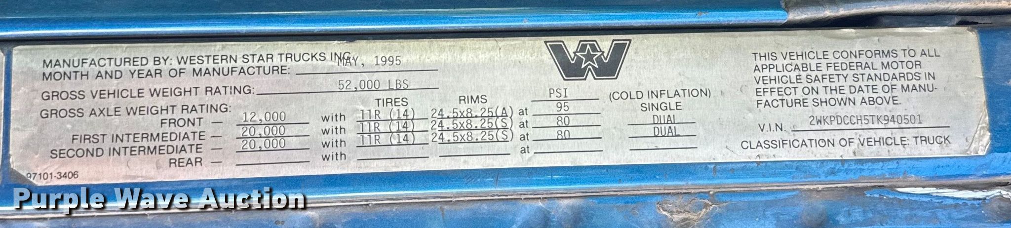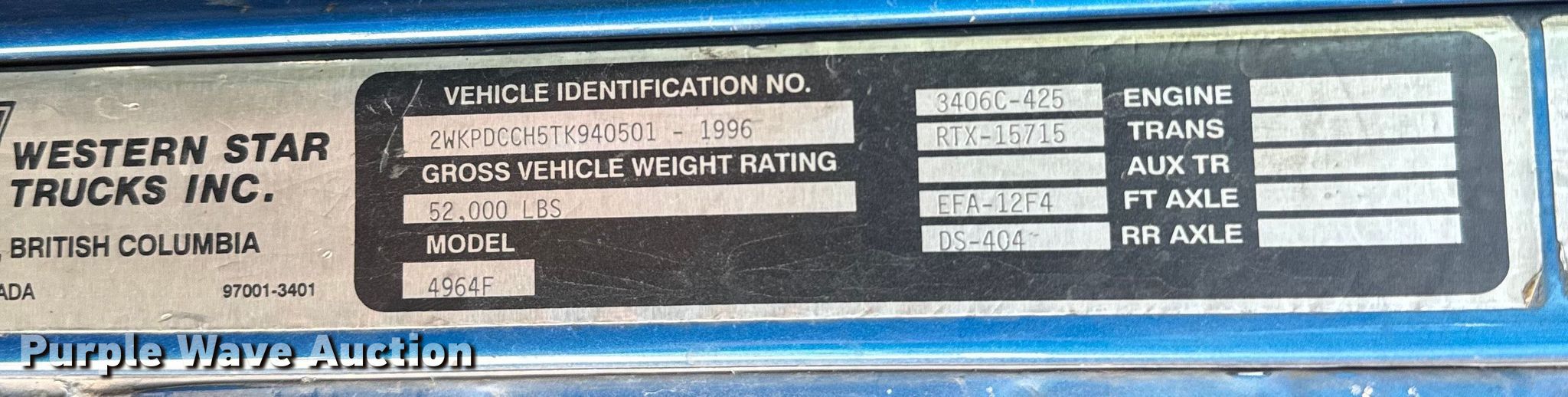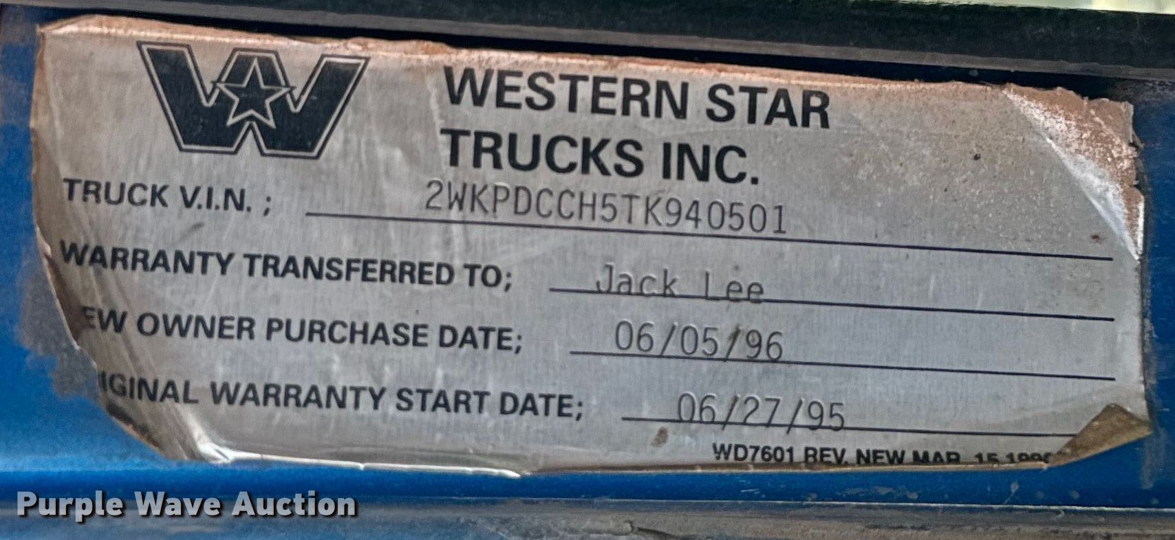 Purple Wave is selling a used Construction Dump Truck in Kansas. This item is a 1996 Western Star 4900 dump truck with the following: Miles: 126,196 on odometer, VIN: 2WKPDCCH5TK940501