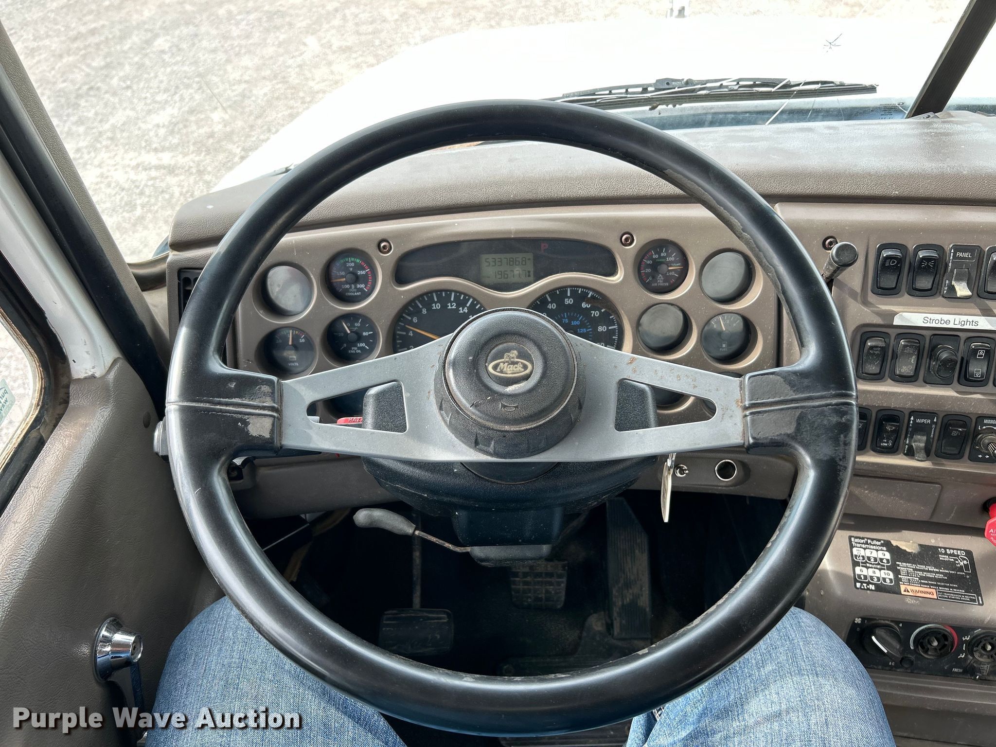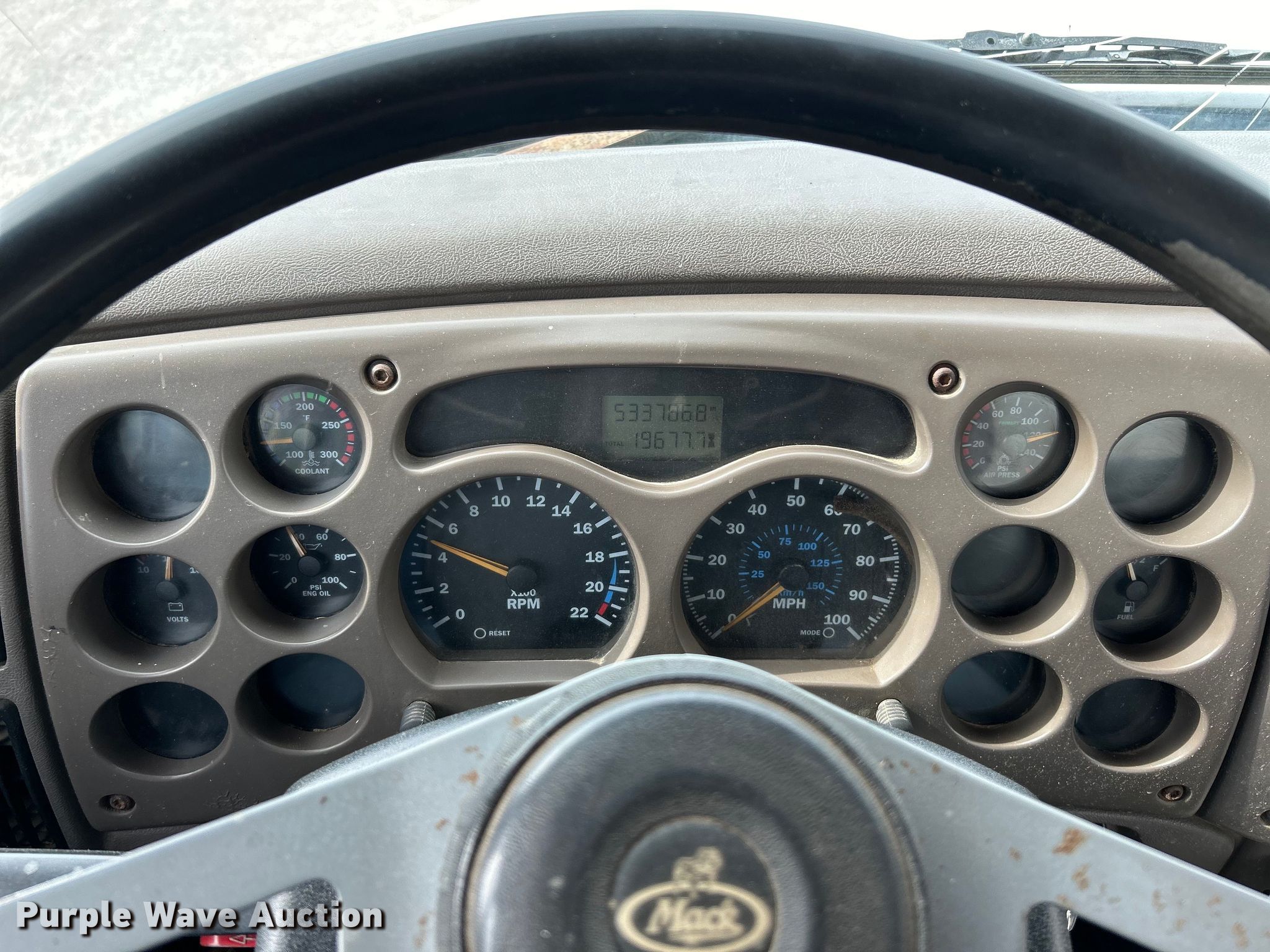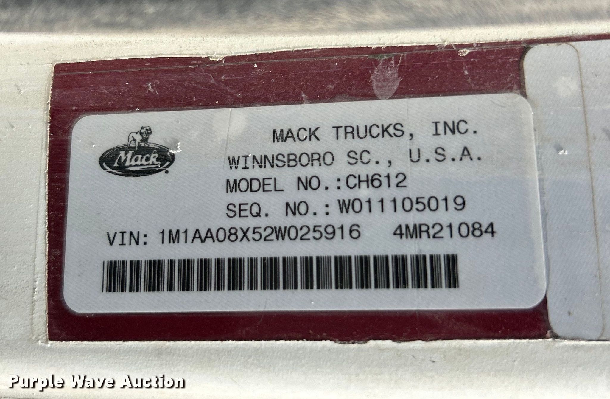 2002 Mack CH612 water truck. Miles: 533,787 on odometer, Hours: 19,678 on meter, VIN: 1M1AA08X52W025916. Engine Displacement: 12.0L, Cylinders: 6, Fuel type: Diesel. Transmission Eaton Fuller, Manual, Speed: 10. Chassis Axles: Tandem, Suspension: Camelback, Brakes: Air, PTO. Interior AC, heat, Heated mirrors, Cruise control. Features Bed / tank 16' L x 93" W, Side discharge, Hose reel, Top fill, Rear outlet: 3". Tires Front: 12R22.5, Rear: 295/75R22.5. Notes Windshield chipped or cracked, Oil leak. Illinois title. Title distribution may be delayed up to 14 days from verification of funds. G.A.S.A. Leasing Inc.. Pontoon Beach, IL 62040
