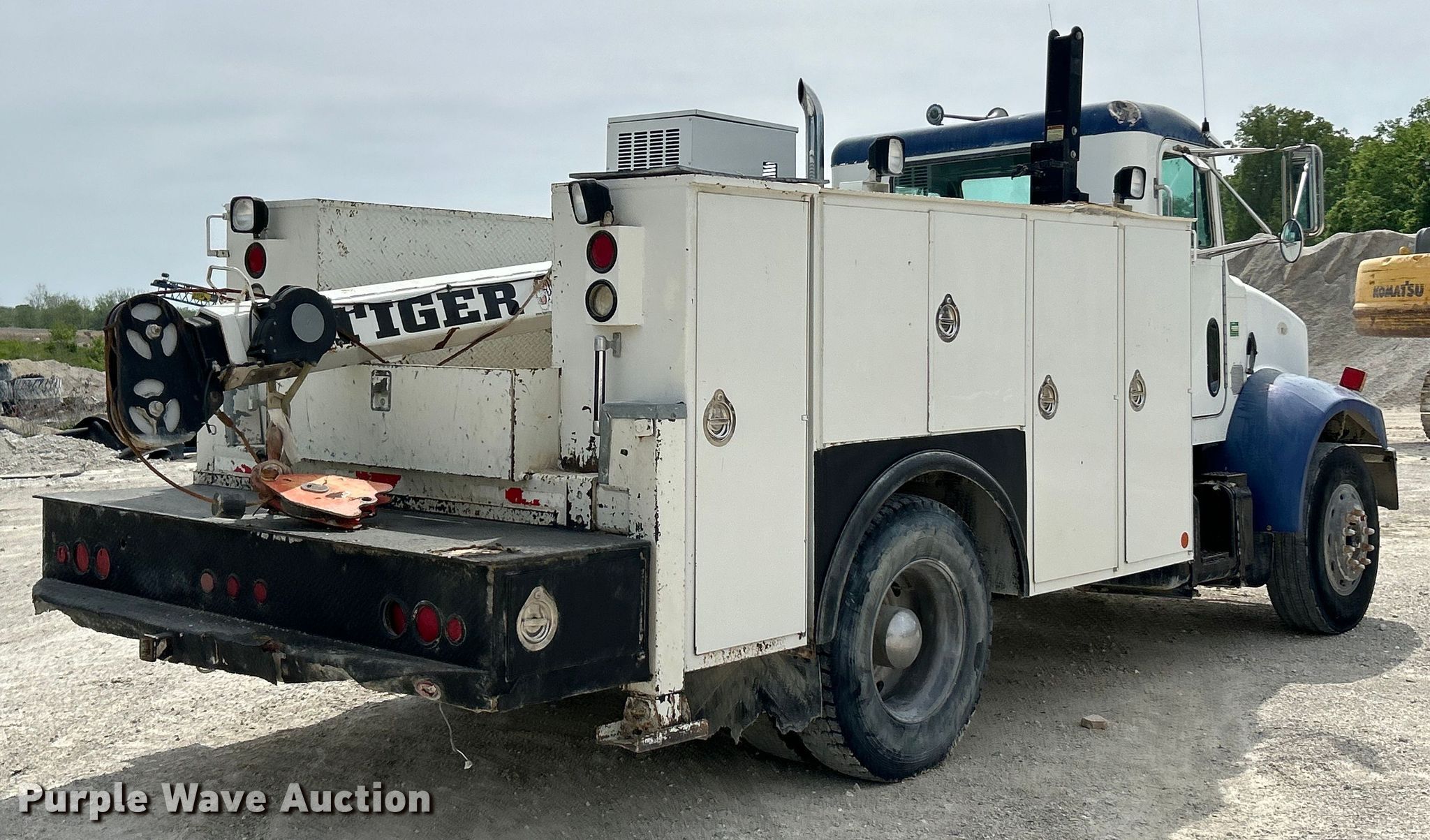 2001 Peterbilt PB330 utility / service truck. Miles: 308,487 on odometer, Hours: 20,445 on meter, VIN: 2NPNHD7X01M566858. Engine Caterpillar 3126, Displacement: 7.2L, Cylinders: 6, Fuel type: Diesel. Transmission Manual, Speed: 6. Chassis Axles: Single, Suspension: Spring, Brakes: Air, PTO, GVWR: 33,000 lbs. Interior AC, Heat, Heated mirrors, Cruise control. Features Bed Dakota Bodies, 11' L x 99" W, Torch bottle rack, Air compressor American Eagle 70P, Crane Tiger 1061 Auto II Speed. Tires Size: 11R22.5. Notes Unknown operating condition of crane and air compressor. Missouri title. Title distribution may be delayed up to 14 days from verification of funds. Bedrock Quarry LLC. Troy, MO 63379