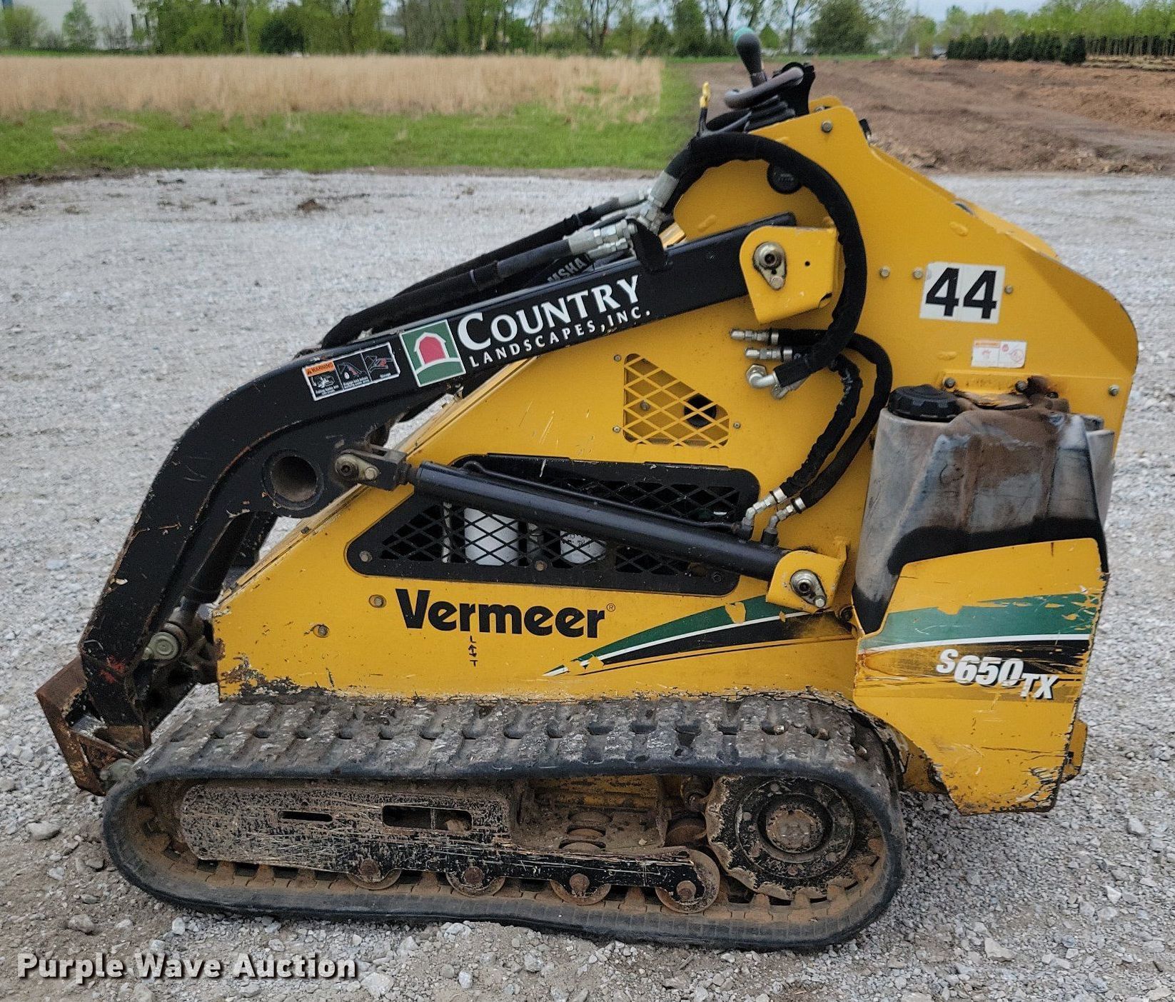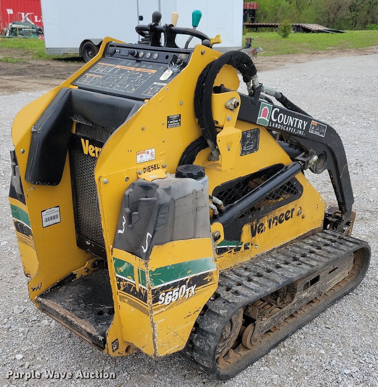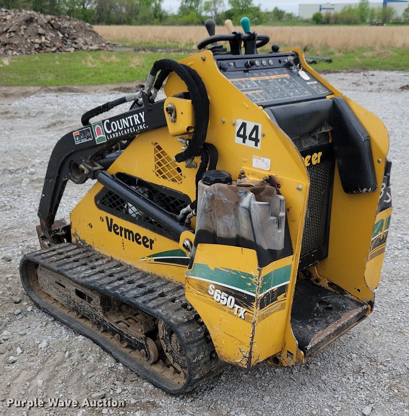 2013 Vermeer S650TX compact utility loader. Serial: 1VRB0704XD1000558. Engine Kubota, Cylinders: 3, Fuel type: Diesel, HP: 25. Transmission Hydrostatic. Operators station Bucket control: Hand. Features Auxiliary hydraulics, Quick coupler: Manual. Tracks Width: 9". Notes Left hand drive motor issues, weak. Country Landscapes, Inc.. Ames, IA 50010