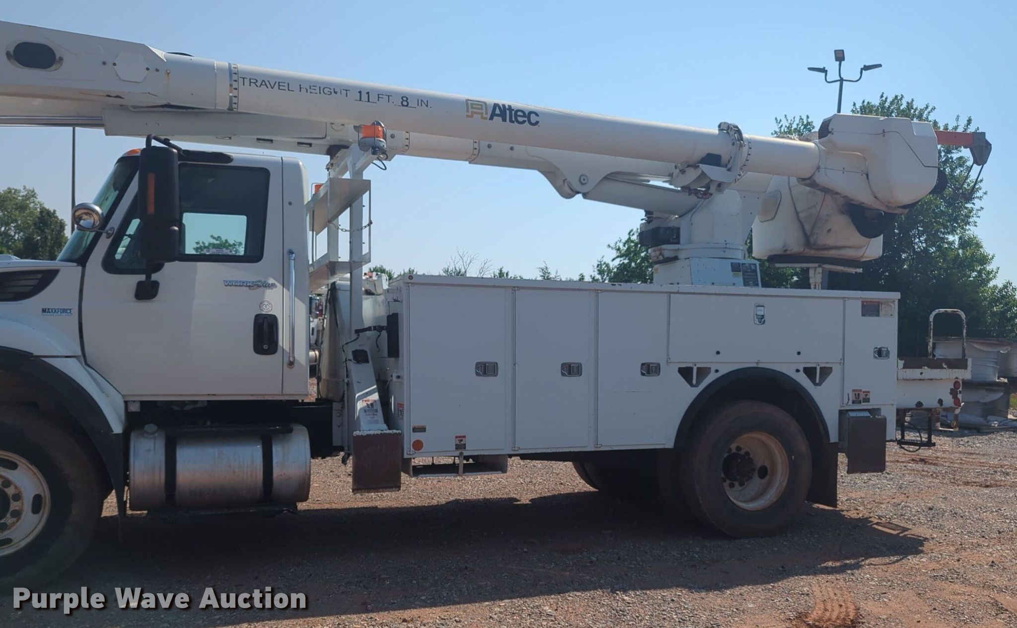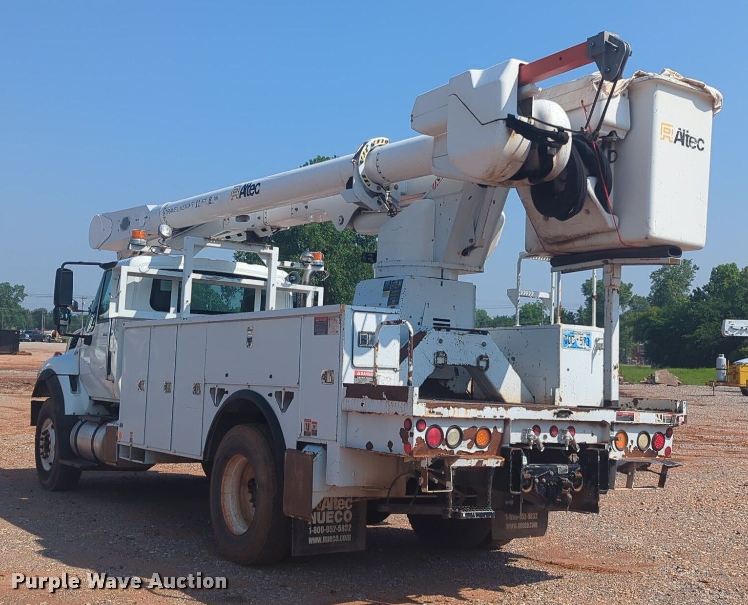 2012 International WorkStar 7300 bucket truck. Miles: 88,952 on odometer, Hours: 10,123 on meter, VIN: 1HTWCAAR9CJ622702, Unit #: 307. Engine International MaxxForce DT, Displacement: 7.6L, Cylinders: 6, Fuel type: Diesel. Transmission Automatic. Chassis Differential lock, Axles: Single, Suspension: Spring, Brakes: Air, PTO, GVWR: 37,000 lbs. Interior AC, Heat, Cruise control. Features Bed Altec, 186" L x 96" W, Boom Altec AM55, Serial: 0911DM3523, Boom length: 26', Maximum lift capacity: 700 lbs, Maximum lift height: 55', Boom type: Articulating, Man basket, Boom controls Ground, Platform/ basket, Material handler. Tires Size: 11R22.5. Oklahoma title. Title distribution may be delayed up to 30 days from verification of funds. Imperium Utility Services. Oklahoma City, OK 73149