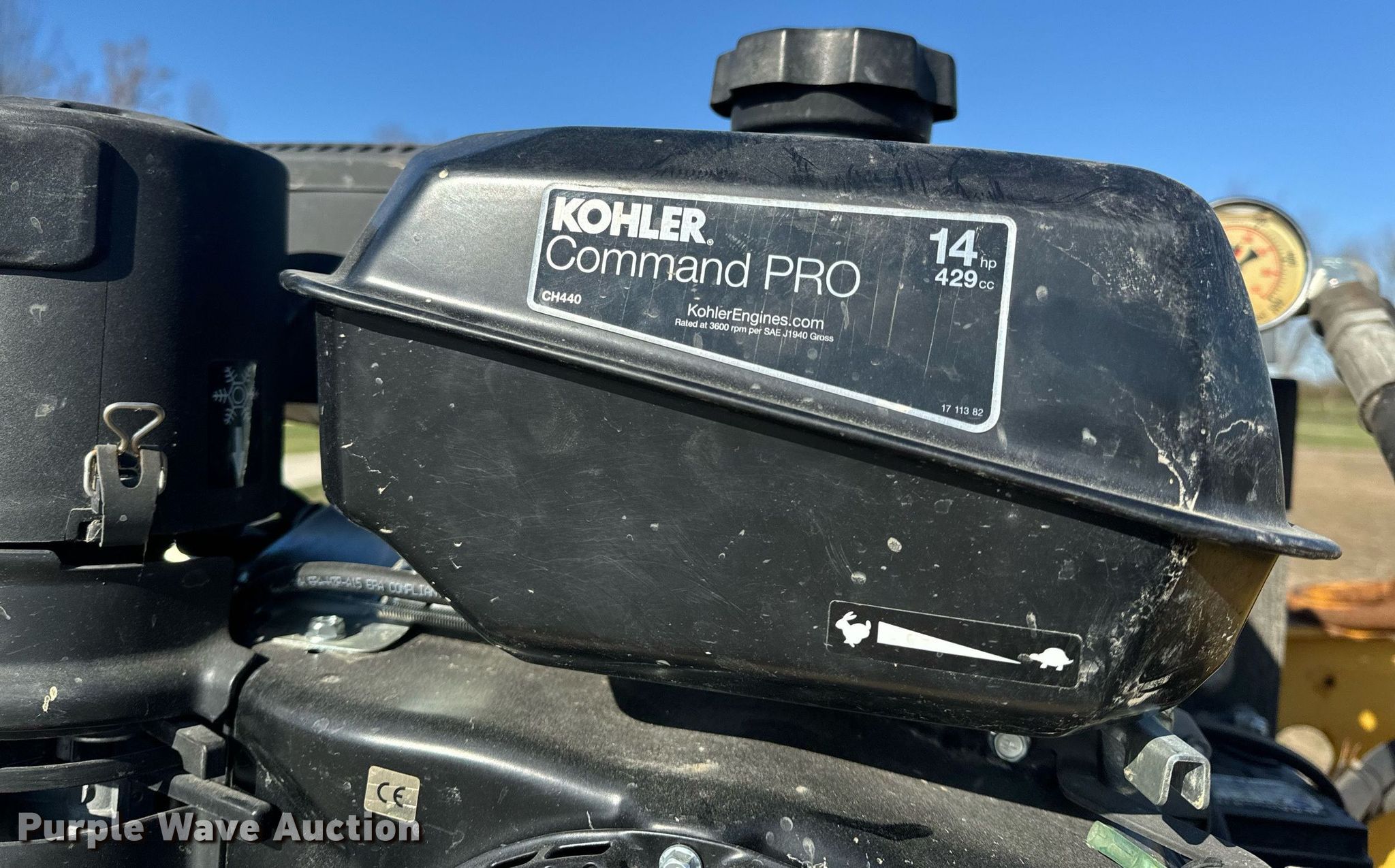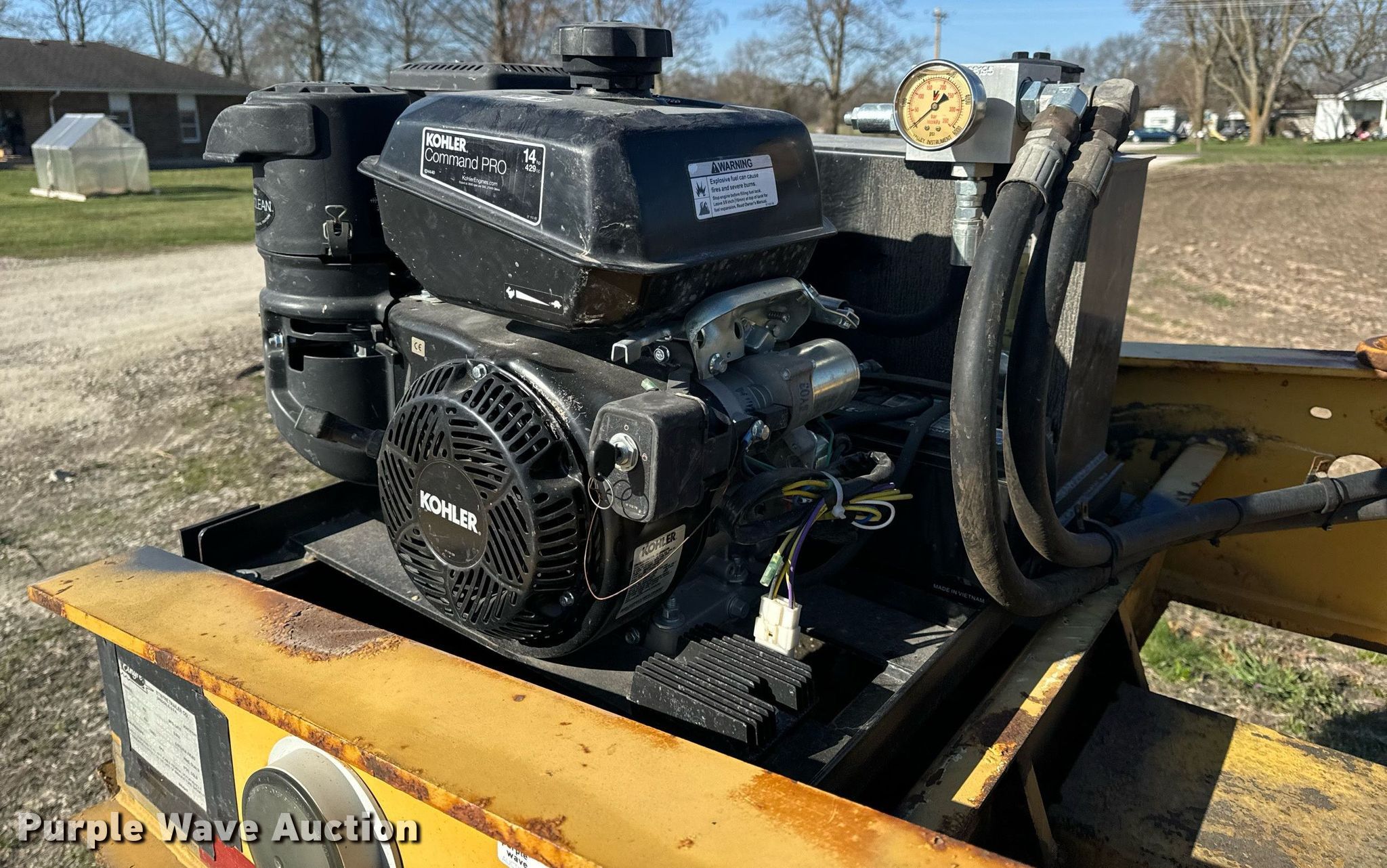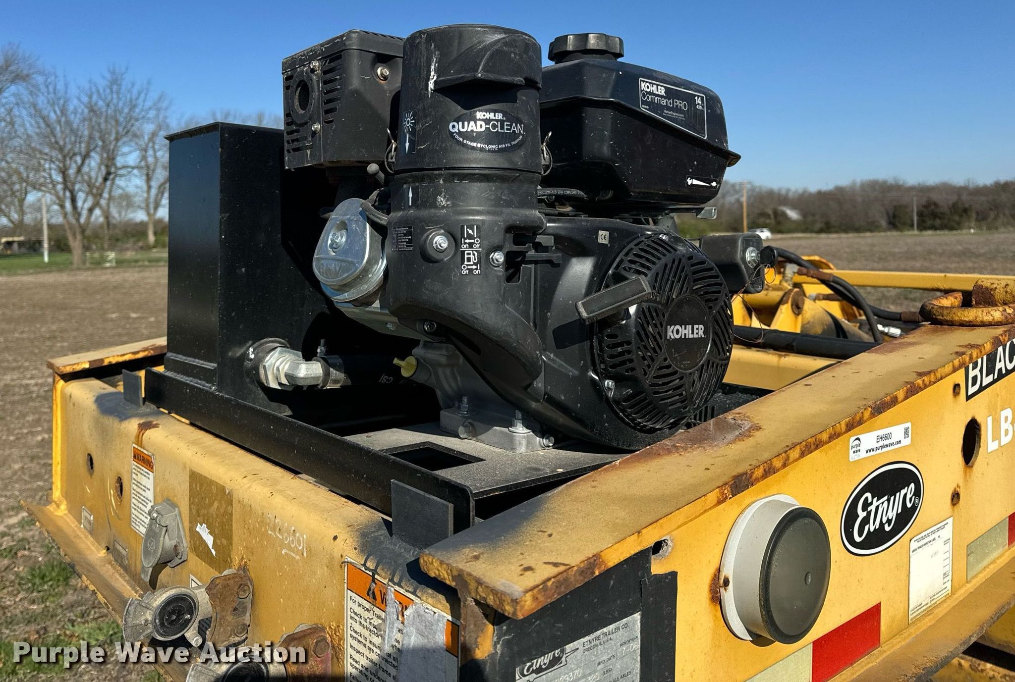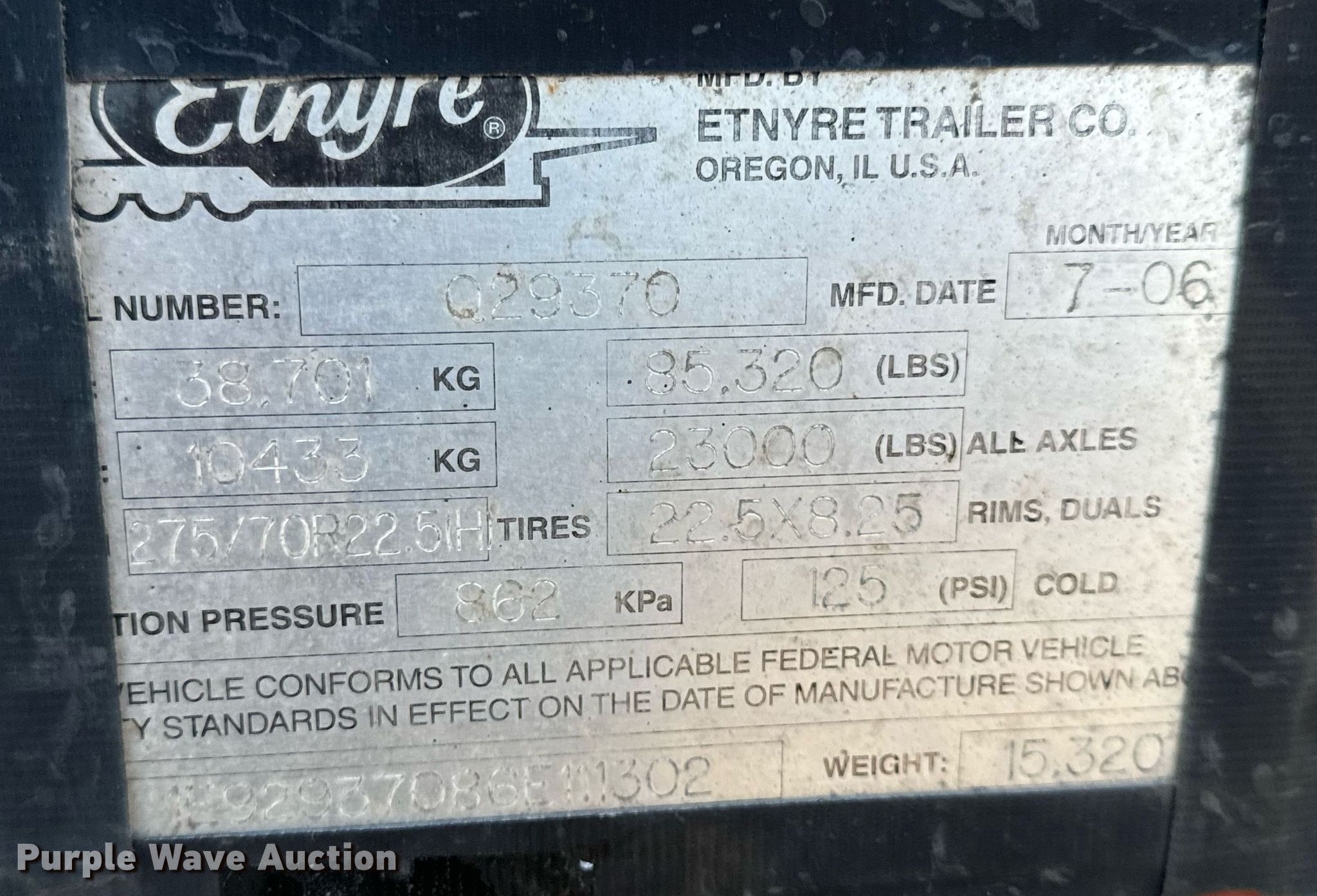 2006 Etnyre BlackHawk Q29370 lowboy equipment trailer. VIN: 1E92937086E111302. Dimensions Overall: 46' L x 102" W, Deck: 24' L x 102" W, Ramps: Manual Length: 26". Features Deck type: Wood, Outriggers: Swing-out Board size: 12", Neck type: Detachable, Self-contained hydraulics, Kohler Command Pro engine Electric Start, Cylinders: 1, Fuel type: Gas. Chassis Suspension: Air, Brakes: Air, Axles: Tandem, GVWR: 85,320 lbs, GAWR: 23,000 lbs. Tires Aluminum wheels, Size: 275/70R22.5. Texas title. Title distribution may be delayed up to 30 days from verification of funds. Hartsburg, MO 65039