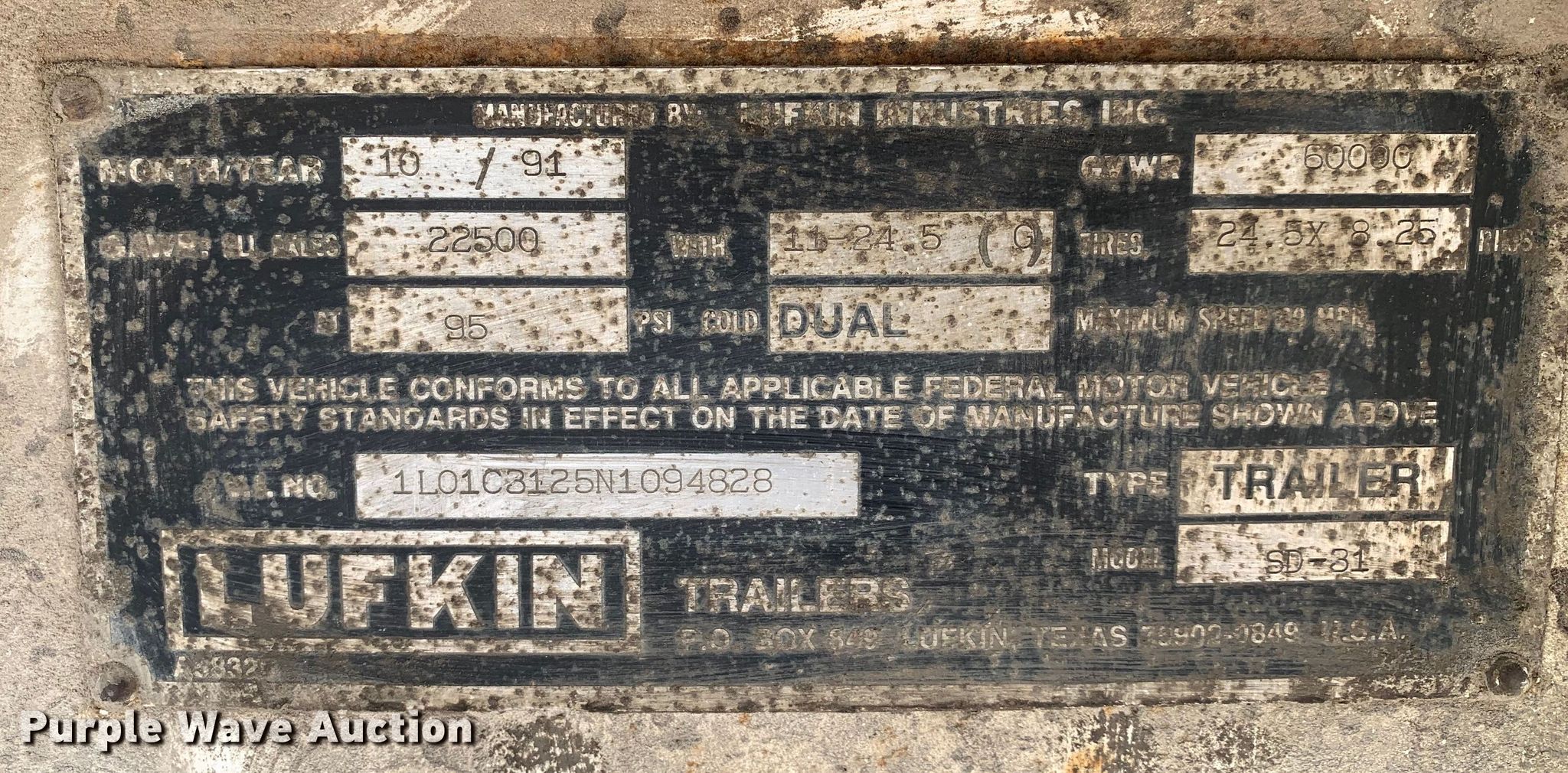 1992 Lufkin SD-31 end dump trailer. VIN: 1L01C3125N1094828, Unit #: 01. Dimensions Overall: 31' L x 7' 11" W, Body: 30' 10" L x 7' 11" W, Side height: 3' 6", Sideboard height: 6". Features Body type: Steel, Ram: Single, End gate: Air operated. Chassis Landing gear: Dual, Suspension: Spring, Brakes: Air, Axles: Tandem, GVWR: 60,000 lbs, GAWR: 22,500 lbs. Tires Steel wheels, Size: 11R24.5. Notes Truck not included. Texas title. Title distribution may be delayed up to 14 days from verification of funds. Navarro County, TX. Corsicana, TX 75110