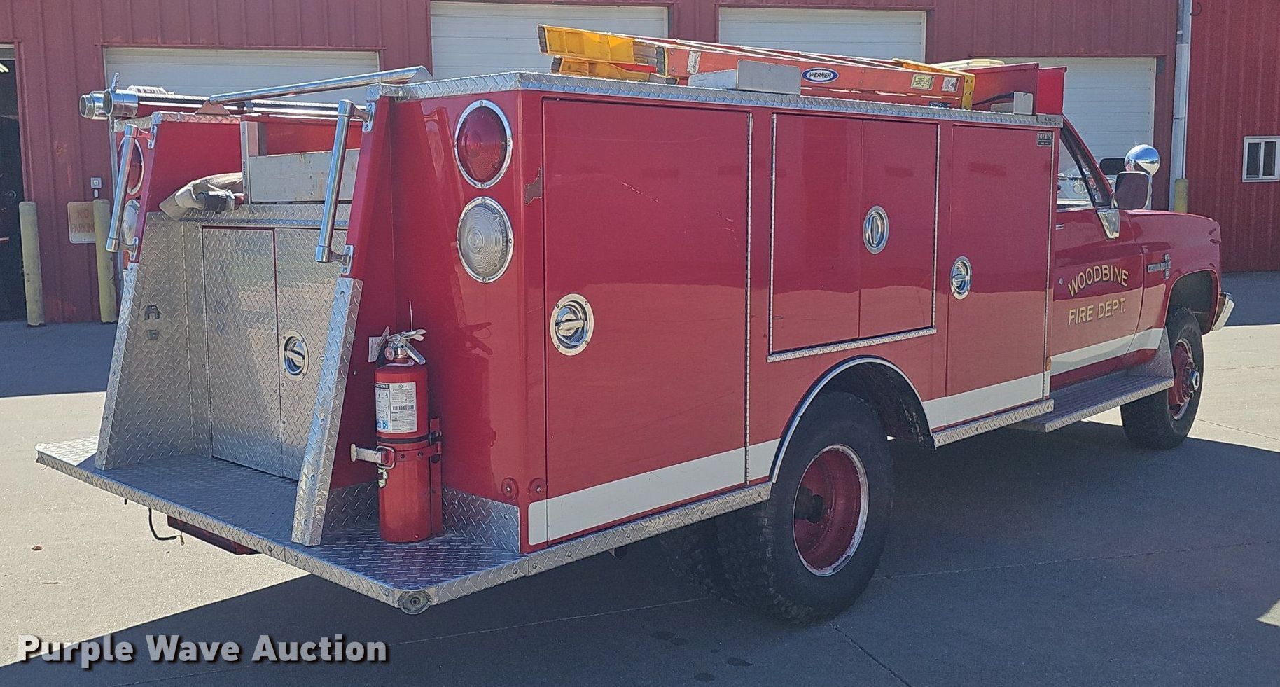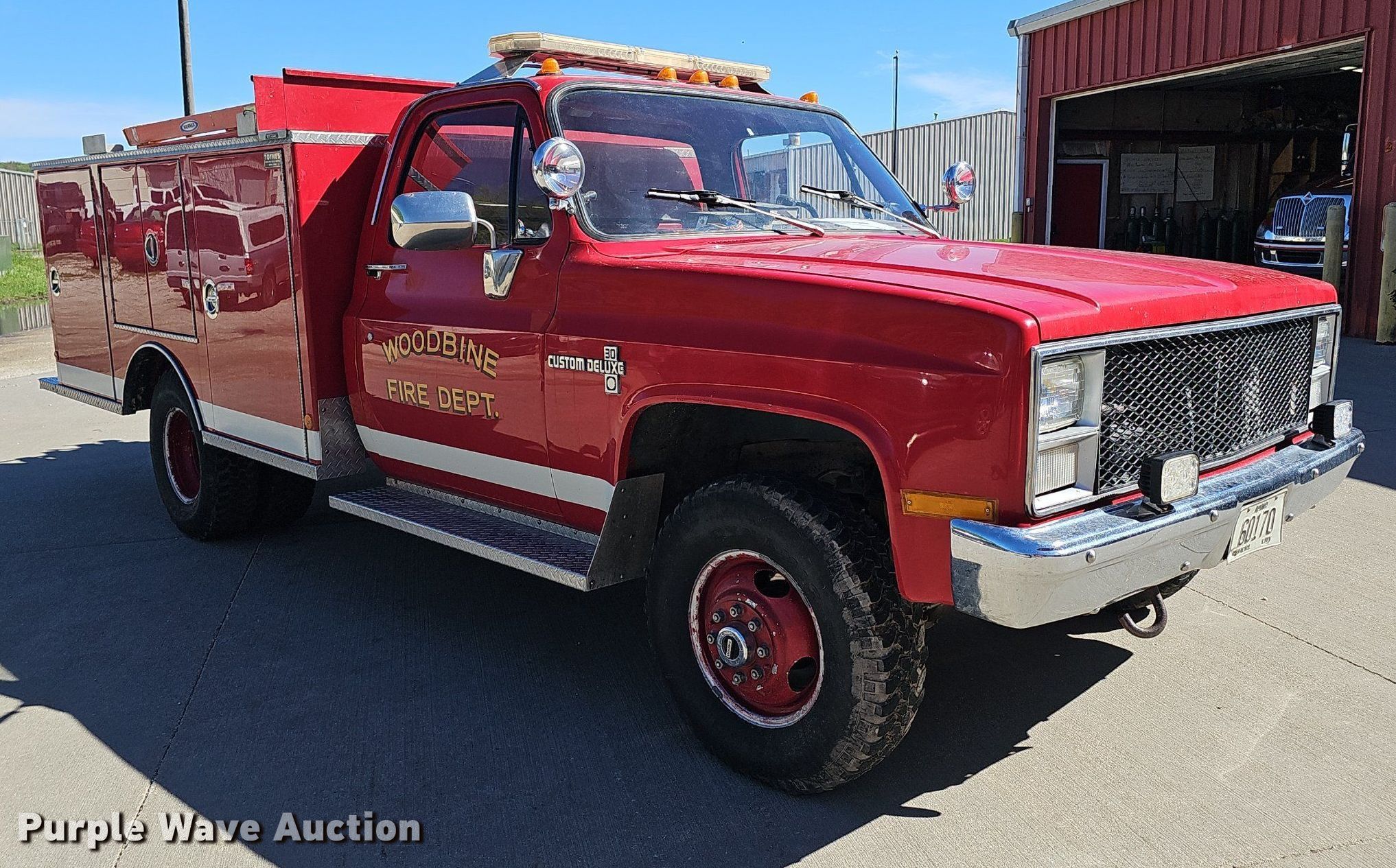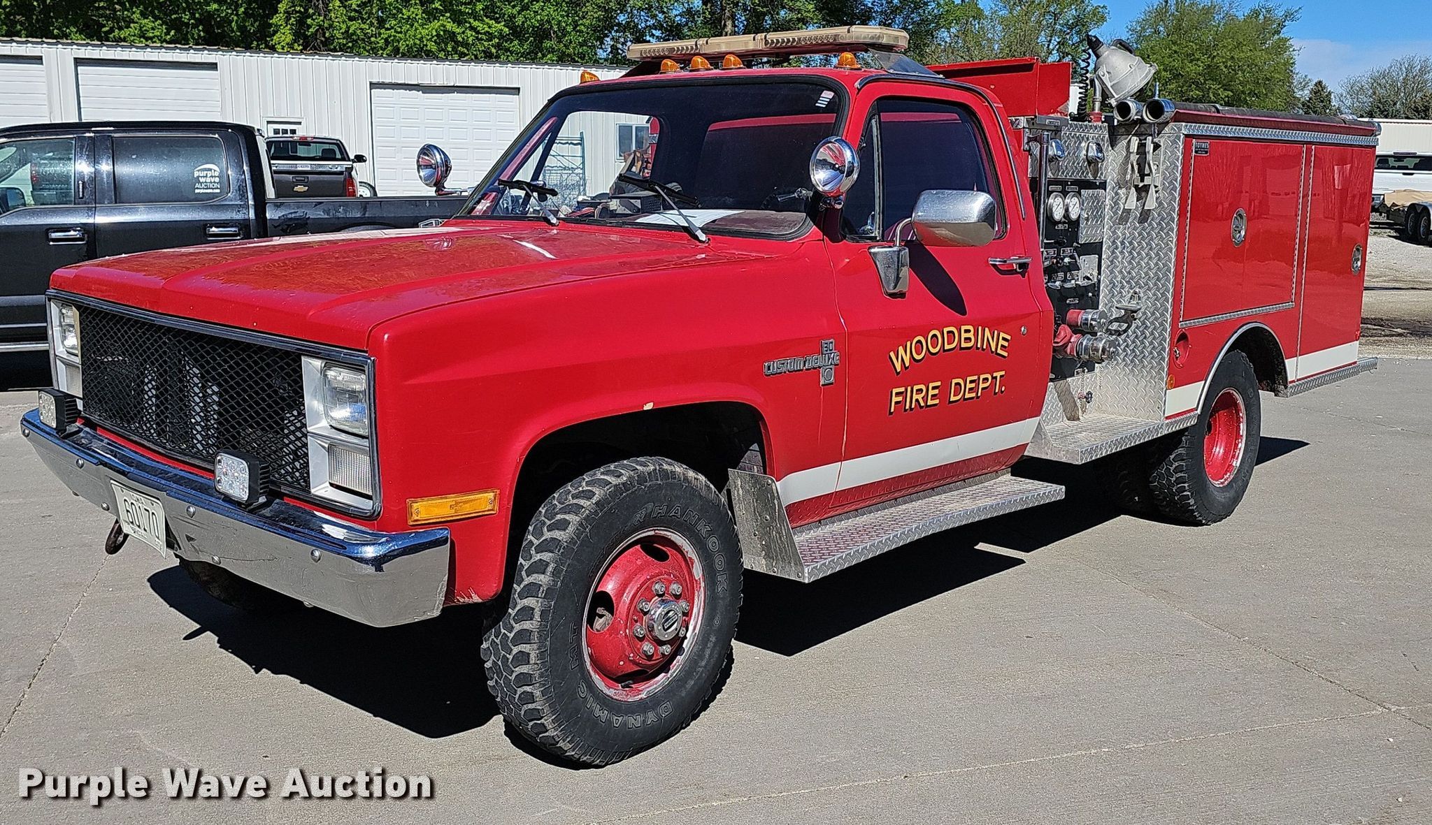 Purple Wave is selling a used Fire Truck or Emergency Vehicle in Iowa. This item is a 1983 Chevrolet Custom Deluxe K30 brush fire truck with the following: Miles: 15,018 on odometer, VIN: 1GBJK34W2DV118417