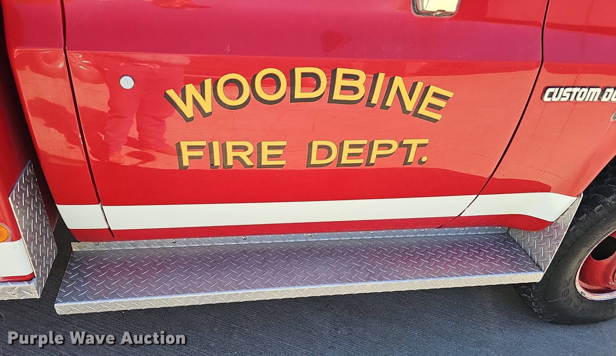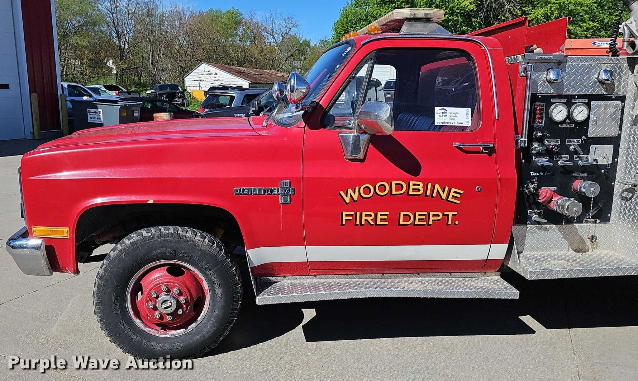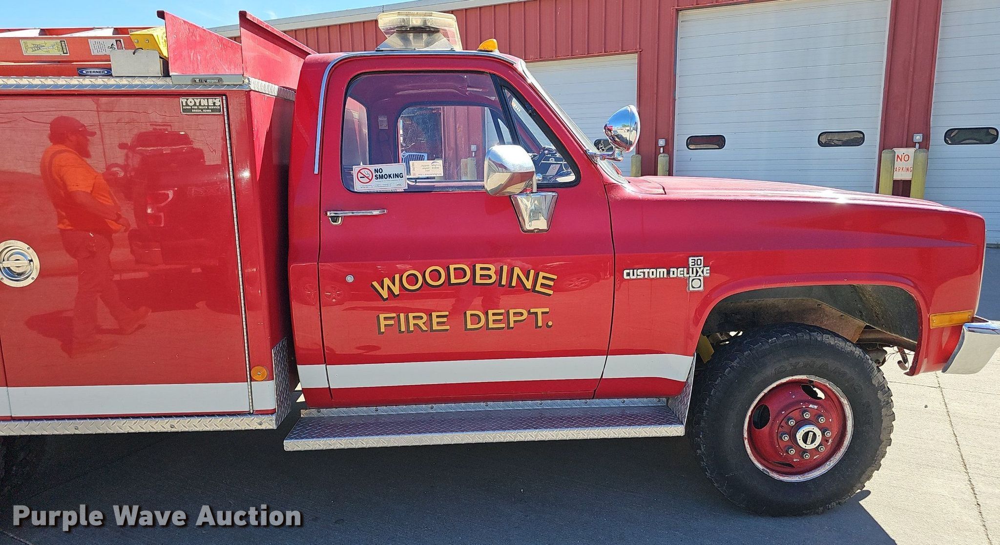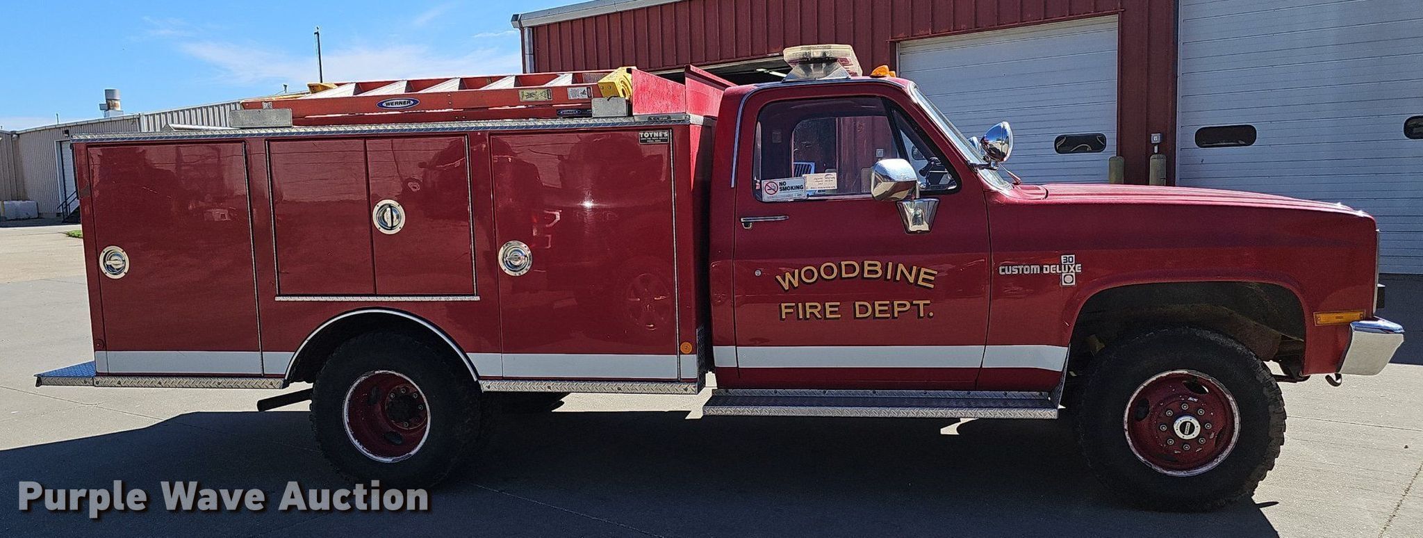 1983 Chevrolet Custom Deluxe K30 brush fire truck. Miles: 15,018 on odometer, VIN: 1GBJK34W2DV118417. Engine Displacement: 7.4L V8 OHV, Cylinders: 8, Fuel type: Gas. Transmission Manual, Speed: 4. Chassis Four wheel drive, Axles: Single, Suspension: Spring, Brakes: Hydraulic. Interior AC, Heat. Features Fire truck body Toyne's, 11' L x 87" W, Pump, PA/ siren controls. Tires Size: LT235/85R16. Notes Contents not included. Iowa title. Seller is a government entity who will be assigning and distributing the title. Please contact the seller for distribution questions. Woodbine Fire Department. Woodbine, IA 51579