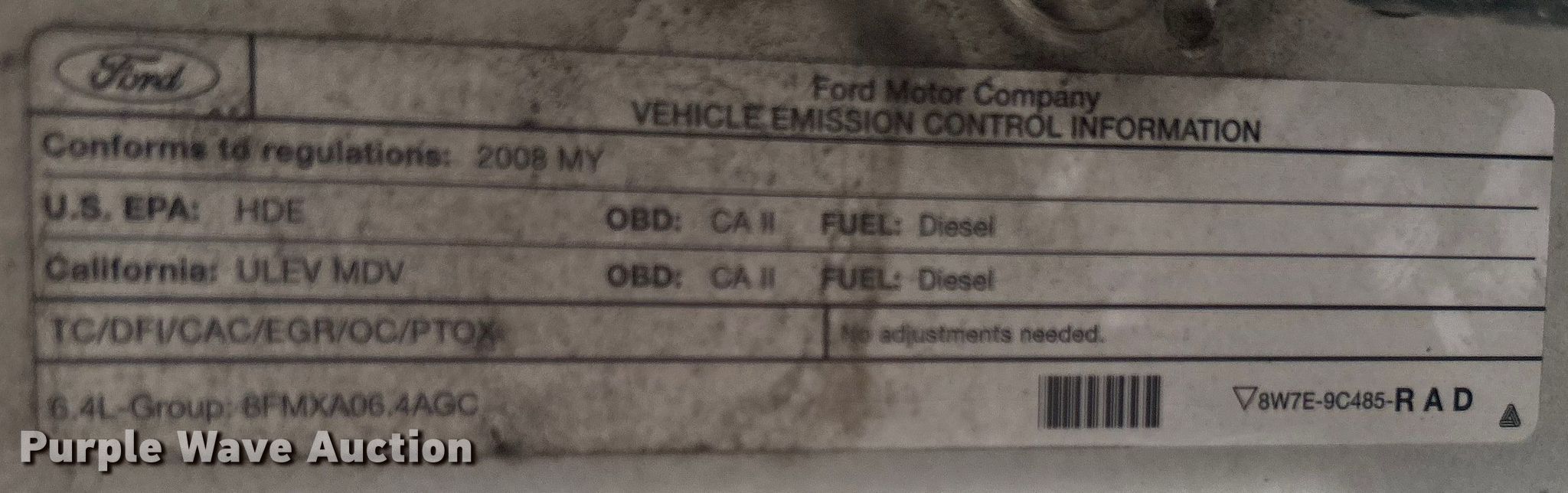 2008 Ford F250 Super Duty pickup truck. Miles: 102,127 on odometer, VIN: 1FTSF20RX8EE54451, Unit #: 625. Engine Displacement: 6.4L V8 OHV, Cylinders: 8, Fuel type: Diesel. Transmission Automatic. Interior AC, Heat. Tires Size: LT245/75R17. Oklahoma title. Seller is a government entity who will be assigning and distributing the title. Please contact the seller for distribution questions. Title distribution may be delayed up to 30 days from verification of funds. City of Tulsa. 108 N Trenton Ave. Tulsa, OK 74120