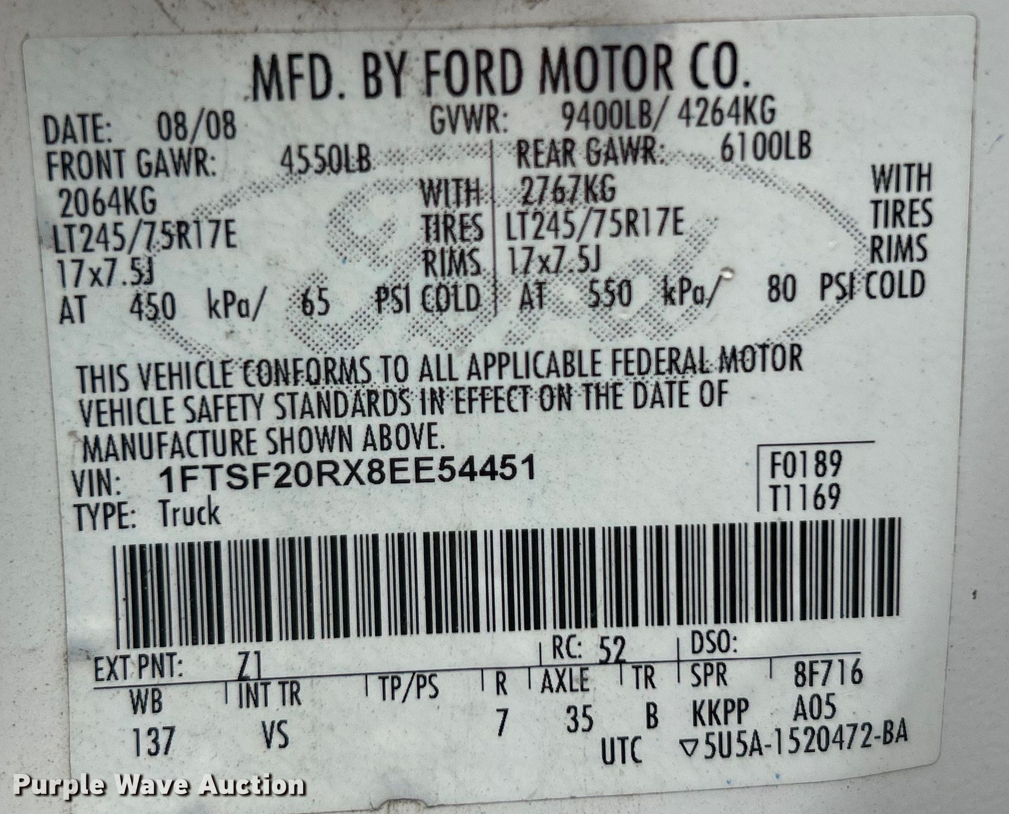 Purple Wave is selling a used 3/4 or 1 Ton Pickup or Van in Oklahoma. This item is a 2008 Ford F250 Super Duty pickup truck with the following: Miles: 102,127 on odometer, VIN: 1FTSF20RX8EE54451, Unit #: 625