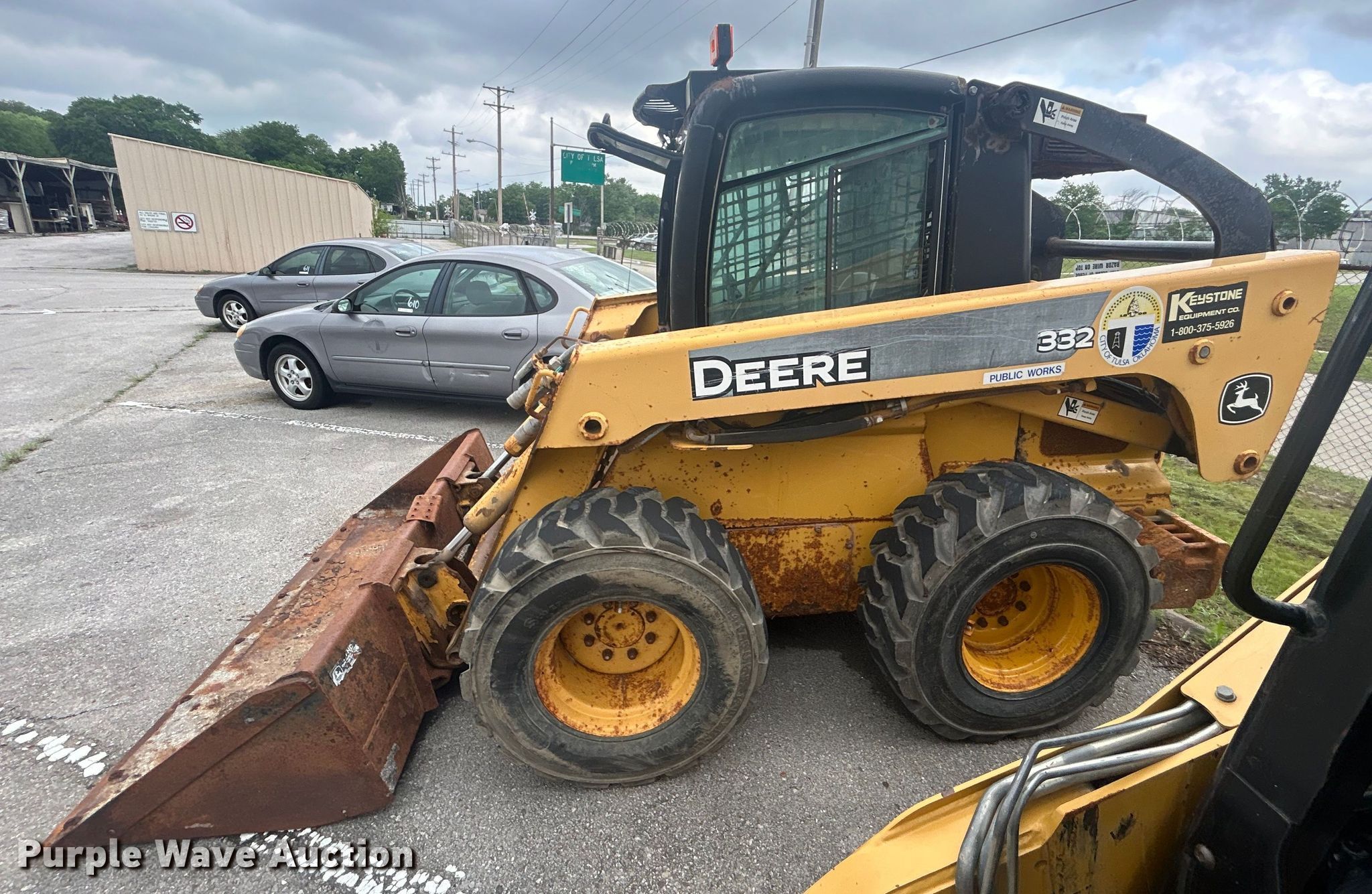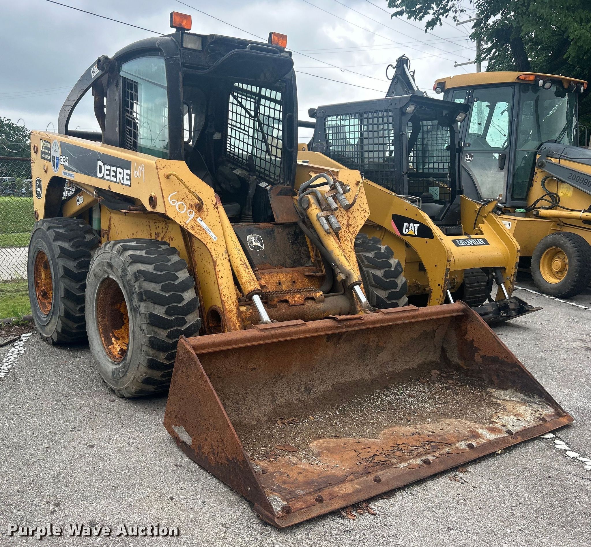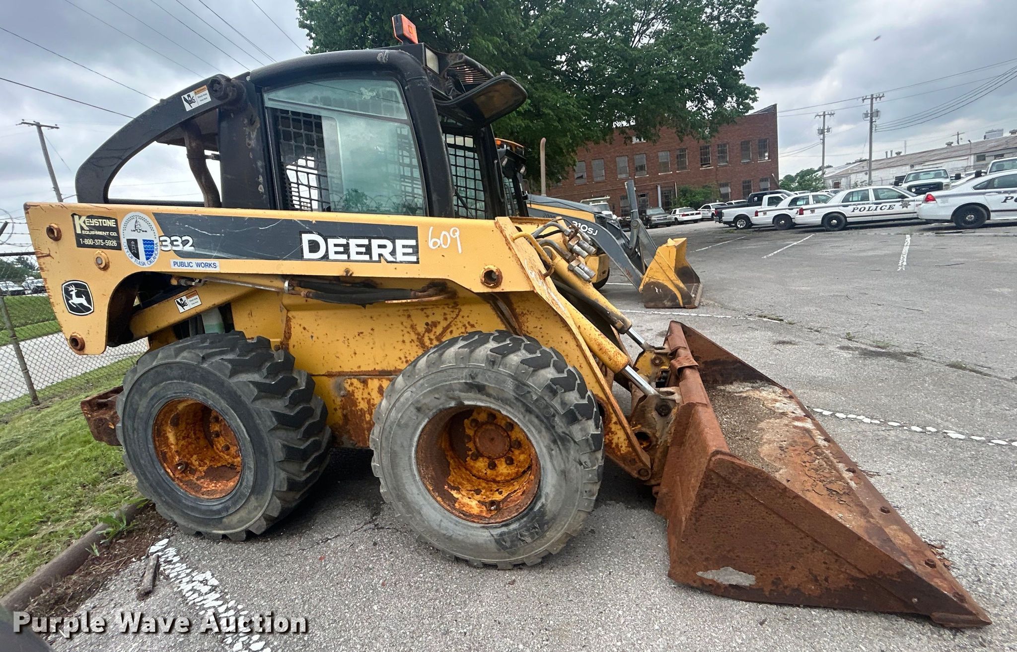 Purple Wave is selling a used Skid Steer Loader in Oklahoma. This item is a John Deere 332 skid steer loader with the following: Hours: Unknown, Serial: T00332E106328, Unit #: 609