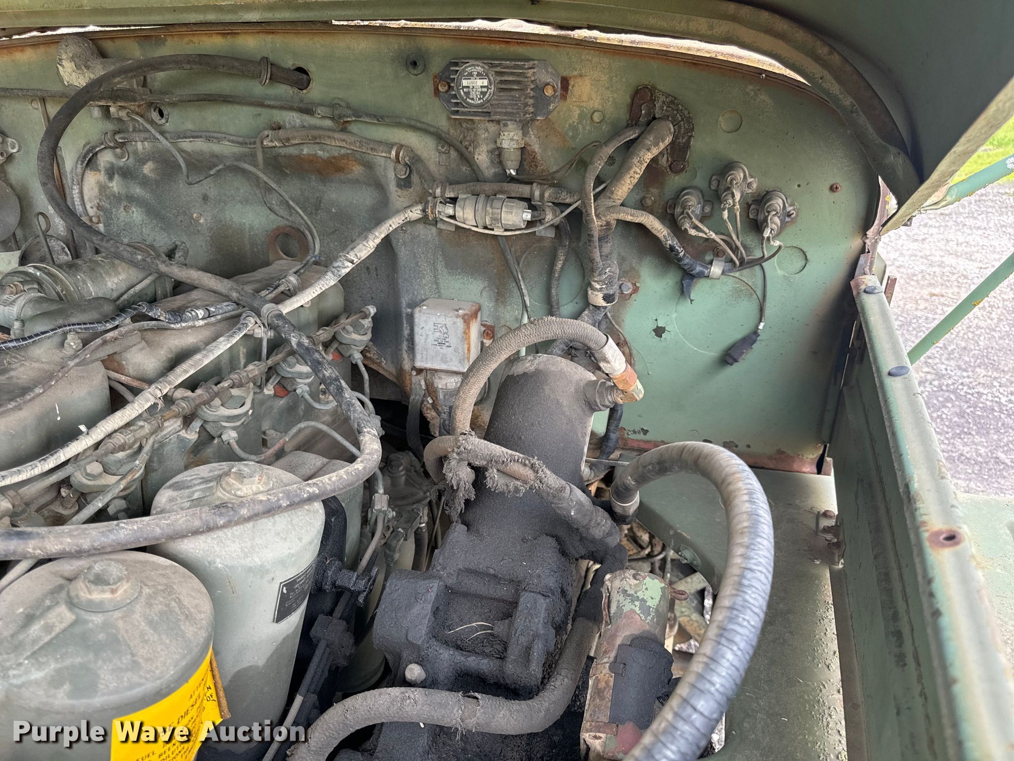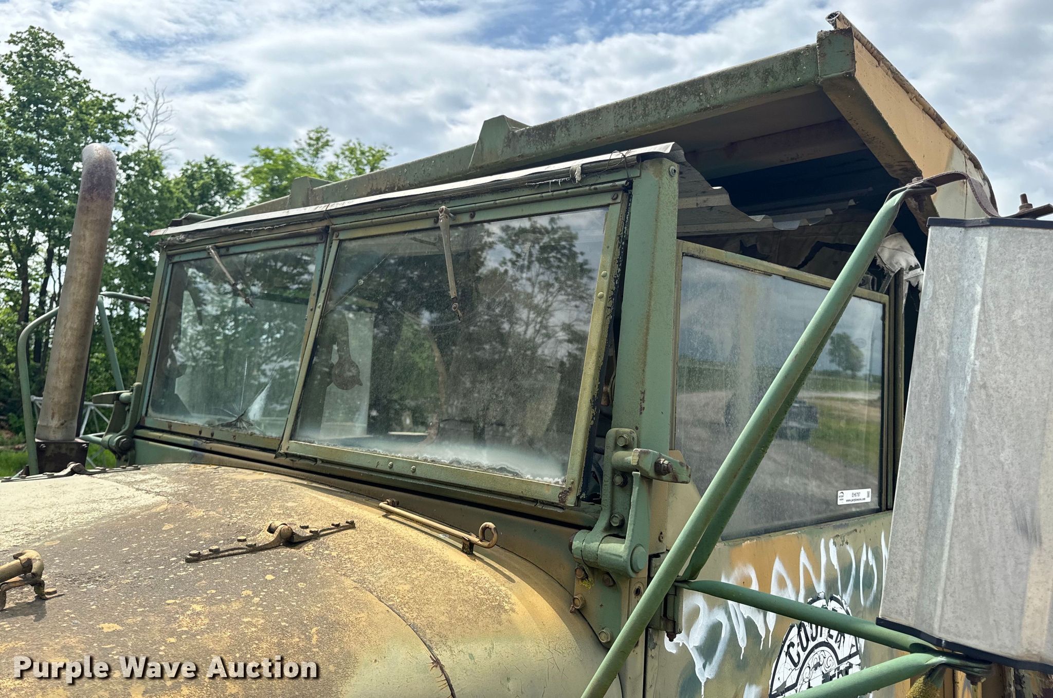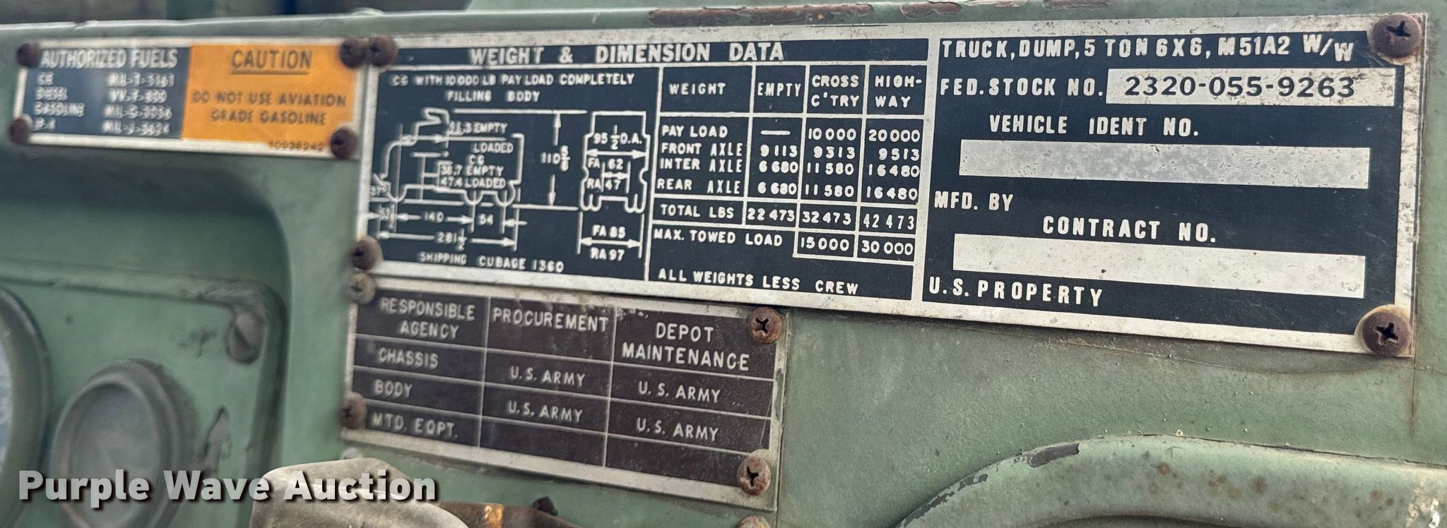 M51A2 dump truck. Miles: 27,720 on odometer, Hours: 839 on meter. Engine Continental Motors Corp. LDS-465-1A, Cylinders: 6, Fuel type: Diesel. Transmission Manual. Chassis Axles: Tandem, Suspension: Spring, Brakes: Hydraulic. Features Dump bed 10' 5" L x 96" W, Side height: 24", Side board height: 10", Bed type: Steel, Ram: Single, End gate: Manual. Tires Front: 11.00R20, Rear: 11-24.5. Notes Windshield chipped or cracked, Dead battery, Fuel injection pump issues, Unit must be towed or hauled, Non-operational unit. Transfer of ownership documentation will be a bill of sale. Cooper County, MO. Boonville, MO 65233
