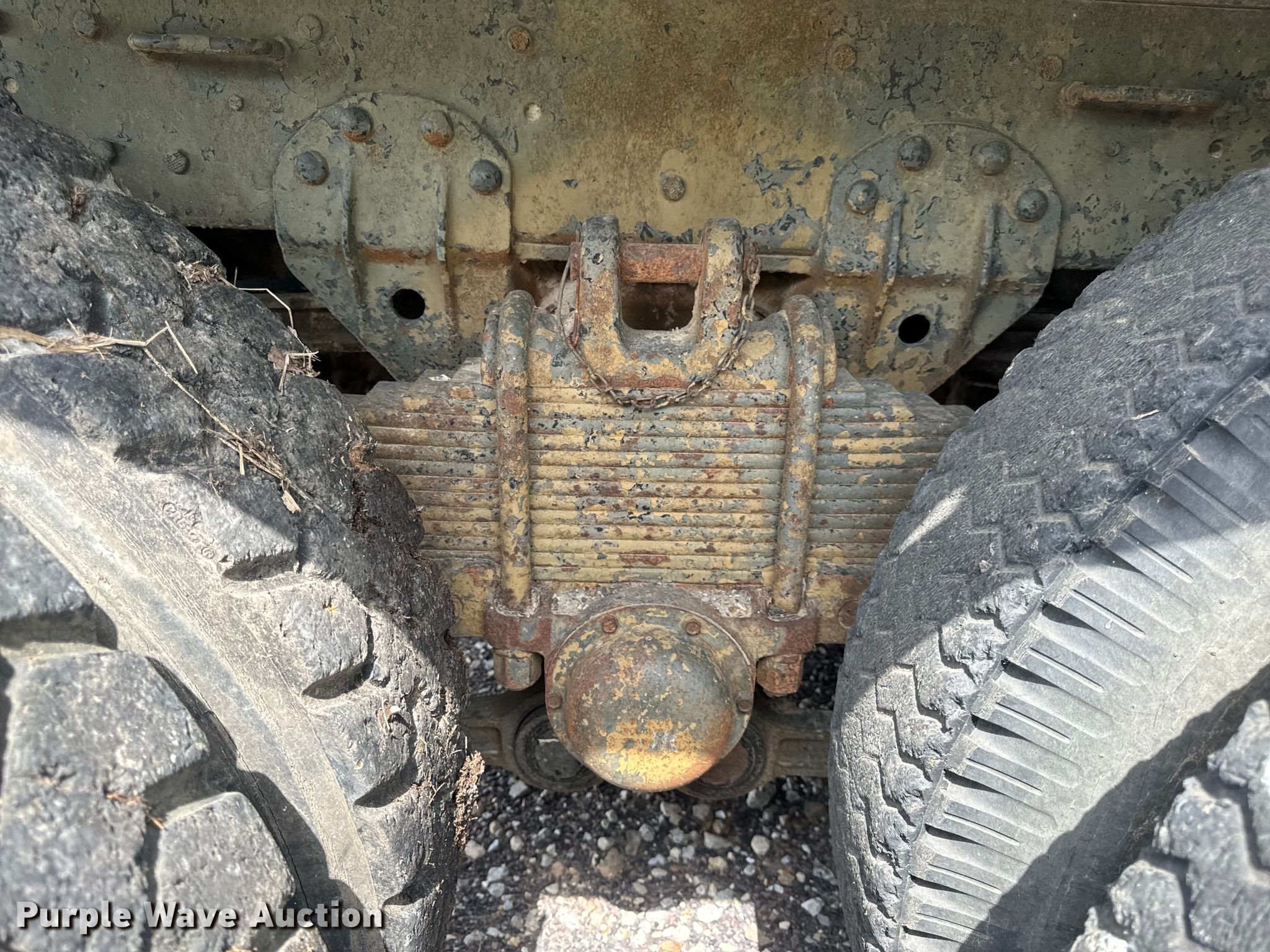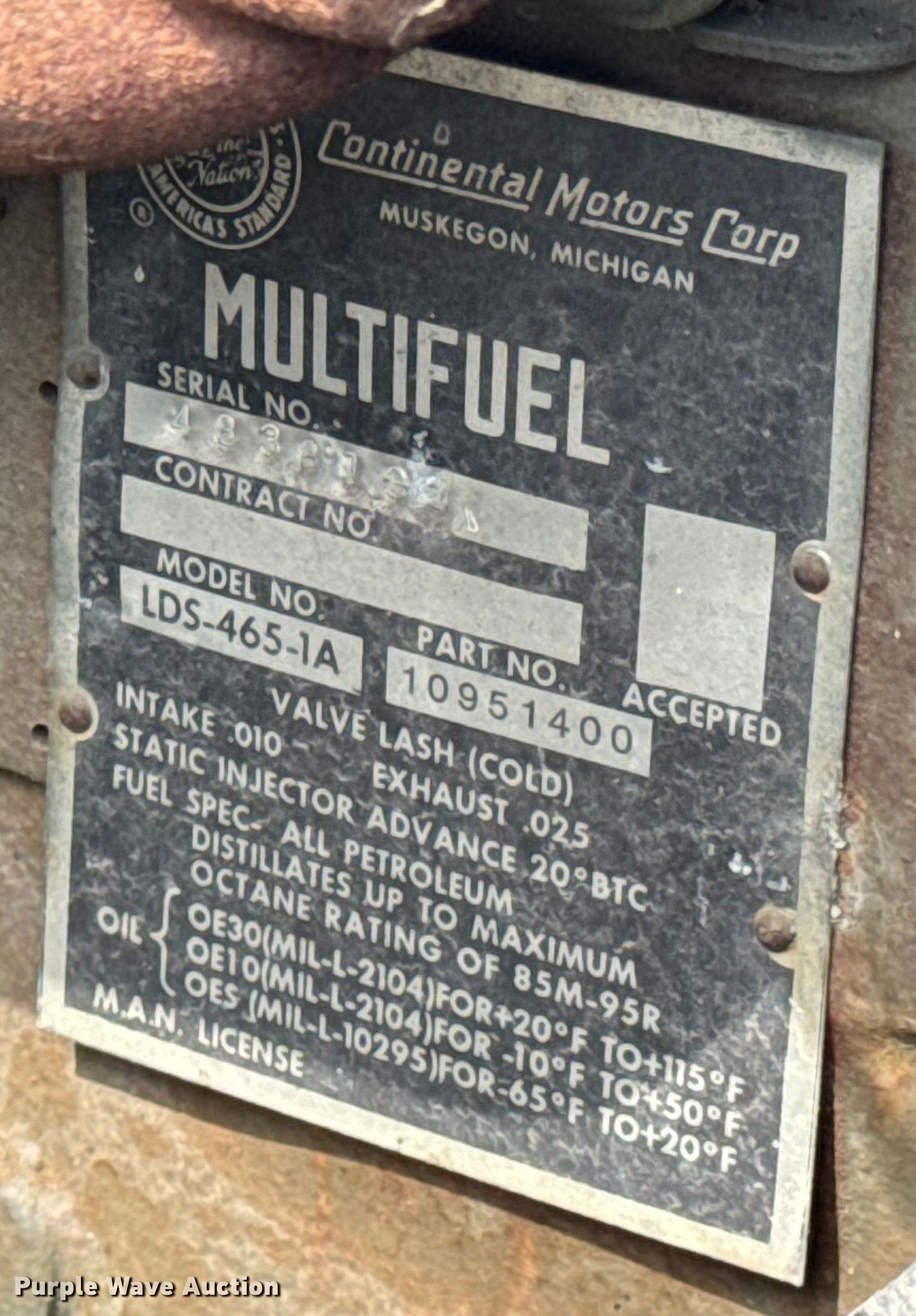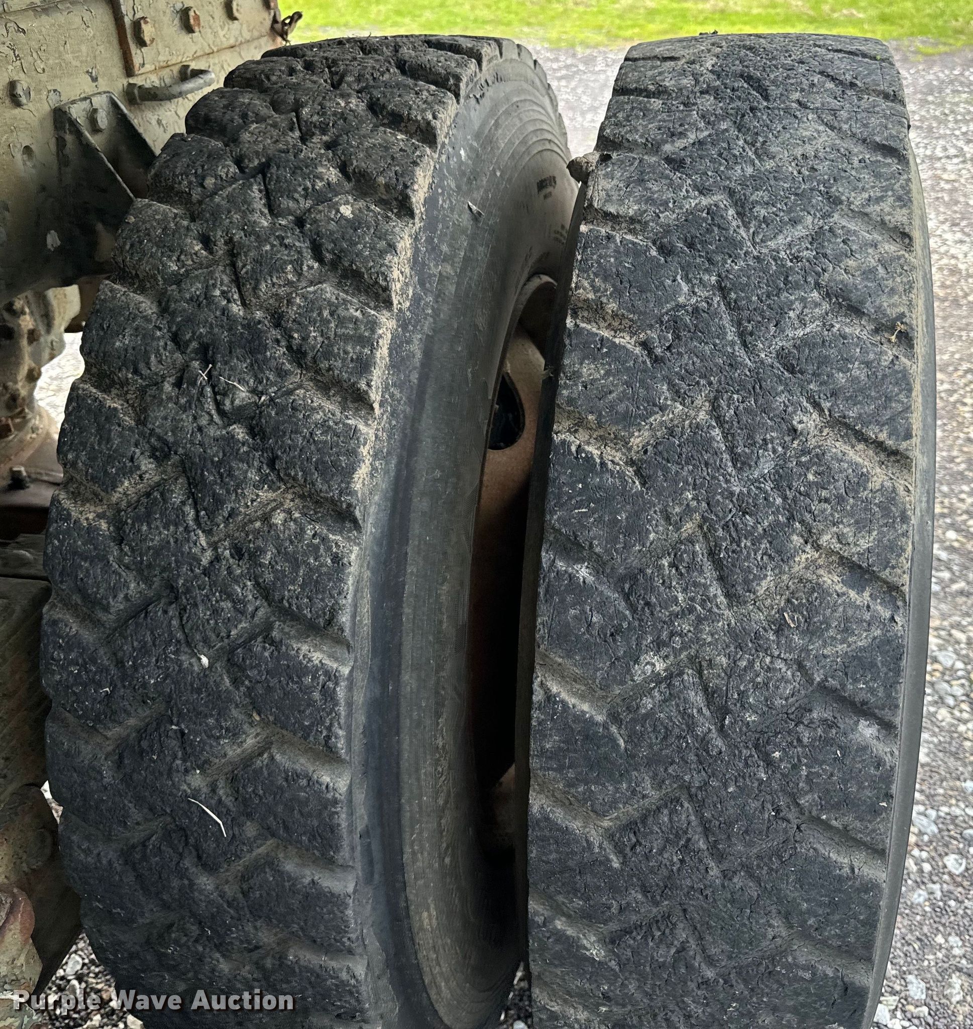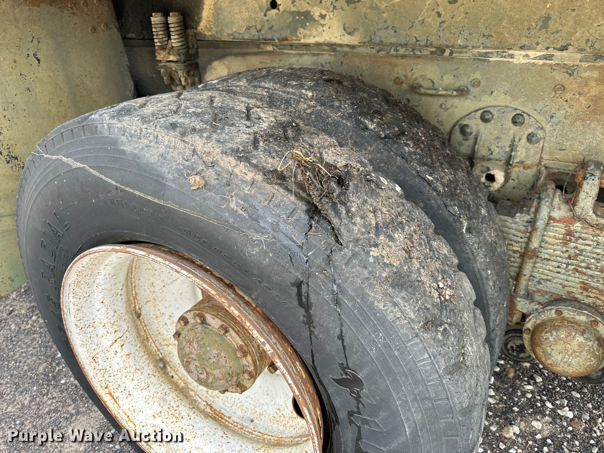 M51A2 dump truck. Miles: 27,720 on odometer, Hours: 839 on meter. Engine Continental Motors Corp. LDS-465-1A, Cylinders: 6, Fuel type: Diesel. Transmission Manual. Chassis Axles: Tandem, Suspension: Spring, Brakes: Hydraulic. Features Dump bed 10' 5" L x 96" W, Side height: 24", Side board height: 10", Bed type: Steel, Ram: Single, End gate: Manual. Tires Front: 11.00R20, Rear: 11-24.5. Notes Windshield chipped or cracked, Dead battery, Fuel injection pump issues, Unit must be towed or hauled, Non-operational unit. Transfer of ownership documentation will be a bill of sale. Cooper County, MO. Boonville, MO 65233