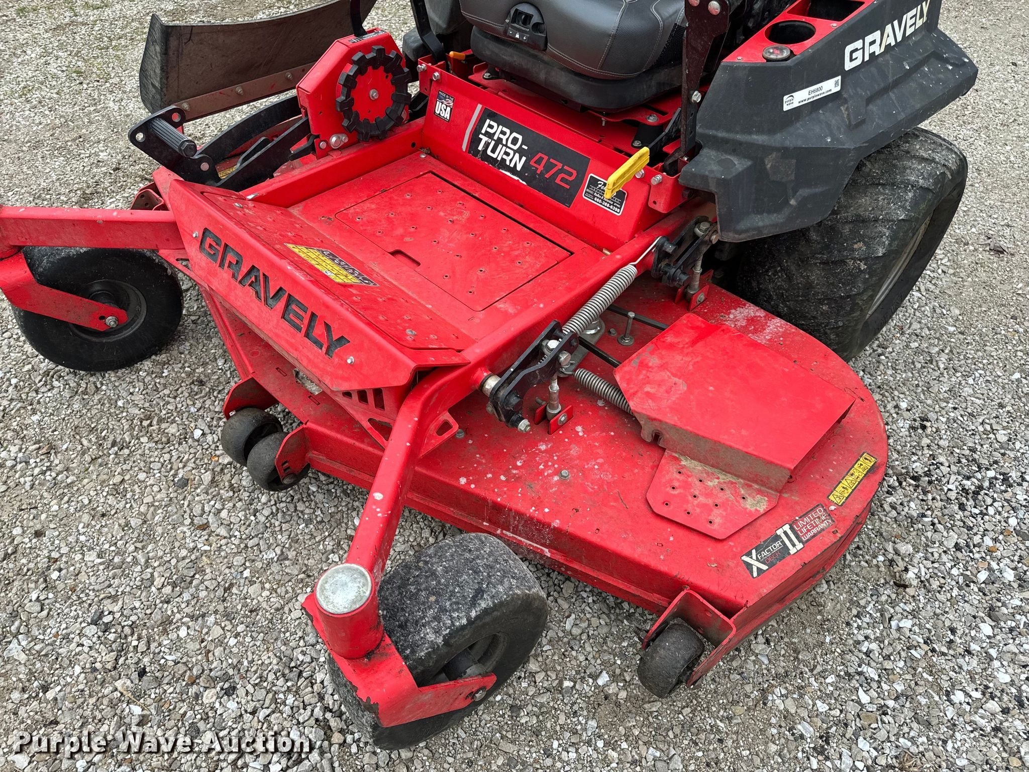 Purple Wave is selling a used Commercial Turf Mower in Missouri. This item is a 2019 Gravely Pro-Turn 472 ZTR lawn mower with the following: Hours: 938 on meter, Cutting width: 72", Serial: 080012