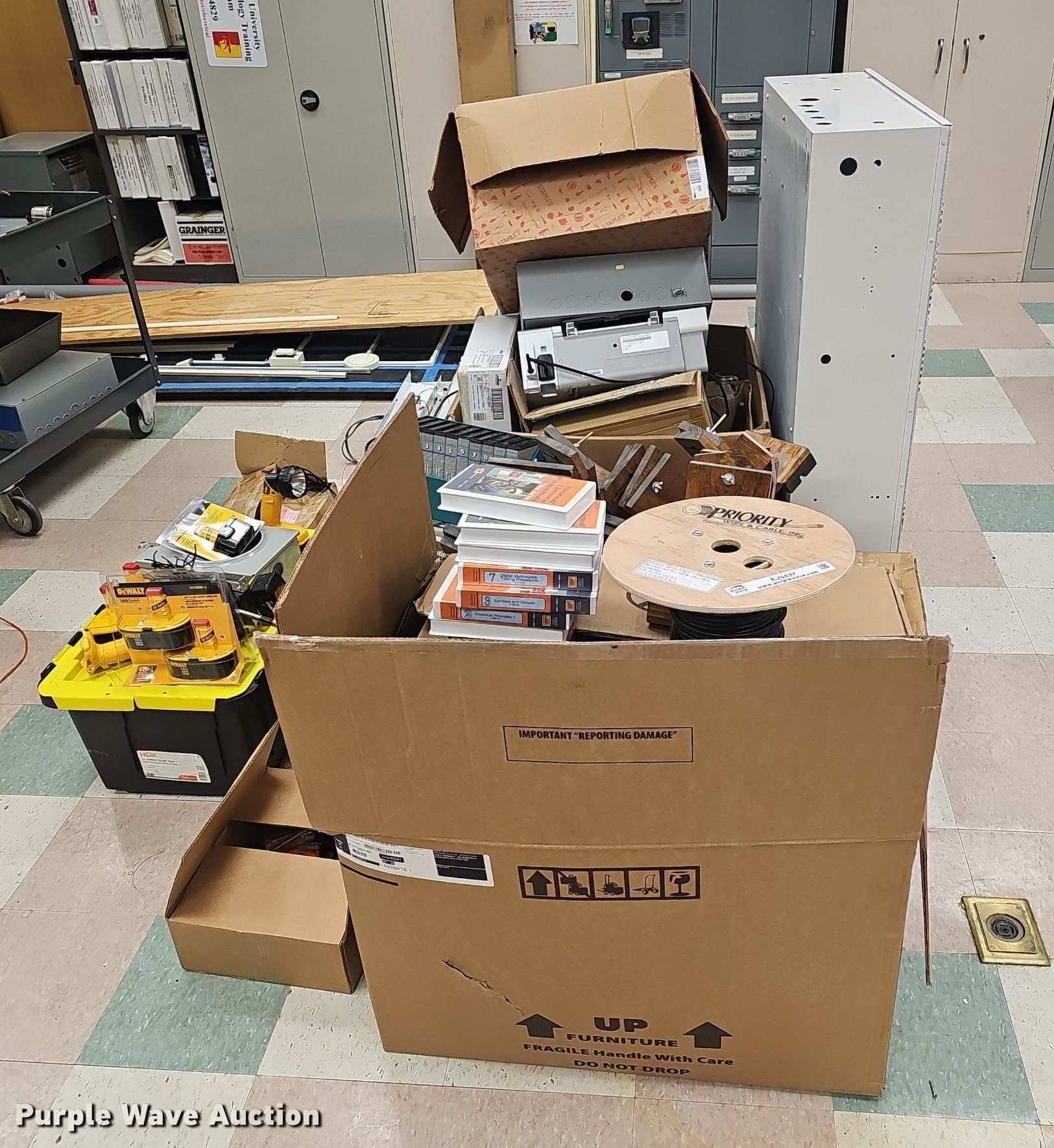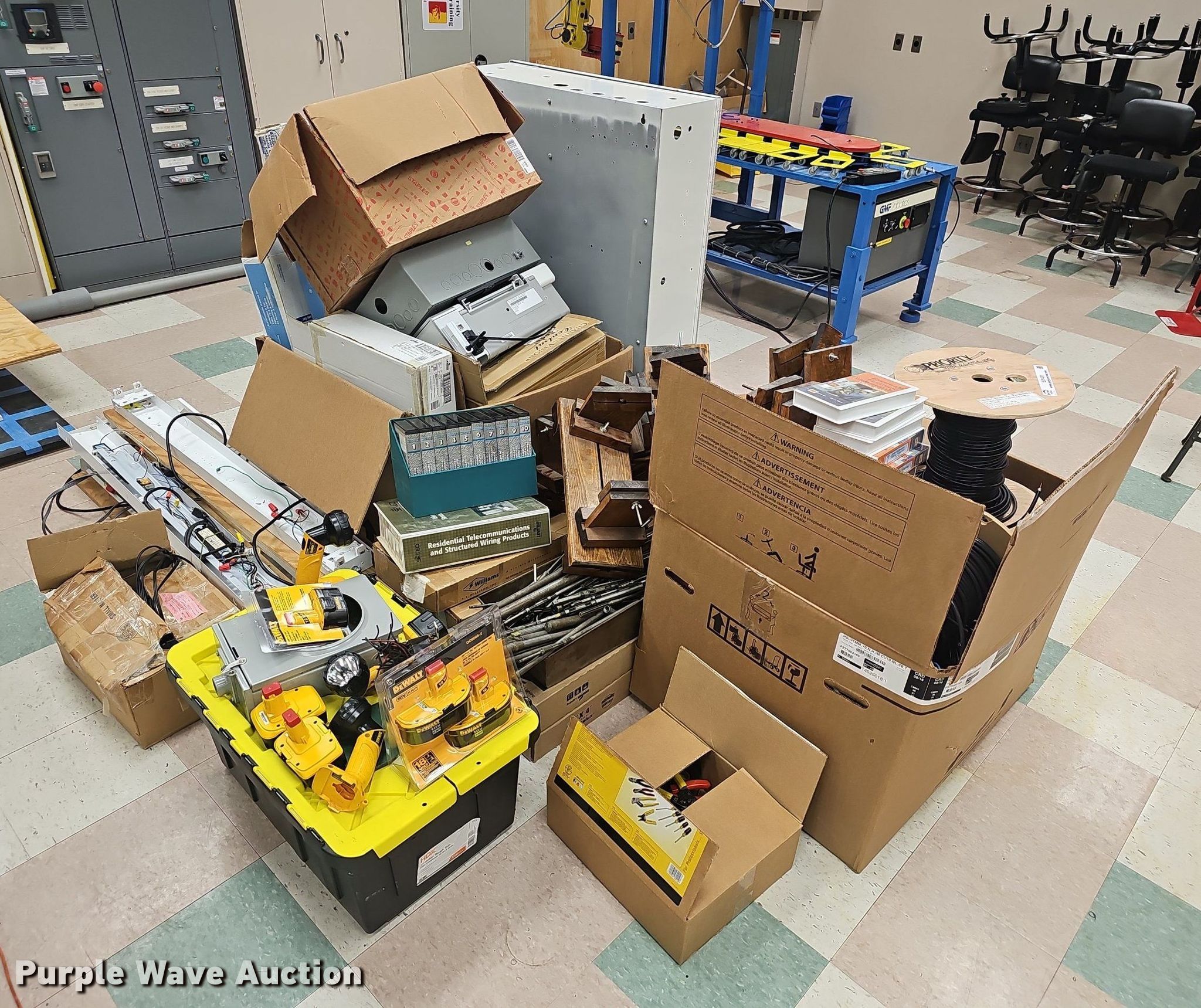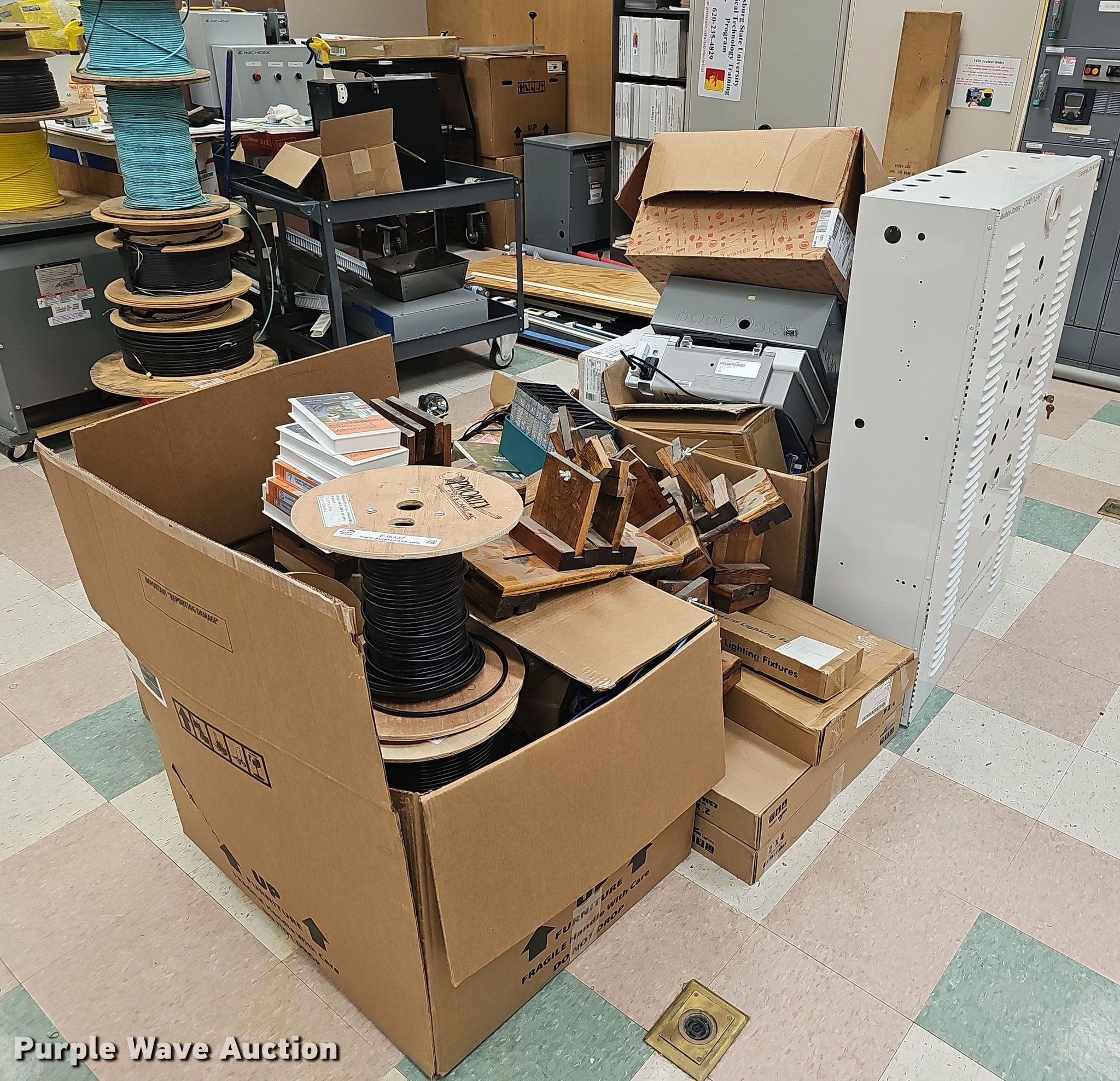 Purple Wave is selling a used Electronics in Kansas. This item is a Electronics with the following: Batteries, Wire, VHS tapes, Wood vise, Lights, Electric panel
